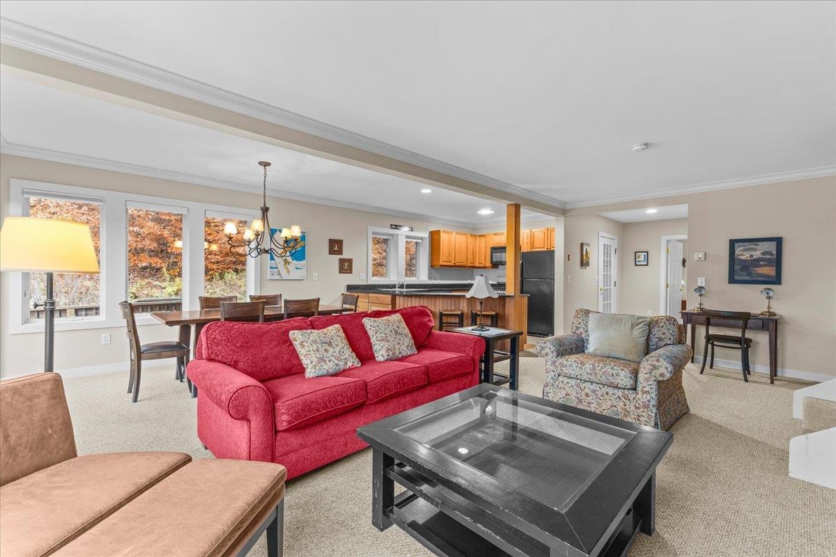 Nestled along Stowe’s renowned Topnotch Resort, this 2, 850 sqft condominium offers a harmonious blend of luxury, practicality, and outdoor spaces. Built in 2004, the spacious 3 bedroom, 4 bath residence boasts contemporary design with a touch of Vermont charm, creating a warm and inviting atmosphere suitable for a lucrative vacation rental or a personal escape. The residence's heart is its privacy, with a sun-filled deck and wrap-around patio, framed by mountain views and mature forest. Upon entering, you'll find a generously sized mud room, ensuring a seamless and organized transition between the outdoors and indoors. The expansive open-plan kitchen, dining, and living room has western mountain exposure, filling the space with natural light and scenic beauty. A private, first-floor guest suite with an ensuite bath provides comfort and convenience for visitors. Upstairs, the spacious primary suite features a gas fireplace and a large soaking tub, while a second ensuite bedroom offers peaceful views of the surrounding forest. Central AC ensures year-round comfort. Downstairs, discover an oversized TV/game room, perfect for unwinding after hitting the slopes. Ideally located between the Village of Stowe and the skiing of Mount Mansfield and Spruce Peak, this turnkey property offers Stowe's most cherished amenities at your doorstep.