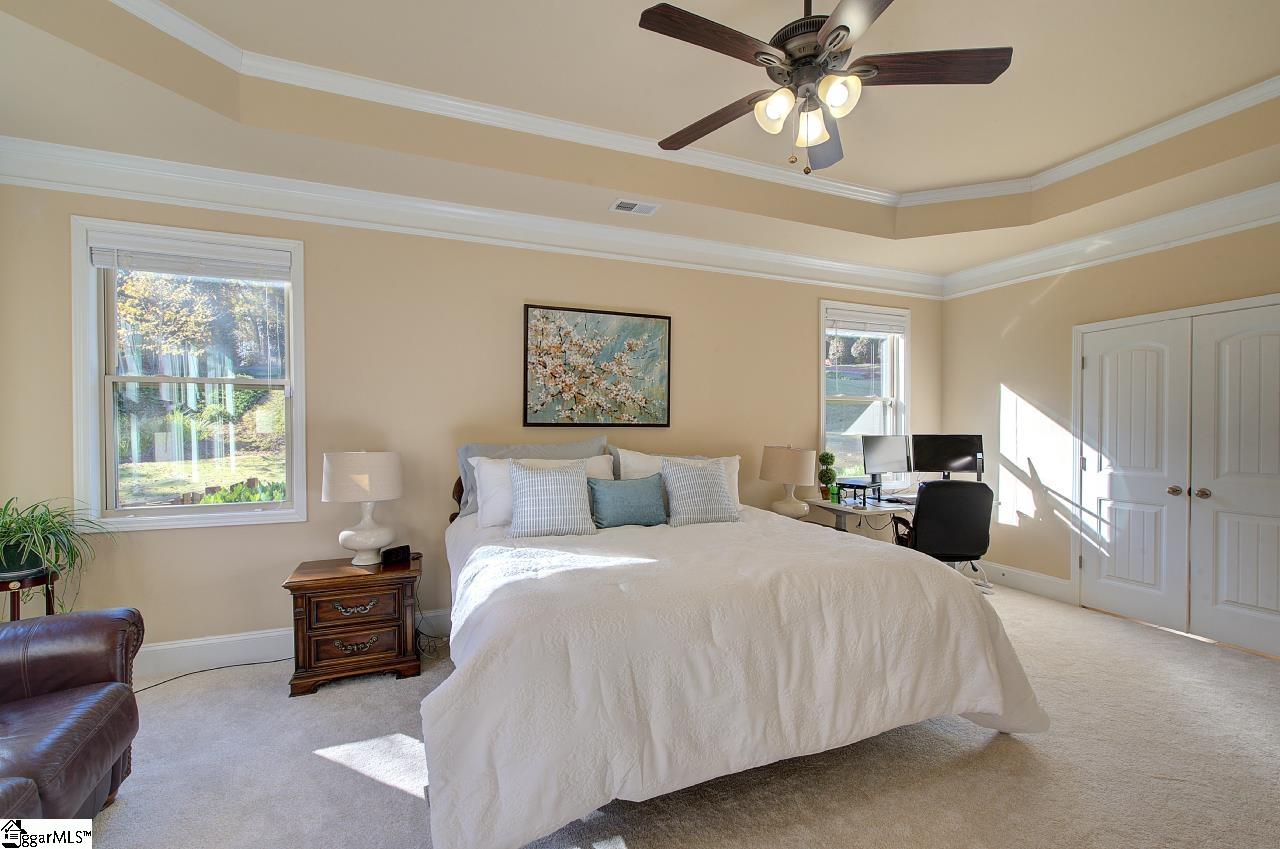 Tucked away on a quiet cul-de-sac in the highly sought-after Ridgewood Plantation neighborhood, this beautiful 3-bedroom, 2. 5-bath, single-story home sits on a large, private lot with woods, offering the perfect blend of comfort, space, and style - all just minutes from I-85 for an easy commute. From the moment you step inside, you’ll notice the abundance of natural light and thoughtful architectural details that make this home truly special. The welcoming foyer features wainscoting and a tray ceiling, leading into a spacious dining room with a stunning coffered ceiling - ideal for gatherings and celebrations. The open-concept living area is warm and inviting, highlighted by vaulted ceilings, built-in bookshelves, and a cozy gas fireplace with stone surround. The living room flows seamlessly into the kitchen, featuring an oversized granite island, gas range with double oven (including convection), stainless steel GE appliances, under-cabinet lighting, and a tile backsplash - a true chef’s space. A bright breakfast nook opens to the covered back porch and patio with hot tub, perfect for casual meals and entertaining. Enjoy the privacy of a split floor plan, with two bedrooms sharing a convenient Jack-and-Jill and the primary suite tucked away for quiet relaxation. All bedrooms have brand-new carpet. The primary suite includes a large walk-in closet, dual sink vanities, a soaking tub, and a separate shower. Step outside to unwind or entertain on the expansive covered porch with dual ceiling fans, a fully fenced yard with additional land beyond, and a private wooded backdrop - plenty of space to enjoy outdoor living. Additional highlights include access to community amenities such as the pool and clubhouse, a brand-new 2025 water heater, a two-car attached garage and zoned for the highly rated Wren schools. Discover the perfect balance of comfort, privacy and convenient location between Greenville and Clemson at 155 Burberry Drive - a place you’ll love to call home.