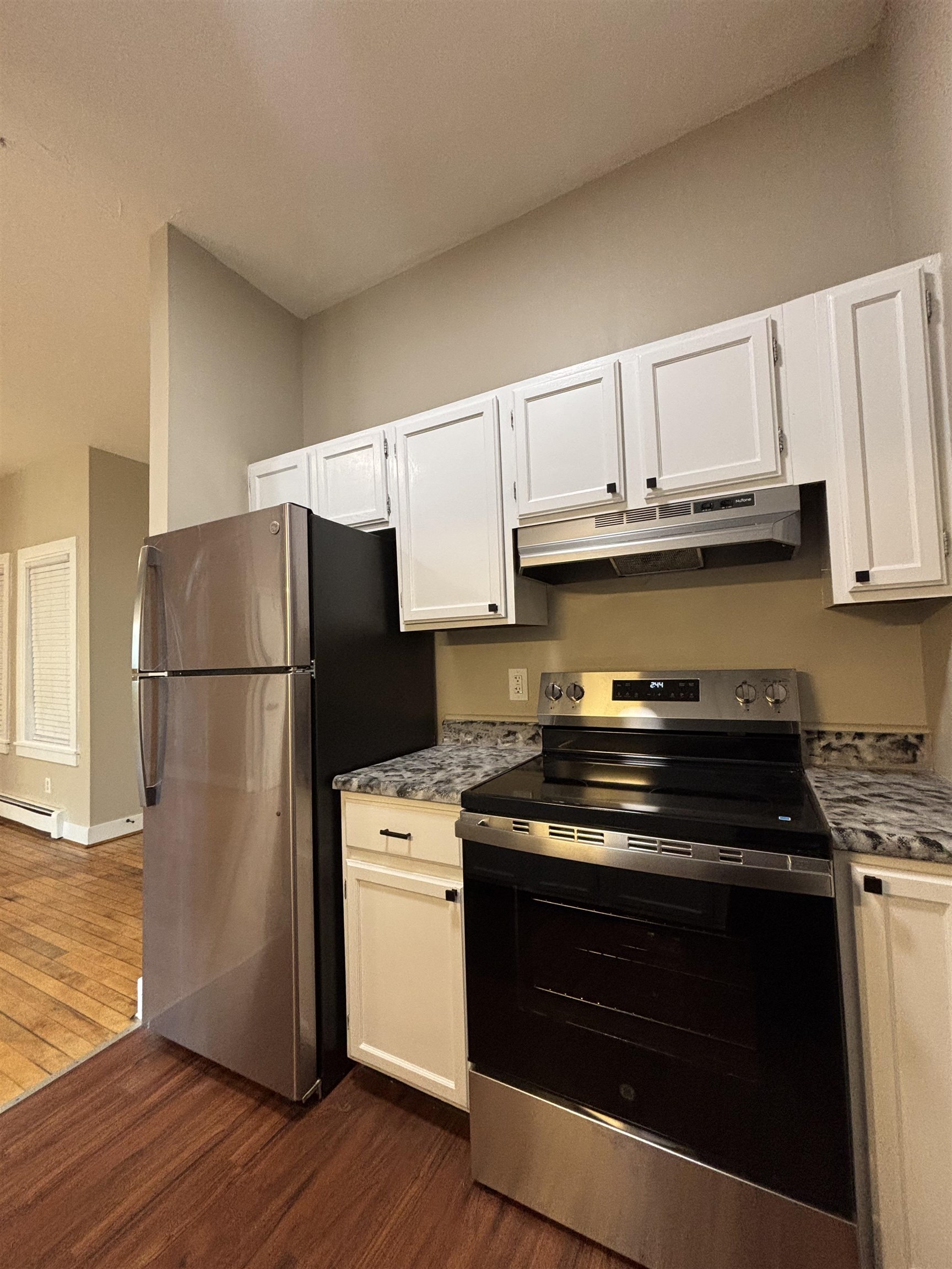 Building is UNDER NEW MANAGEMENT!! Features included an updated Kitchen with brand new stainless steel appliances & new vanity, medicine cabinet, toilet and new flooring in the bathroom. Approximately 900 sqft garden style 2 bedroom apartment. Newly installed matching matte black fixtures, door knobs, and hardware. This unit is spacious and perfect for individuals seeking a low-maintenance, comfortable living space. Front facing end unit with plenty of natural light, an open conccept floor plan, with a well-equipped kitchenette, full bathroom to create a functional layout. The apartment building includes on-site "coin-op" laundry, off-street parking. A convenient location and professionally managed building near local shops, restaurants, and other amenities. A one-year lease is required, along with a security deposit and application screening.