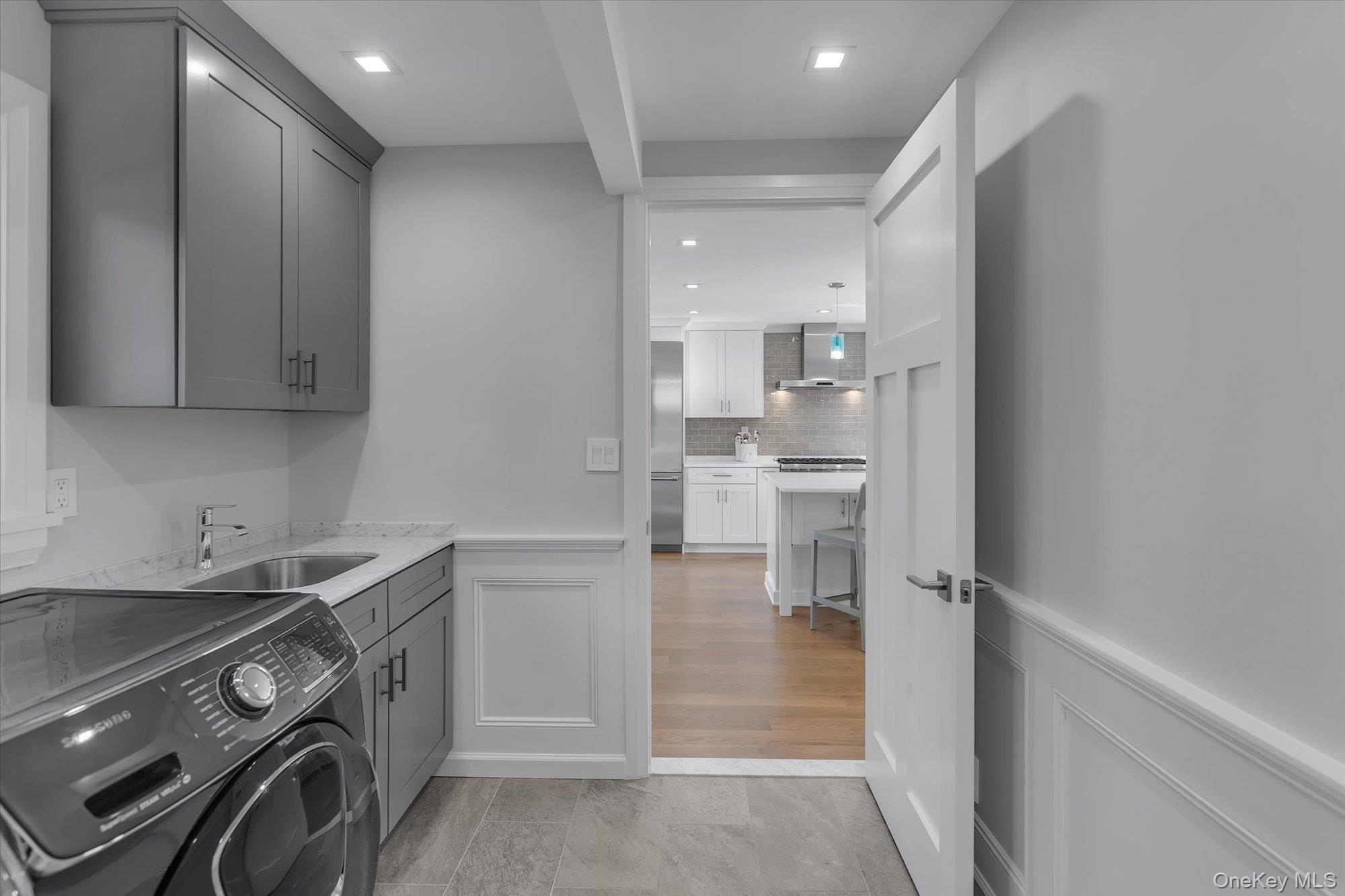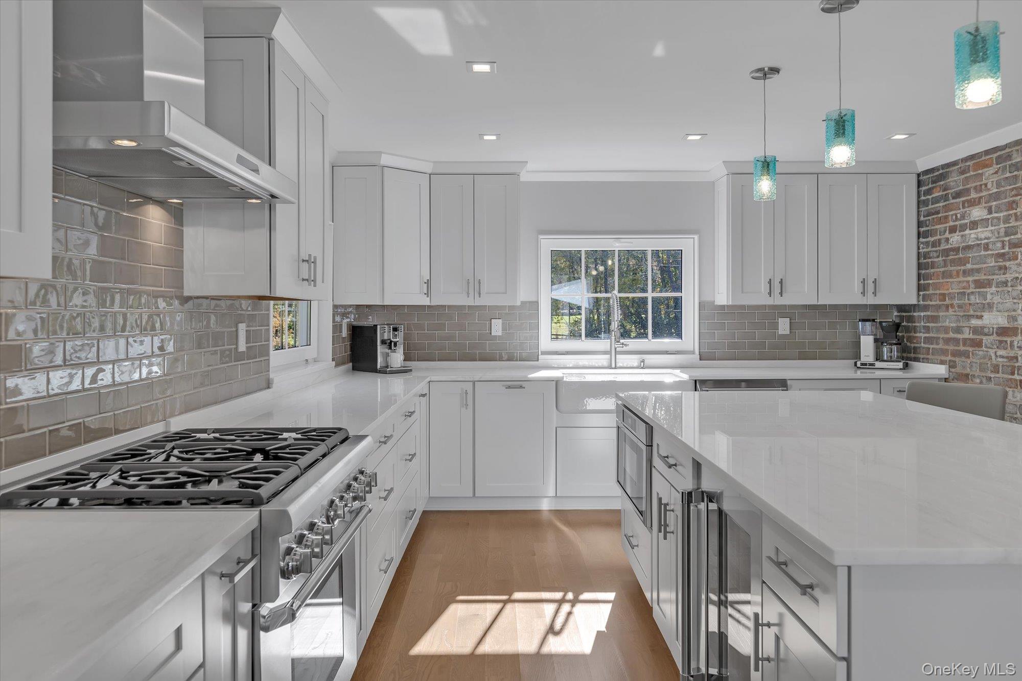 A seamless blend of timeless charm and modern sophistication, this beautifully renovated residence offers a curated living experience in one of Centerport, Harborfields School District. From its refined millwork to its designer finishes, every detail reflects thoughtful craftsmanship and a graceful sense of style. Upon entry, a welcoming foyer with 10-foot ceilings and elegant crown moldings sets the tone. Sunlight pours through oversized windows in the formal living room, while a dedicated home office or den with custom built-ins opens to a private front patio—an ideal retreat for work or quiet relaxation. The formal dining room, centered by a gas fireplace, provides an intimate yet airy setting for gatherings, flowing effortlessly into the showpiece kitchen. The kitchen has been fully renovated with marble countertops, custom cabinetry, stainless steel appliances, a farmhouse sink, and exposed brick accents that lend warmth and character. A sliding glass door invites easy transition to the paver patio and backyard—perfect for dining, lounging, and entertaining. A mudroom and powder room with laundry are conveniently situated off the kitchen, creating functional ease for daily living. Upstairs, the spacious primary suite is a serene sanctuary, featuring a walk-in closet and a spa-inspired ensuite bath with a double vanity, soaking tub, and glass-enclosed shower. Two additional bedrooms offer generous proportions, large closets, and refined trim details, accompanied by two beautifully appointed guest baths. The finished third level extends the home’s versatility, ideal for a fourth bedroom, recreation or media space, with additional storage. The lower level is a partial, unfinished basement where the mechanicals are neatly accessible. Outside, mature landscaping, multiple patio areas and room for a pool provide a tranquil, polished backdrop for everyday enjoyment. Additional highlights include central air conditioning, gas heat, recessed lighting throughout, and hardwood flooring across the main living spaces—all combining to deliver a turnkey, elegantly livable experience in the heart of Centerport. *Office & Dining room photos are virtually staged.