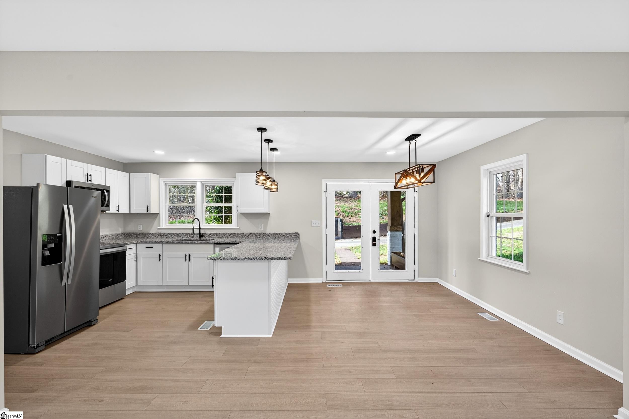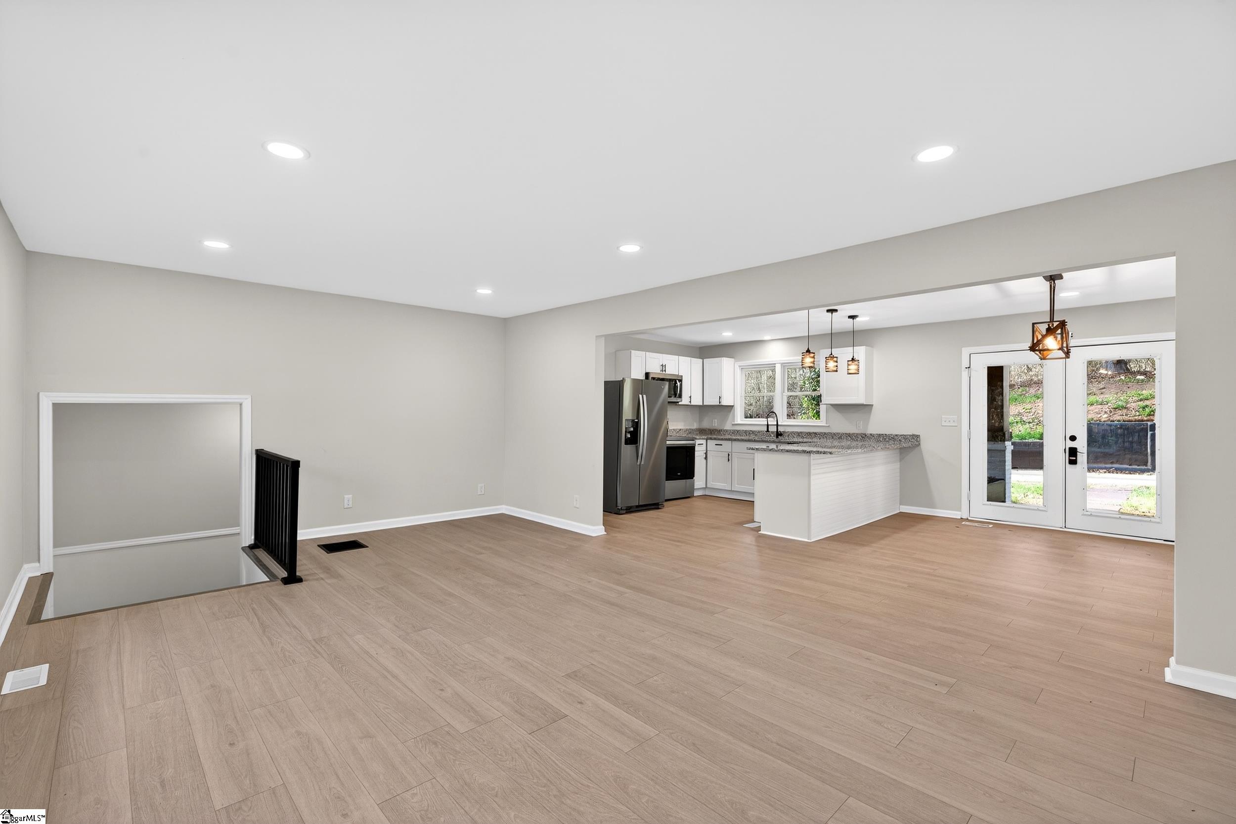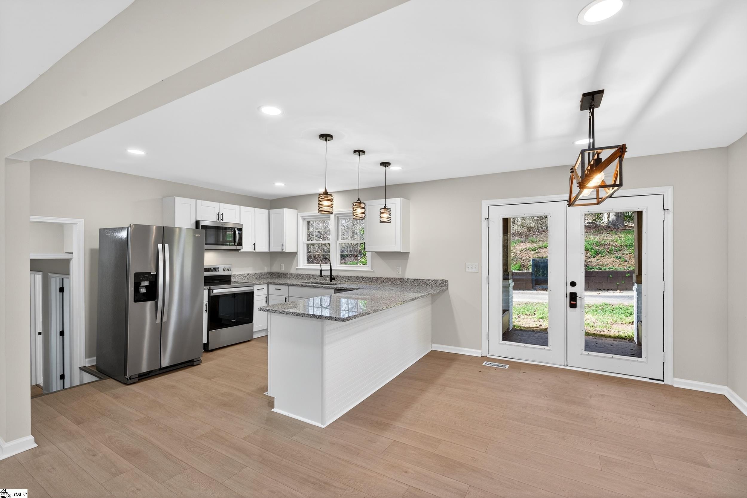 SPACE FOR EVERYONE AND HUGE DETACHED SHOP WITH NO HOA! Experience the perfect blend of space and style in this fully remodeled split-level home, offering over 2, 200 square feet of modern living in a quiet Spartanburg neighborhood with no HOA. The main level welcomes you with an open layout connecting the kitchen, dining, and living areas. Perfect for entertaining or everyday living. The kitchen features granite countertops, stainless steel appliances, shaker cabinetry, and a large peninsula surrounded by natural light. Upstairs, you’ll find three comfortable bedrooms and a beautifully renovated full bathroom with premium tile, backlit mirrors, and modern fixtures. Downstairs, a spacious den provides the perfect flex area for a media room, home office, or guest space accompanied by the fourth bedroom and a second fully updated bathroom with premium tile, plus a large laundry and storage room. Outside, enjoy a relaxed private setting with mature trees, a fire pit area, and an impressive detached workshop and garage totaling over 1, 000 square feet with electricity, plumbing, and multiple garage doors. The attached two-car garage, dual driveways, and extra gravel parking make hosting, storage and access easy. Freshly renovated painted inside and out, this move-in-ready home combines comfort, convenience, and style just minutes from downtown Spartanburg, I-85, shopping, and local parks. Schedule your tour today!