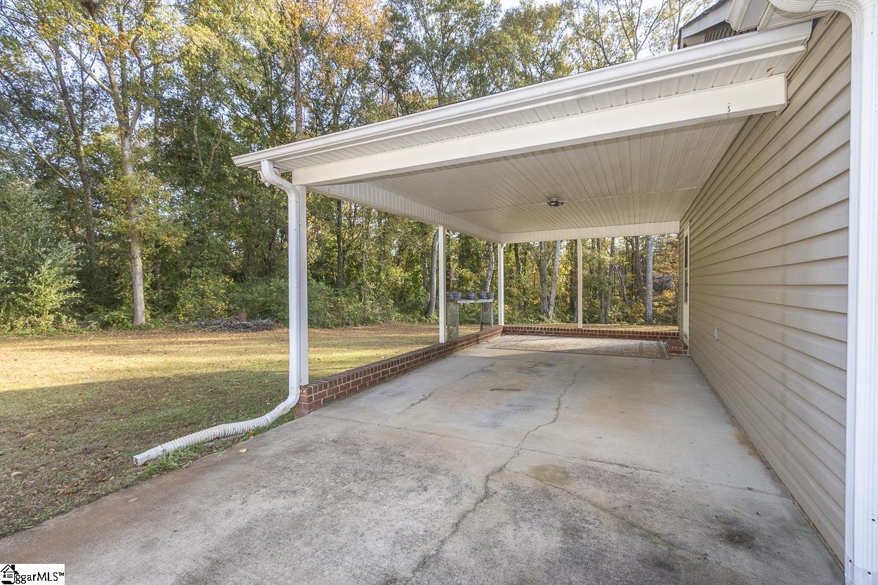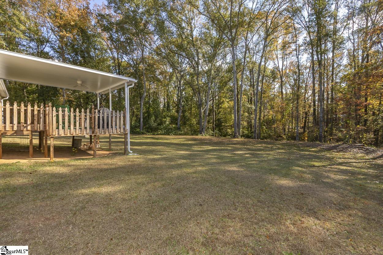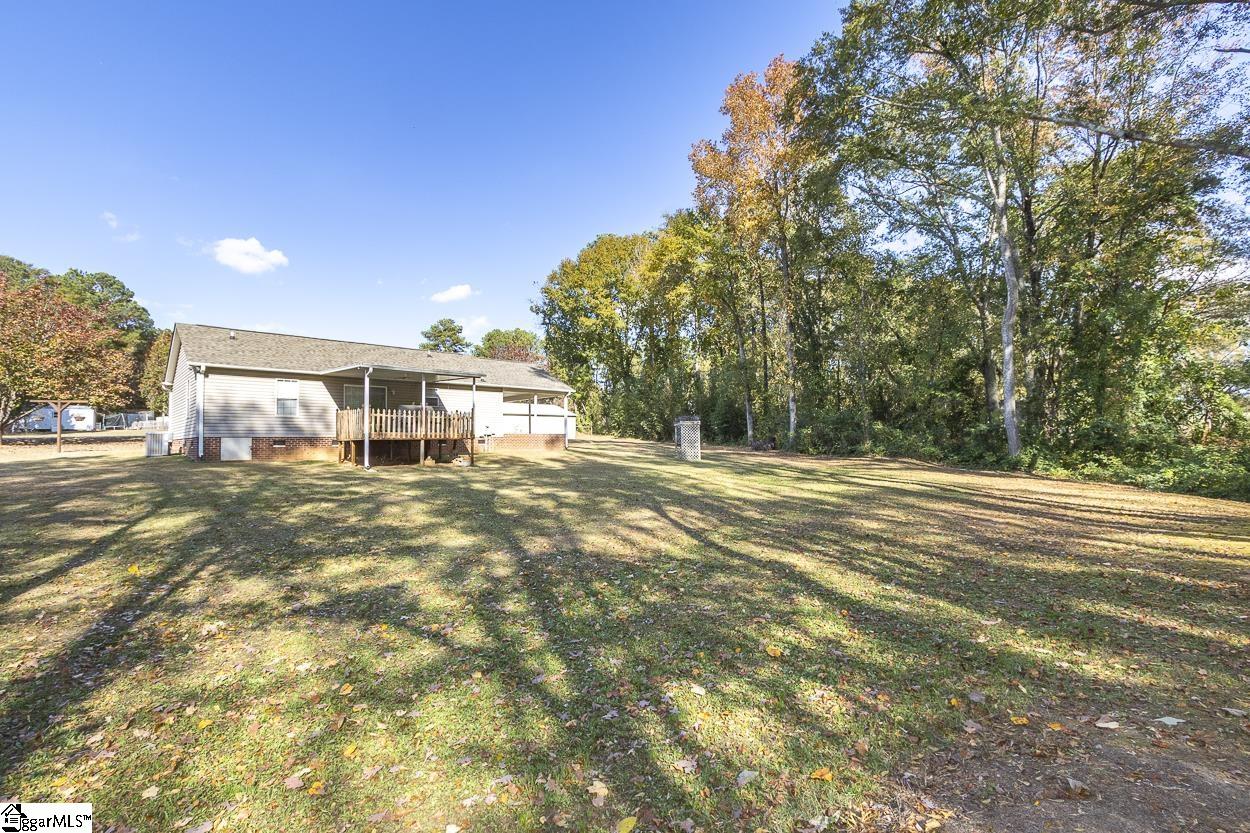 Property location qualifies for 100% USDA Rural Housing Loan financing. Single level home with no HOA nor fees and situated within a wooded and established neighborhood. Easy to maintain exerior finishes of vinyl and brick with mature landscaping. Covered parking is a combination of attached carport and detached garage. Detached building at ~600' and is finished with concrete flooring and electricity; perfect for a workshop or storage. At almost 1 acre lot the WOW is when you walk to backyard. Serene is the word with the expanse of the open grassed area, grand trees, a natural area down to the creek. Entry to the home brings you to the living room and is open to the eat in / dining area. Galley style kitchen where all appliances remain and extra storage shelved pantry. Laundry closet and side entry access door to carport complete this area. Ever popular split bedroom floorplan; with Primary featuring a walk in closet and private bathroom with newer walk in shower. Two secondary bedrooms share a hallway located full bathroom. From dining area one will access the rear covered porch; perfect for grilling and dining. Country setting property is close to south side Anderson shopping, District 3 schools and vast number of employers.