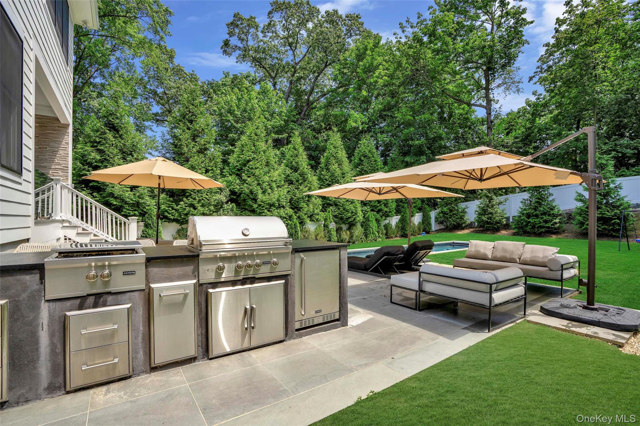 Welcome to 65 Myrtle Boulevard! This fabulous home was custom-built in 2023 by one of Westchester's premier home builders. With 5 bedroom and 5. 1 baths, this very unique home boasts 10 foot first floor ceilings and a bright, sunny foyer. The first floor presents the gourmet kitchen offering a SubZero Refrigerator, Wine Frig, Wolf Range, 2 Bosch Dishwashers, Sharpe Microwave, and large island leading to the office/ pantry. The dining area, living/family room with gas fireplace and powder room with radiant heated floor complete the first floor. Step outside to the covered porch with wood-burning fireplace, ceiling fan and heater. The 2nd floor provides a large, bright primary bedroom with a huge walk-in closet furnished with an island and dresser drawers, a second large closet, and a wonderful study with custom built-ins and fireplace. The beautiful ensuite bath has a free-standing jacuzzi tub, large shower and radiant heated floor. There are 3 more ample bedrooms on the second floor each offering ensuite baths with radiant heat, and a laundry room with 2 washers and 2 dryers. The inviting finished basement offers recessed lighting, a large playroom, a gym/yoga studio with heated air blower, a steam room, a dry bar with refrigerator and a bedroom with radiant heated bath. Enjoy the spectacular fenced backyard with outdoor speakers. The huge patio with porcelain tile has a large built-in barbecue grill and a full outdoor kitchen. The magnificent heated pool sports a jacuzzi and an automatic cover. The backyard is perfect for playing, swimming, entertaining or just relaxing! This unique, outstanding smart home features wonderful large windows for maximum light, a Lutron shade system and lighting controlled by your smart phone, 3 fireplaces, wireless speakers throughout, 4 AC and heating zones, Nest thermostats, generator ready, 400 amp electrical service and a large 2-car garage leading to the mudroom. Located close to the train, Larchmont restaurants, shops, schools, playgrounds and the Saturday Farmer's Market, this magnificent new home offers everything one could desire!