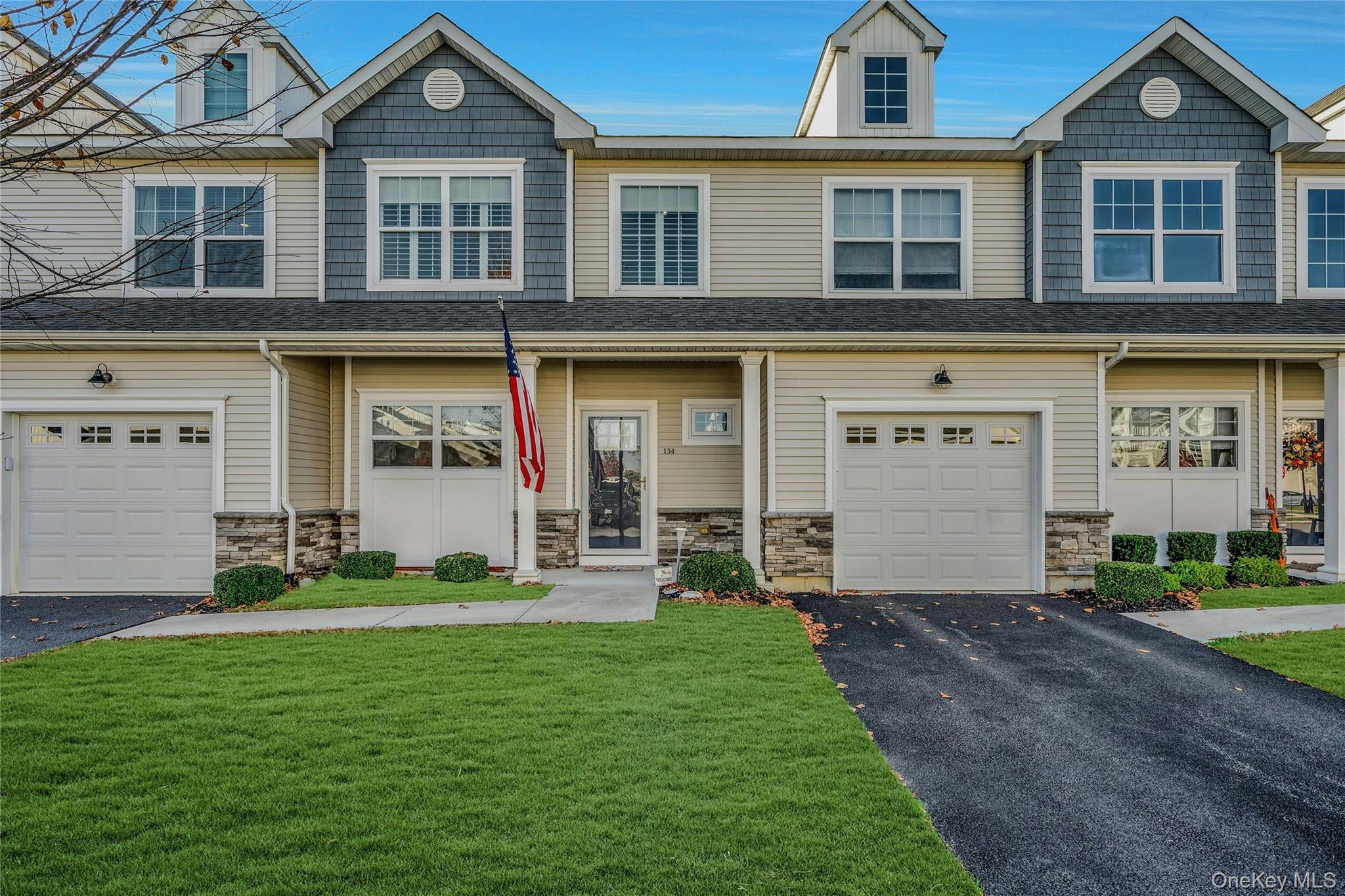 Welcome to 134 Halley Drive located in beautiful Vineyards at Brookfield Center Moriches. A peaceful 55+ development with impeccable landscaping, a refreshing community pool and a classy club house that brings the community together with endless activities. Aside from its own private driveway leading into the 1 car garage, there is plenty of guest parking if you decide to entertain. Enter in to a home that is tastefully decorated with just enough of a touch to give the home warmth. Being sold by the original owners, they chose all B level upgrades when the unit was built, meaning there is nothing standard in this home. A fabulous open floor plan… the kitchen has a large center island. All counters are Lusso Silestone Quarts with a beautiful extended window sill. SS Frigidaire appliances (2021) Dishwasher (2024) Kohler sink, ceramic by Armond flooring and Hunter Douglas wooden shades covering the sunlit windows. High hats already have the converted parts to replace with hanging light fixtures. The kitchen flows into the dining room then into the bright open living room with soaring ceilings 25 ft at the highest points open to the second floor. The upgraded sideline & additional transom windows above the back slider door brings in abundance of nature sunlight yet the room darkening curtains can be drawn for a more relaxed mood. Prior to entering the primary suite, you pass the laundry area with Electrolux washer and dryer and a guest bathroom. The primary suite has a walk-in closet and a large bathroom with a new Ferguson toilet & frameless glass door shower. Head upstairs and over the balcony which overlooks the living room, dining room, and kitchen and where you’ll find 2 additional bedrooms and a full bathroom. There are endless possibilities in the full basement with egress window and high ceilings. The HVAC system was upgraded with a home humidifier. You’ll find extra outlets in the garage. Sterling Cabinets, Kohler Sinks, Silestone Counters, Ceramic by Armond flooring, CAC, the list goes on. Stop in, take a look… it’s a beautiful place to call home.