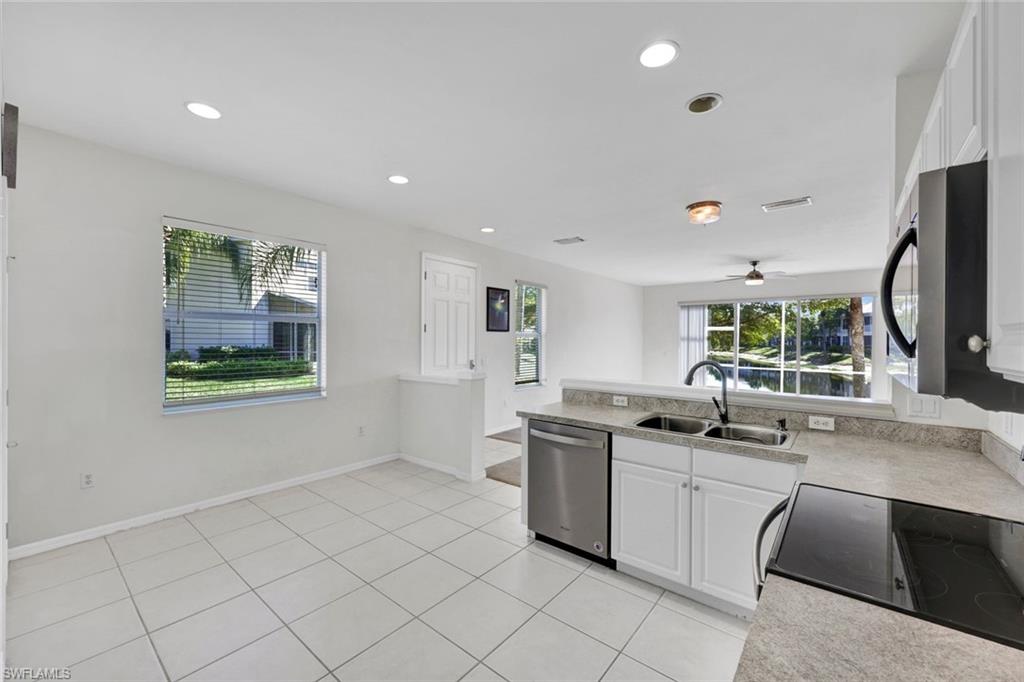 Gorgeous end-unit townhouse in the highly sought-after, quiet, gated community of Stratford Place. ** Enjoy expansive lake views from the screened lanai and an inviting great room filled with natural light thanks to the three-panel sliding doors and desirable southern exposure. The main living area boasts 9 ft. ceilings and flows into a well-appointed kitchen featuring stainless steel appliances. A convenient half bath is located just off the kitchen.