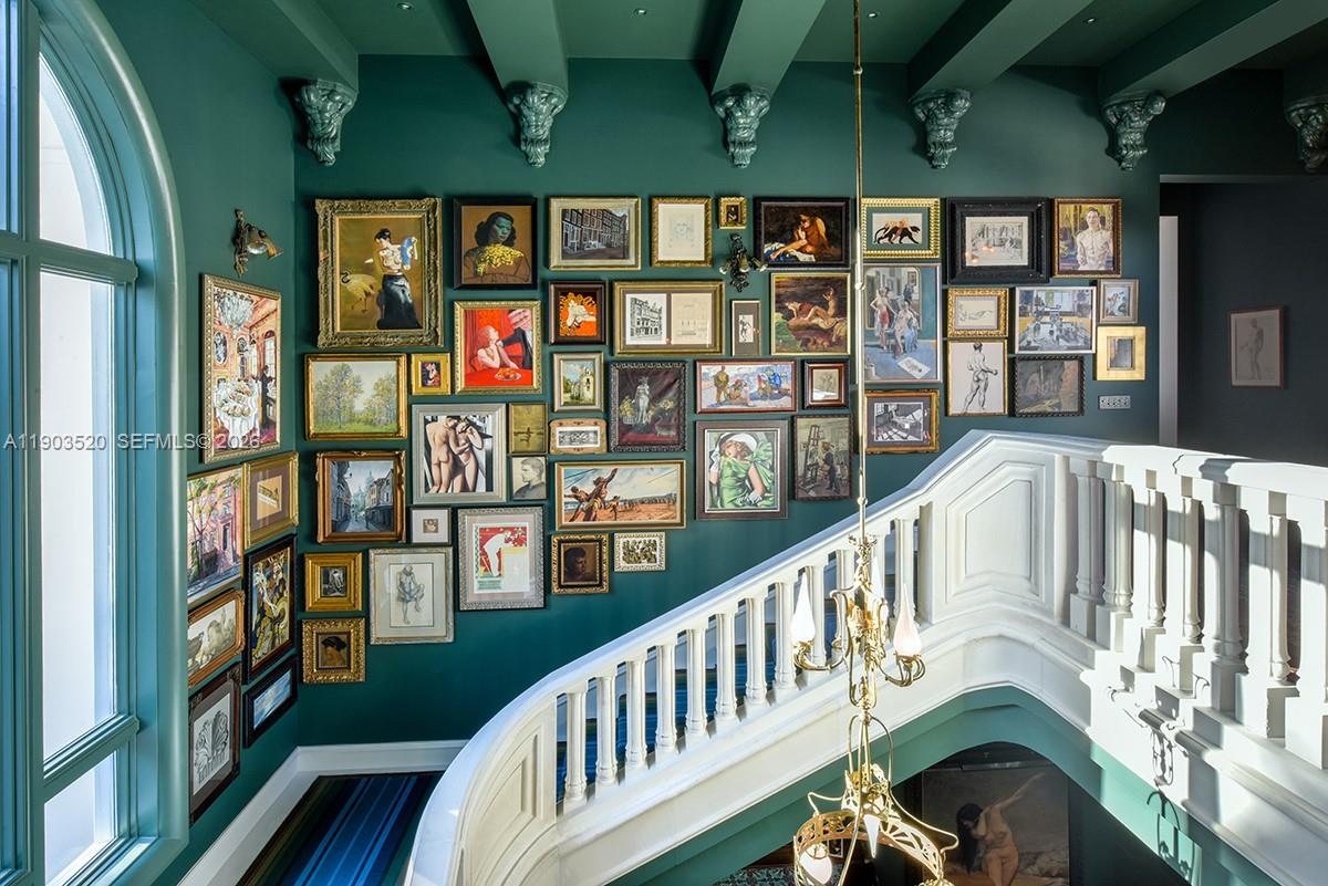 soaring ceilings, custom details, and unique features throughout. The grand entrance is surrounded by a 7-ft high