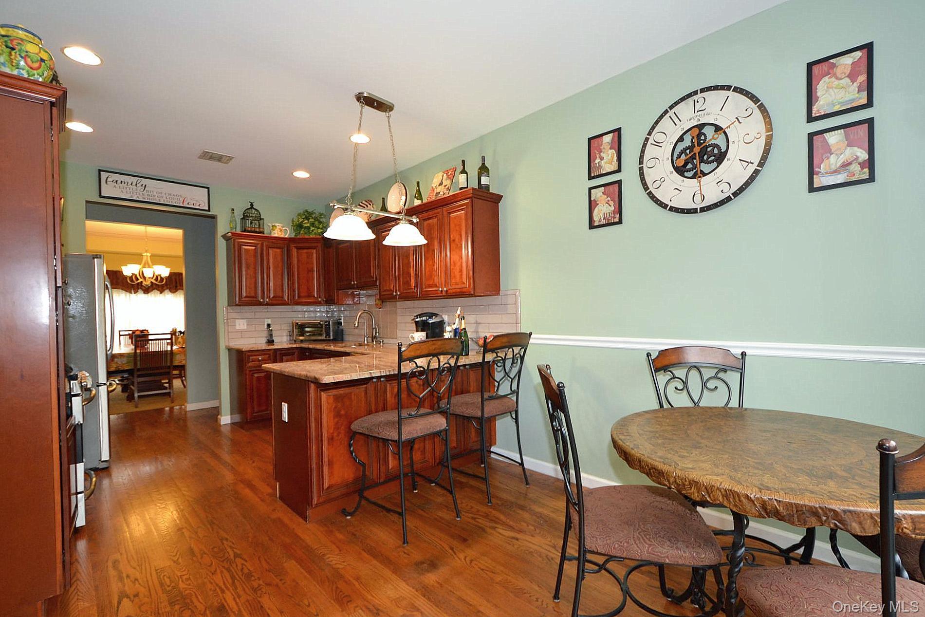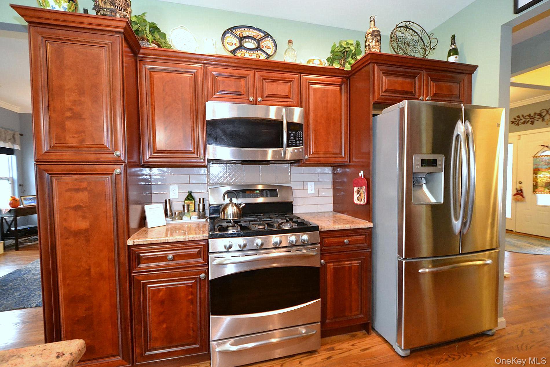 This stunning 3 bedroom, 2 bath young custom ranch is everything you have been searching for. Wide open living. Beautiful large entry foyer that opens into a sun filled family room complete with a gas fireplace, hardwood flooring throughout, crown molding, formal dining room, spacious eat in kitchen with granite counter tops and stainless steel appliances, large primary bedroom with en-suite, laundry room, huge basement with walkout entrance and high ceilings, walk up attic with huge picture window that can easily be converted to living space, one car garage, gas heat and cooking, CAC, separate gas hot water heater and solar panels. This beautiful large property is fully fenced with an oversized patio, in ground sprinkler system, house alarm system and sewers. This beauty sits at the end of a cul de sac in the Middle Country School District. You don't want to miss this one. !!