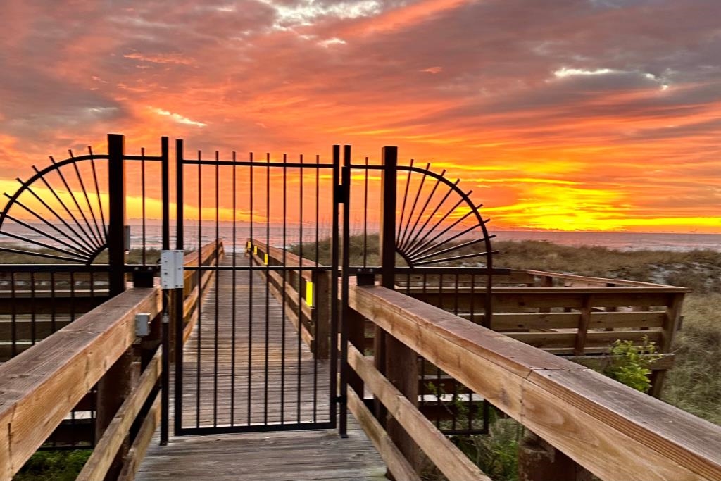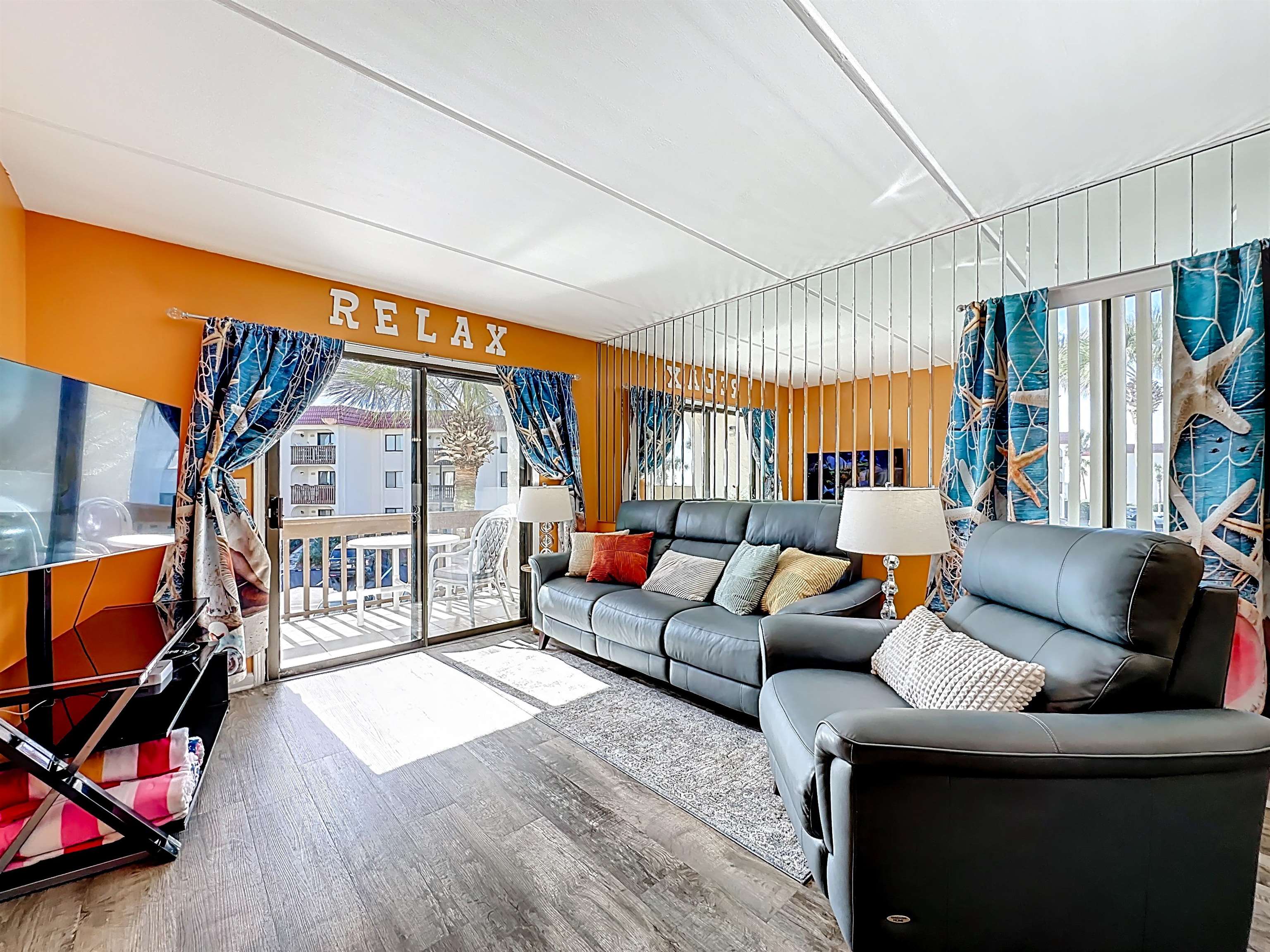 Tropical paradise called "Coral Cove' make you feel happy and care free just by entering and experiencing the vibrant colours and unique design. Truly "one of a kind" in style and design. This 2nd floor end unit in oceanfront building 5 is just steps from the elevator and boasts a desirable southern exposure w ocean view to enjoy the sunrise with your morning coffee. Only steps to the beach gate and walkover makes this a quick trip with all your beach toys. Sleeps 6 with two trundle beds in the guest room and a spacious master bedroom with king bed , desk and extra storage. New tiled walk in showers w frame free glass in master & guest baths. Comfortable living room and dining room with LVP flooring and a dining table with glass top with lights and shells that create a artsy abode. The living room features brand new 3 seater leather couch with 2 loungers and one separate matching soft leather lounger. Even the laundry room was well thought out with LG washer/dryer tower with IQ features