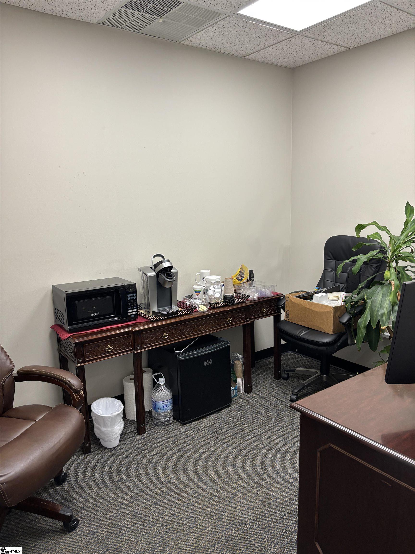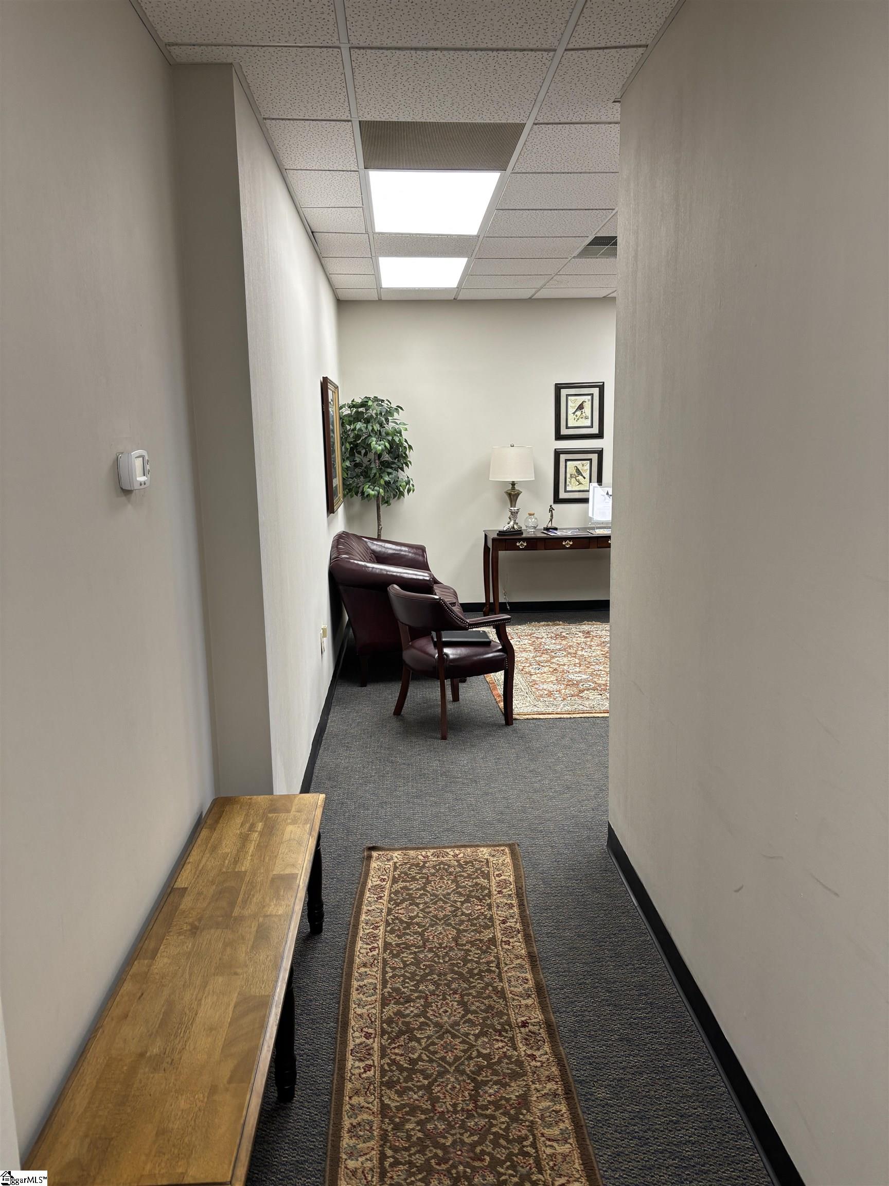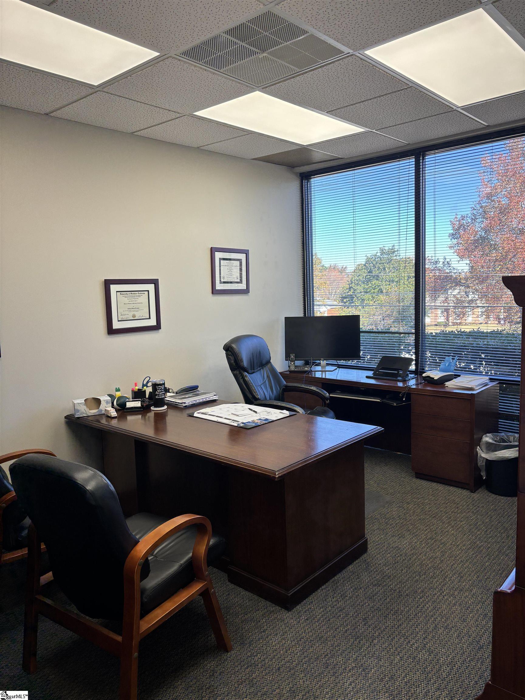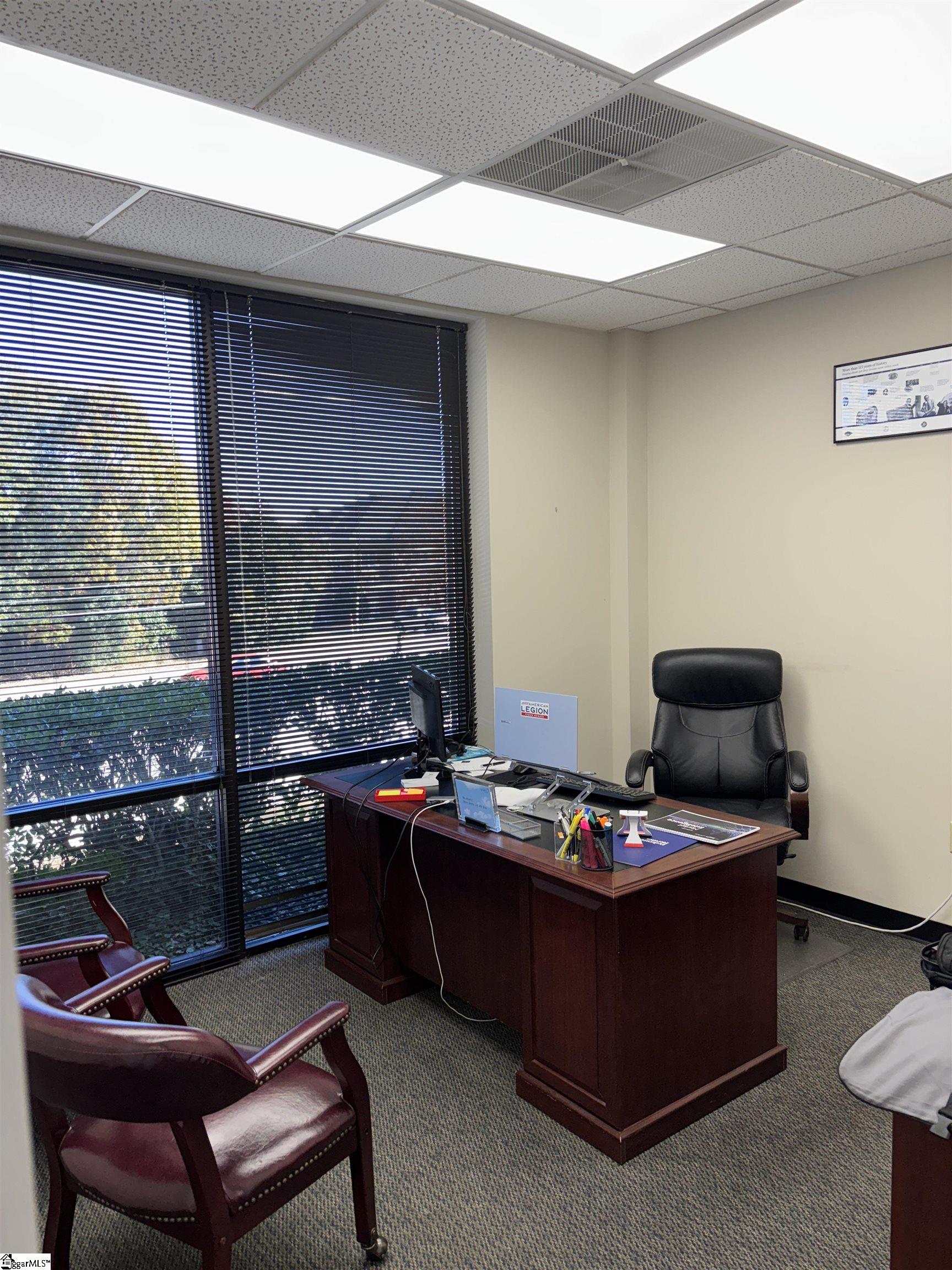 This is an opportunity to sub-lease a first floor, three office, plus reception area, professional office suite on Pelham Rd near the Heywood Rd intersection. Two large offices have windows, the third small office can also be a break area or storage area. There is a large reception/sitting area that could be a meeting room. Carpet throughout. Office #1- 14'x10". Office #2- 12'x10' Office #3- 11'x8', Reception/Meeting area 14'x10'. Sub-lease available through February 2029. $1500 per month Full Service.
