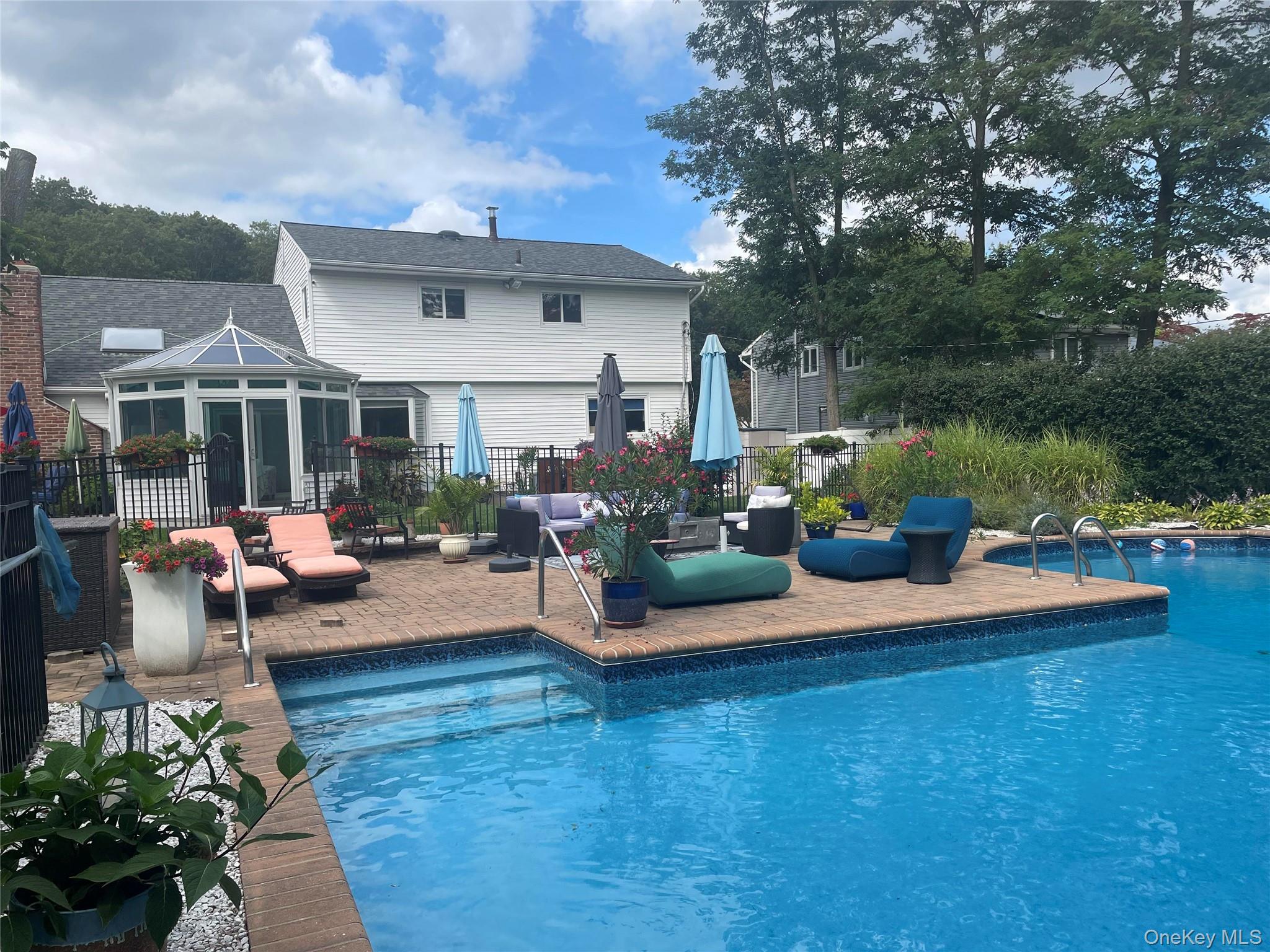 Welcome to this stunning 4- Bedroom, 2. 5- Bath Colonial perfectly situated on a . 35 acre in the Half Hollow Hills School District. The main level offers an inviting Entry Hall with a Powder Room, a formal Living Room and Den with a skylight and a Gas Fireplace. The Gourmet Kitchen features Stainless Steel Appliances, Gas cooking and a beautiful feature window overlooking the backyard. The Kitchen flows seamlessly into the Dining Room and Den making it ideal for entertaining. The upper level features the Primary Bedroom En-suite with Bath & Jacuzzi tub, three additional Bedrooms with Hardwood Floors and Full Bath. A beautiful Sunroom off the Den offers the perfect place to relax and unwind, featuring walls of windows that fill the space with natural light and overlooks the resort style backyard with an In-ground Heated Saltwater Pool, Stone Patio and Gas Fire Pit. Additional highlights include: 2- Car Garage, In-ground Sprinkler System, Basement with utilities, washer/ dryer and so much more!