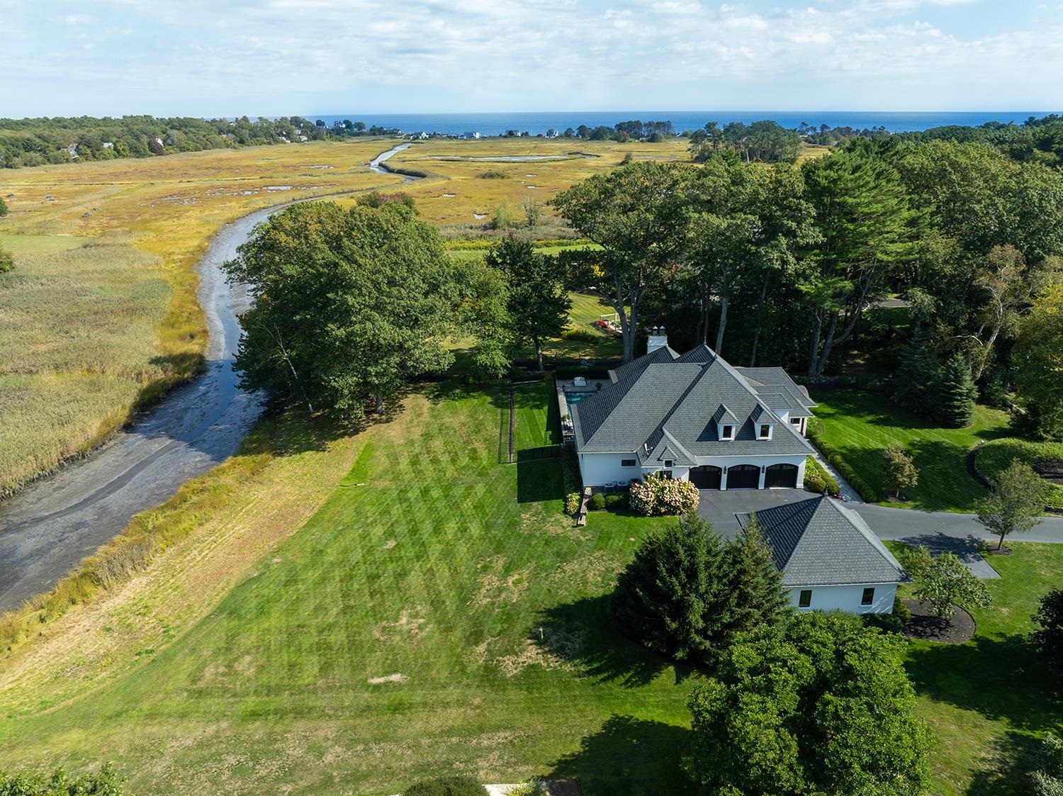 Sought-after Runnymede Drive is the setting for this one-of-a-kind, custom-built home, exquisitely positioned in one of the most coveted locations along the New Hampshire Seacoast. Perfectly sited on a beautifully landscaped two-acre lot overlooking the Little River, one of North Hampton’s most scenic and treasured waterways, the home enjoys sweeping views that extend to the Atlantic Ocean beyond. This rare vantage point offers an unparalleled blend of coastal beauty and privacy—where tidal river waters, rolling lawns, lush vegetation, and a natural waterfall create a serene, ever-changing backdrop. A true kayaker’s and paddleboarder’s paradise, the Little River setting also attracts abundant wildlife, including a resident bald eagle. Inside, nine finely detailed rooms include a first-floor primary suite, two guest suites with ensuite baths, a den, and an epicurean island kitchen with AGA gas range, Subzero refrigeration, and upscale finishes. A private butler’s pantry/bar connects to the formal dining room, while a marble foyer opens to a vaulted living room with black walnut flooring. Seamless indoor-outdoor living surrounds a heated pool with waterfall feature. The finished lower level offers a private gym, wet bar, and billiards/theater room with radiant heated floors. Two separate garages provide five radiant-heated bays. Set on a quiet, sleepy side street with a shared two-acre neighborhood lot and within sight and sound of the ocean, this serene British-inspired residence represents a truly exceptional offering along the New Hampshire coast.