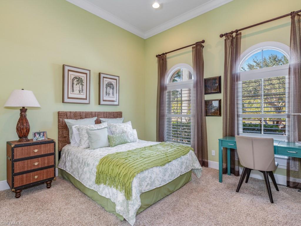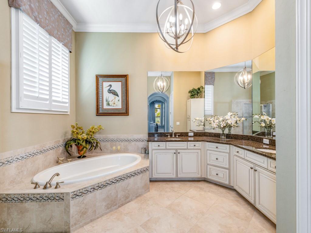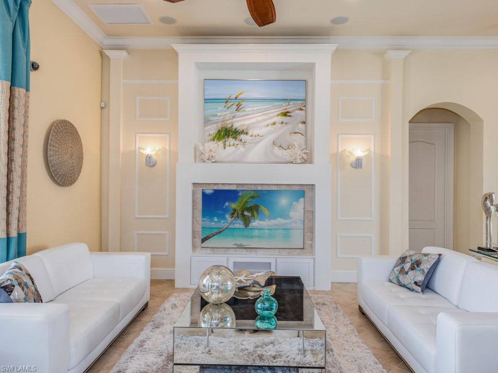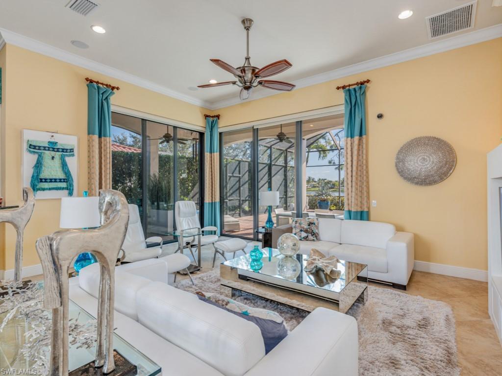 Located in the beautiful Mediterra Golf & Country Club of Naples that offers a newly renovated private beach club for residents - This stunning home combines refined architecture with modern luxury, starting with the striking curb appeal with lush landscaping, lakes with fountains both in front and behind the house, and the spacious paver driveway, which leads past iron gates and stone-accented pillars into a private courtyard entry. The foyer creates an open, welcoming atmosphere with soaring ceilings, arched passageways, and gentle, neutral tones. The sunlit den, located just beyond the foyer, functions as a private office with courtyard access through tall sliding doors, features a closet, and can be used as a jack-and-jill-style fourth bedroom. The formal dining room exudes style & sophistication with a beautiful glass table and tasteful contemporary décor. The main living areas accommodate open-concept design, allowing seamless flow between spaces, incorporating modern design elements, stylish furniture, and abundant natural lighting through the wall of tall glass sliding doors connecting the Living and outdoor spaces. The Gourmet kitchen is full of light with a private courtyard adjacent and features a walk-in pantry, premium Monogram appliances, beautiful wood cabinetry, granite countertops wrapped around the gas cooktop, double wall ovens, and a breakfast bar. Just a few steps from the kitchen is a convenient bar with its own wine cooler, perfect for entertaining. The primary suite is indulgent, with two walk-in closets, private outdoor access, a quiet sitting area, and a spa-inspired bath equipped with a separate tub & shower, dual vanities, modern fixtures, and tasteful finishes. The guest bedrooms are spacious and well-appointed, with contemporary décor, large windows, and en-suite bathrooms. The large screened outdoor area is the perfect gathering space to soak in those sunny days. A generous-sized pool & spa are the centerpiece. It includes an outdoor kitchen, dining space, and lounge seating, creating a perfect oasis for relaxation & entertainment with the delightful backdrop of vibrant landscaping and a sparkling lake in the backyard. Mediterra is a prestigious luxury golf & country club community featuring Two championship Tom-Fazio golf courses for avid golfers, multiple tennis courts, pickle-ball & bocce, fitness center, pristine bike & jogging trails, and luxurious dining at the private country club restaurant. The Mediterra Beach Club offers an escape to a 10, 000 sq. ft two-story private oceanfront paradise on the Gulf of Mexico. Featuring a restaurant & bar that serves members via indoor & outdoor dining, this private facility boasts a heated swimming pool, a sundeck, and cabana beach service for chairs, umbrellas & refreshments.