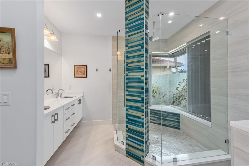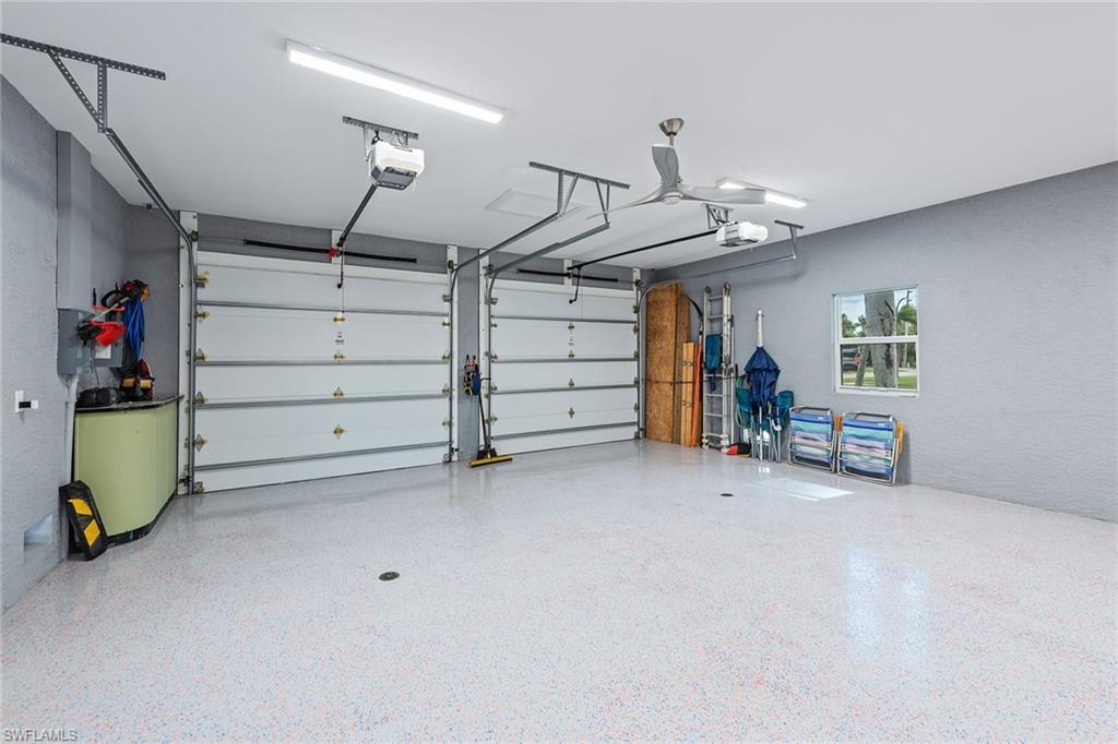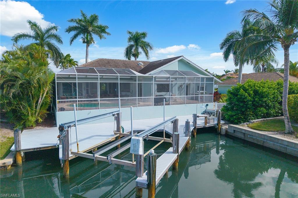 If you are a car enthusiast, this home is for you, offering a rare six-car garage configuration paired with luxurious waterfront living. Experience the ultimate in coastal elegance with this tastefully remodeled residence on a desirable corner lot featuring western exposure, a private boat dock, and a resort-style pool area positioned for Marco Island’s breathtaking sunsets. Designed to impress, this property blends contemporary sophistication with exceptional functionality, including an attached two-car garage plus a detached, air-conditioned four-car tandem garage with epoxy flooring, ceiling fans, windows and a convenient powder bath, ideal for a gym, hobby studio or car collection. Inside, polished porcelain tile flooring, vaulted ceilings, recessed lighting, and modern custom fixtures create an airy, refined ambiance throughout the open-concept plan. The living room features a dry bar with a granite counter and newer mini refrigerator, along with sliding glass doors that open to the expansive screened lanai. The open contemporary kitchen is a chef’s dream, showcasing sleek modern cabinetry, quartz countertops, a waterfall island with breakfast bar, and a large picture window framing peaceful water views. Premium stainless steel appliances include an induction range with hood, under-counter microwave, dishwasher and refrigerator with icemaker. A spacious breakfast nook and separate formal dining area make entertaining effortless. The owner’s suite offers direct lanai access, a generous walk-in closet with built-ins, and a spa-inspired en-suite bath featuring a dual quartz vanity with full-width mirror and a spectacular walk-in shower with floor-to-ceiling tile, bench seating, multiple shower heads, a frameless glass enclosure and a striking accent wall. The guest wing includes two well-appointed bedrooms with luxury vinyl plank flooring and plantation shutters, along with a beautifully updated bath featuring a dual marble vanity and a tiled walk-in shower with multiple shower heads and pool access. Go outside to serene outdoor living, where covered seating and brick paver decking surround the sparkling pool with a new pump. The private dock is equipped with a 10, 000-pound lift and a fish cleaning station, providing effortless access for boating, fishing or sunset cruising. Full storm protection includes impact doors and windows and electric shutters for added peace of mind. Near upscale and casual dining, boutique shopping, art and cultural venues, tennis and pickleball facilities, championship golf courses and family-friendly parks, this exceptional property offers the best of island living, just minutes from Marco Island’s award-winning Residents Beach and Marco Island Executive Airport.