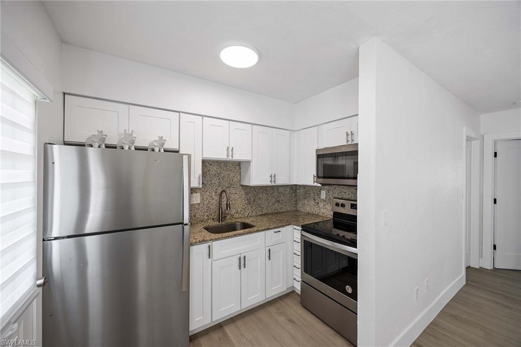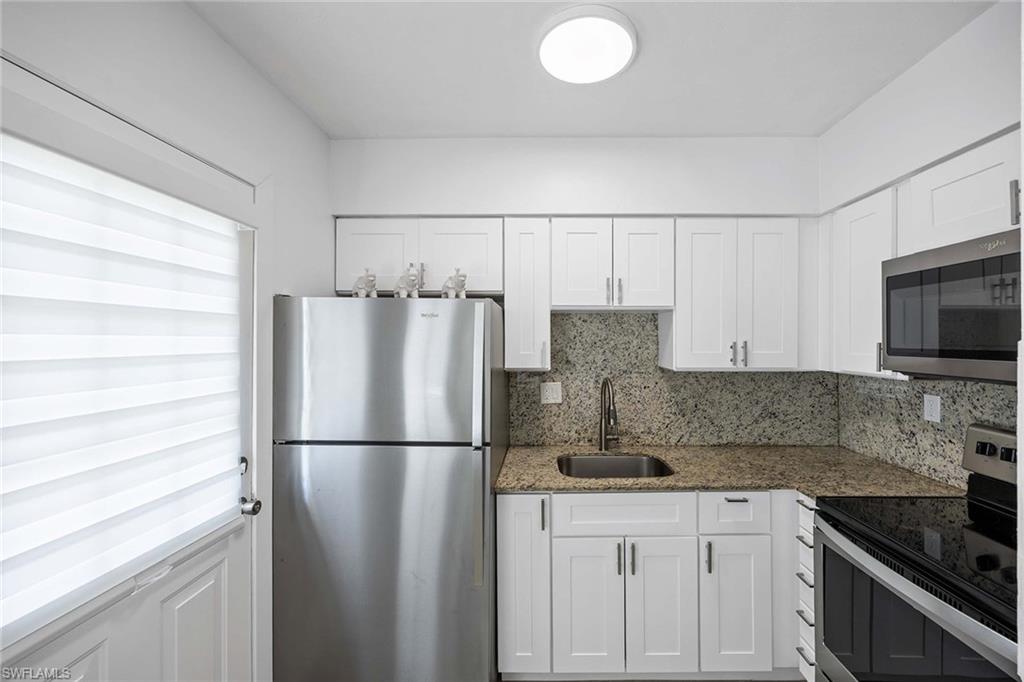 An opportunity to move in immediately to a completely renovated and freshly furnished one-bedroom, one-bath, centrally located condominium in the heart of Marco Island. Recent updates include updated bath, all one vinyl plank flooring throughout, new baseboards, new paint, new closet organization system, cabinetry in bedroom, stainless appliances, granite countertops, all with an onsite ultra convenient community washer and dryer nearby. The community also features a large heated private swimming pool. Close to everything Marco Island offers!