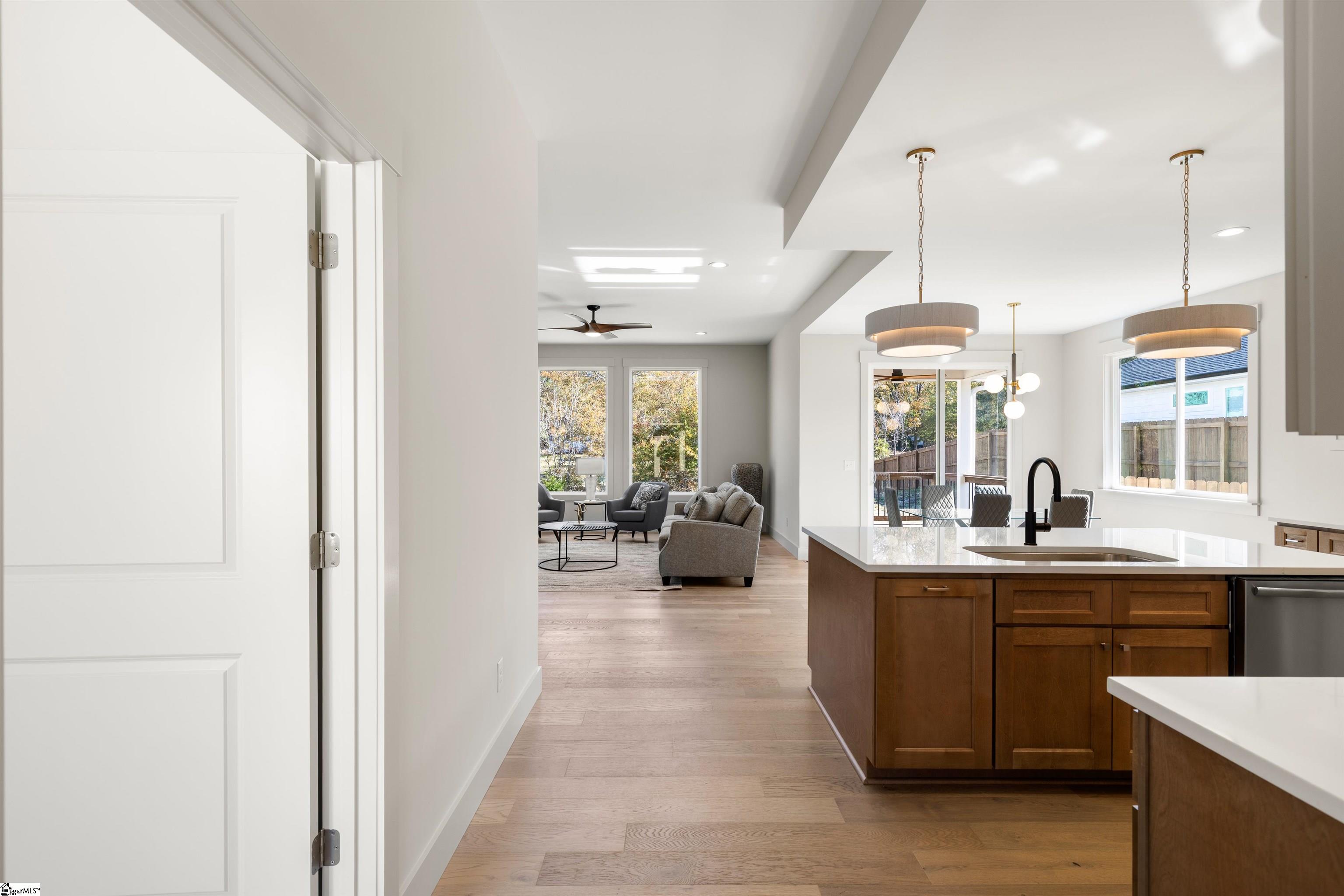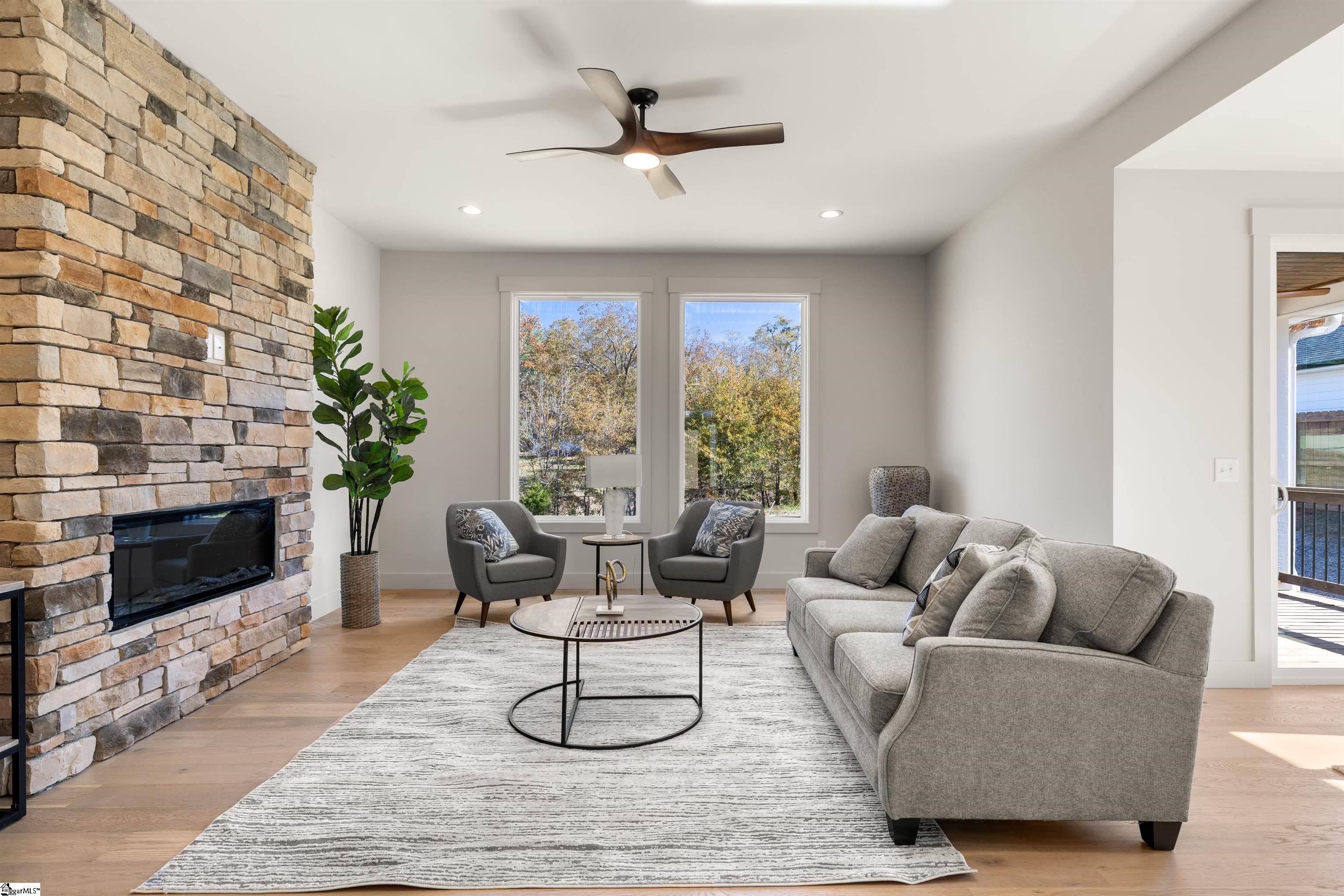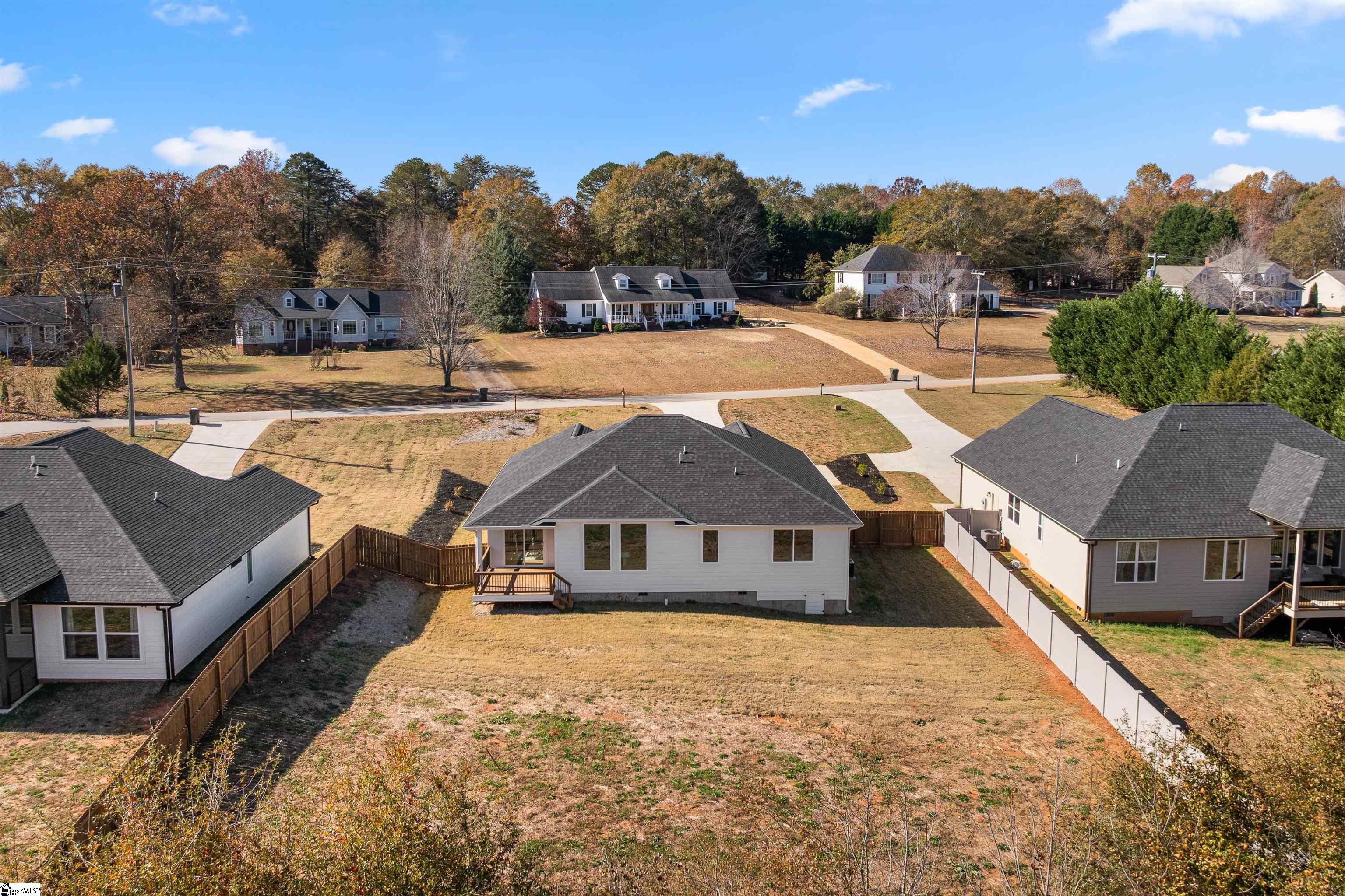 This home opens with wide-plank flooring, tall ceilings, and large windows that pull in natural light from every side. The main living area is centered around a *floor-to-ceiling stone fireplace*, giving the space a warm, anchored feel. The kitchen sits close by and includes quartz counters, soft-close cabinetry, a spacious island, a tile backsplash, and a walk-in pantry with built-ins. The split floor plan keeps the primary suite private, with a double vanity, walk-in tile shower, and a custom closet. Two additional bedrooms and a full bath sit on the opposite side of the home, and a separate office offers a quiet spot for work or projects. Out back, a covered porch looks over the *fully fenced yard*—a great setup for pets, play, gardening, or simply enjoying the peace and quiet of the backyard. Natural light, thoughtful finishes, and ceilings reaching up to ten feet in several areas give the entire home an open, comfortable feel. For added peace of mind, the builder includes a *2-10 Home Buyers Warranty* with the purchase. This is the last of three homes available on this street. Come see it today!