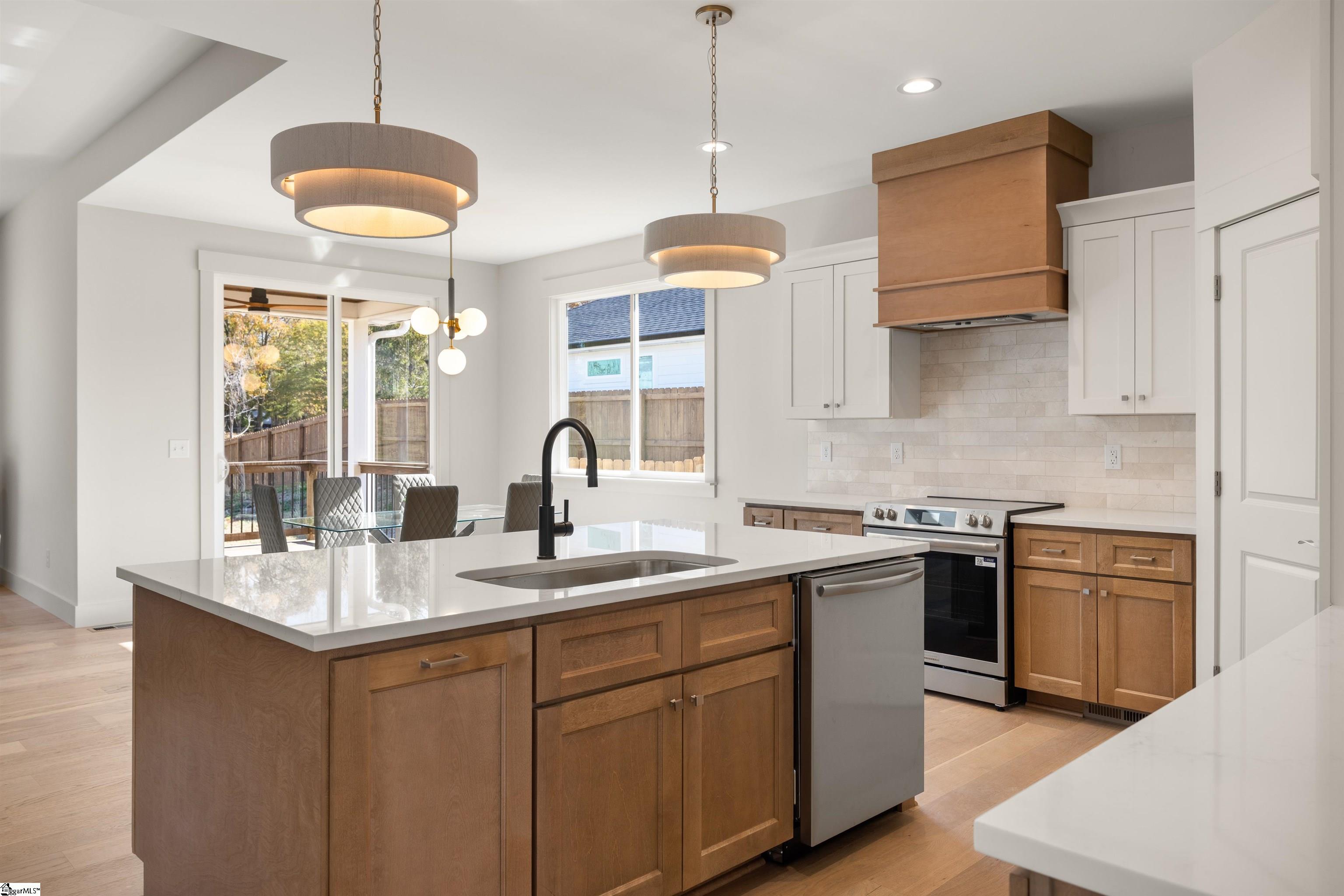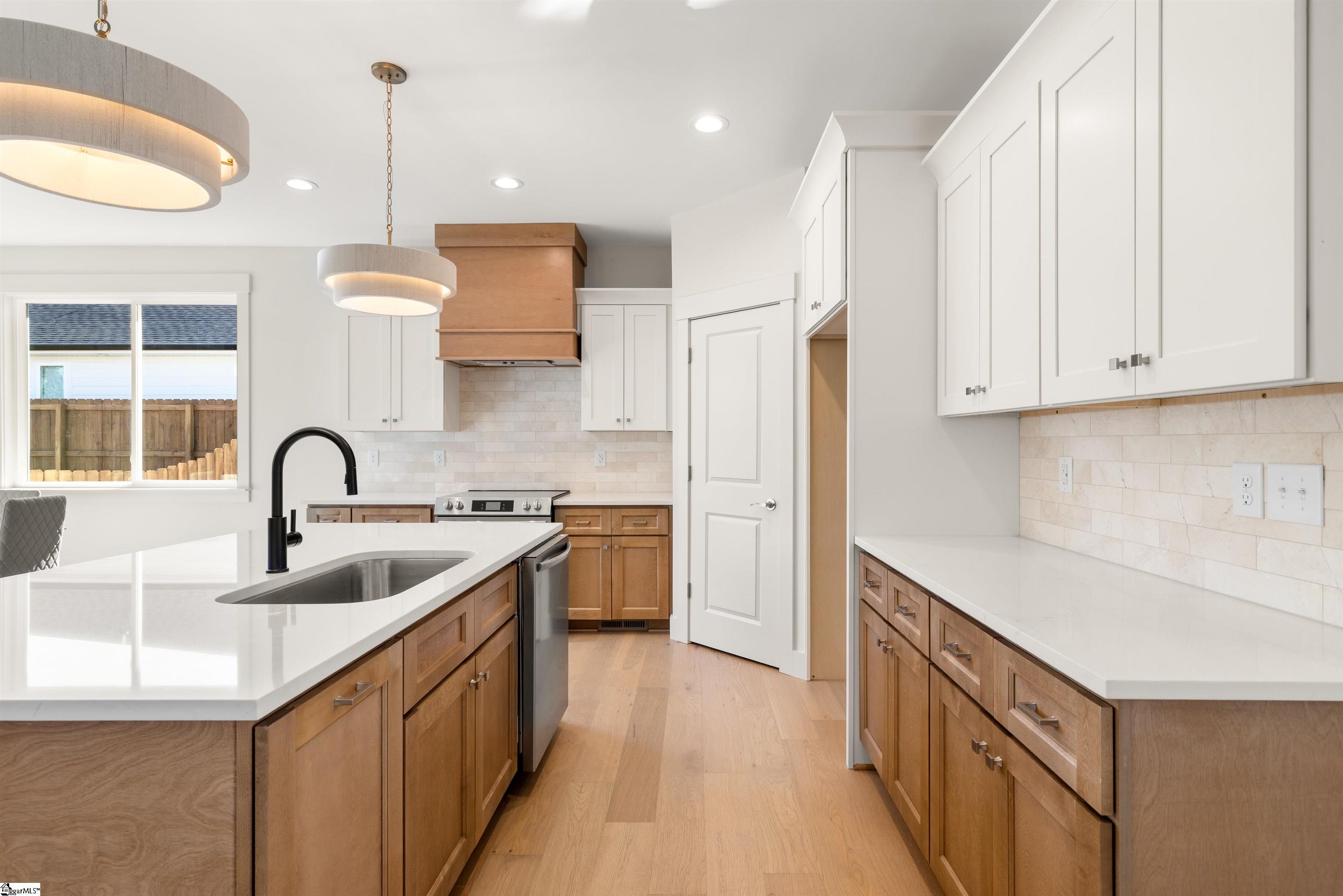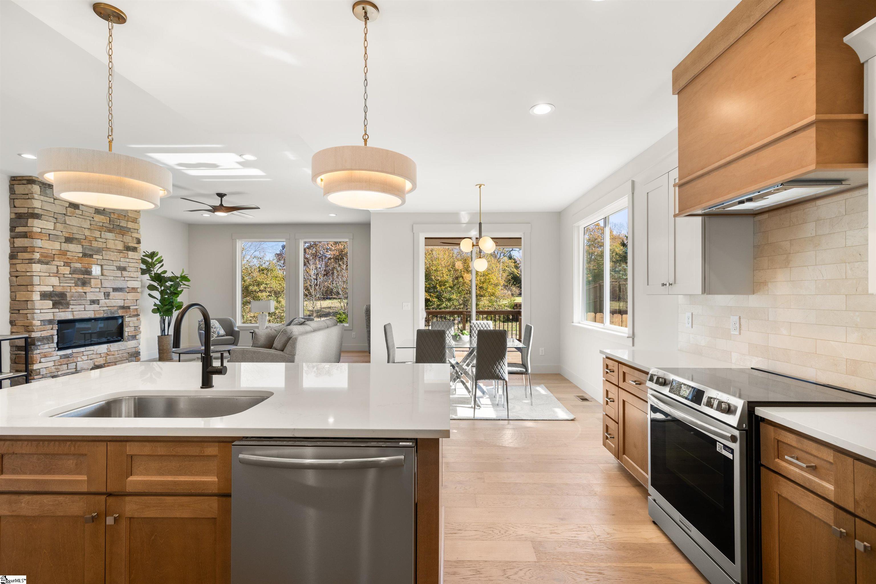 This home opens with wide-plank flooring, tall ceilings, and large windows that pull in natural light from every side. The main living area is centered around a *floor-to-ceiling stone fireplace*, giving the space a warm, anchored feel. The kitchen sits close by and includes quartz counters, soft-close cabinetry, a spacious island, a tile backsplash, and a walk-in pantry with built-ins. The split floor plan keeps the primary suite private, with a double vanity, walk-in tile shower, and a custom closet. Two additional bedrooms and a full bath sit on the opposite side of the home, and a separate office offers a quiet spot for work or projects. Out back, a covered porch looks over the *fully fenced yard*—a great setup for pets, play, gardening, or simply enjoying the peace and quiet of the backyard. Natural light, thoughtful finishes, and ceilings reaching up to ten feet in several areas give the entire home an open, comfortable feel. For added peace of mind, the builder includes a *2-10 Home Buyers Warranty* with the purchase. This is the last of three homes available on this street. Come see it today!