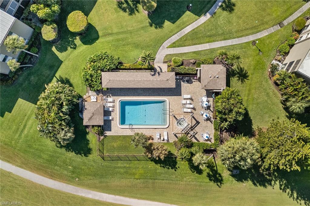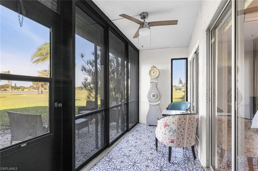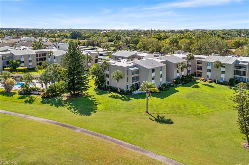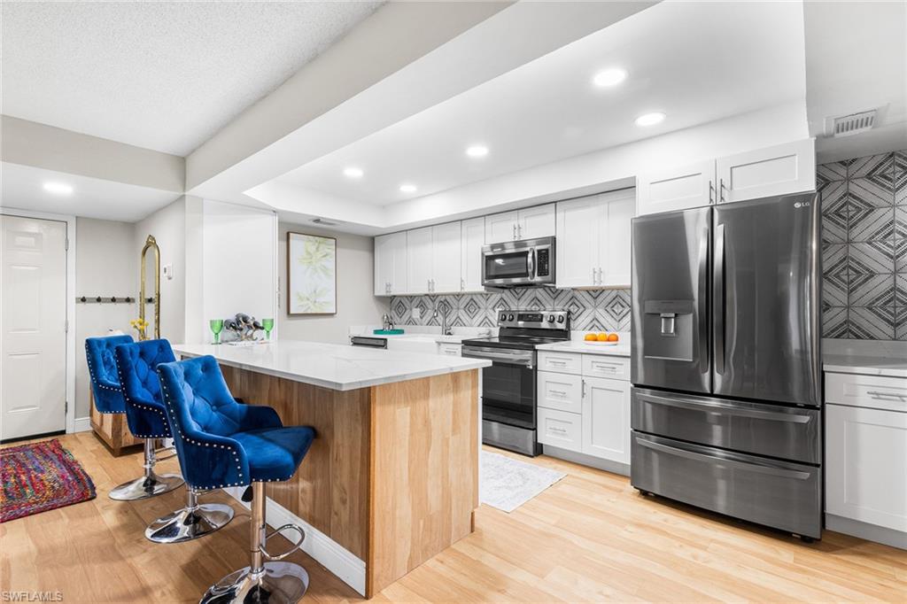 Nearly $100, 000 spent to renovate this first-floor condominium near the community pool and hot tub. Gorgeous lake and golf course views! Goodbye galley kitchen. Hello stunning, open kitchen offering island with breakfast bar, quartz countertops, artfully designed backsplash, farm sink, soft-close drawers, pantry, white shaker cabinets and drawers, drop ceiling removed and custom lighting added, complete with a graphite-colored LG appliance package. Goodbye washer and dryer in outside closet. Hello in-residence, stacked laundry system. So many fantastic improvements. Warm, easy-to-maintain vinyl floors throughout main living areas and bedrooms. Primary bedroom with custom closet doors and lots of windows offering golf course and lake views, plus direct access to the glass-enclosed lanai. Primary bath has ship lapped walls, modern light fixtures, new storage cabinet and sink, mirrored medicine cabinet and stunning shower. Spacious guest bedroom has walk-in closet and a guest bath with shower/tub combo, and updated light fixtures, sink and faucet. Glass enclosed lanai with electric storm shutter for year-round enjoyment. Plus, an extra outdoor seating area in the rock garden. Large storage closet just outside the front door and another storage cubby around the corner. Reserved covered parking. Keyless entry pad on front door. Move-in ready! No stairs or elevators. Less than 10 minutes to downtown Naples and the beach. This is a must-see. Furniture is negotiable.