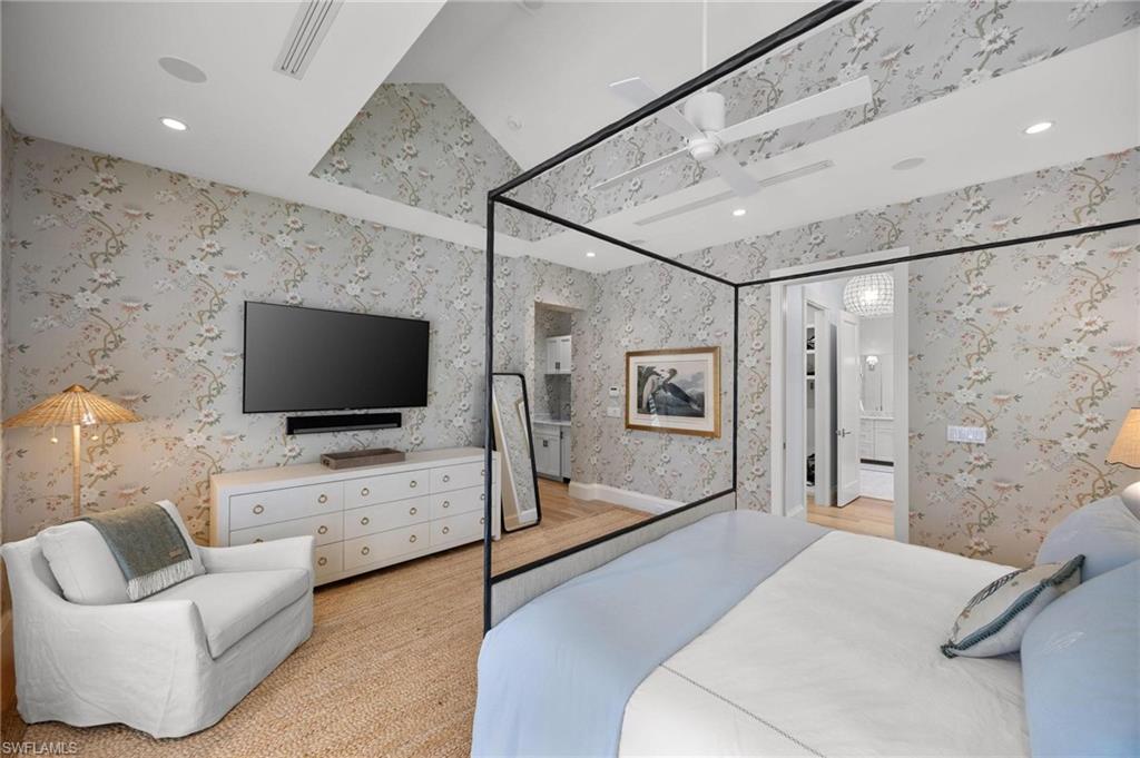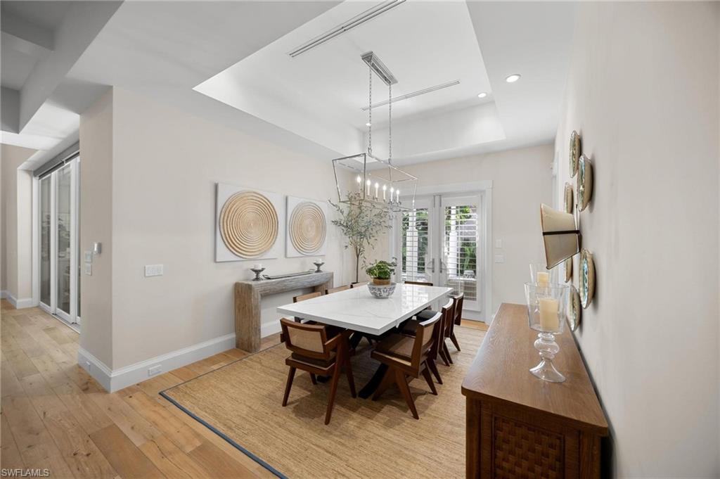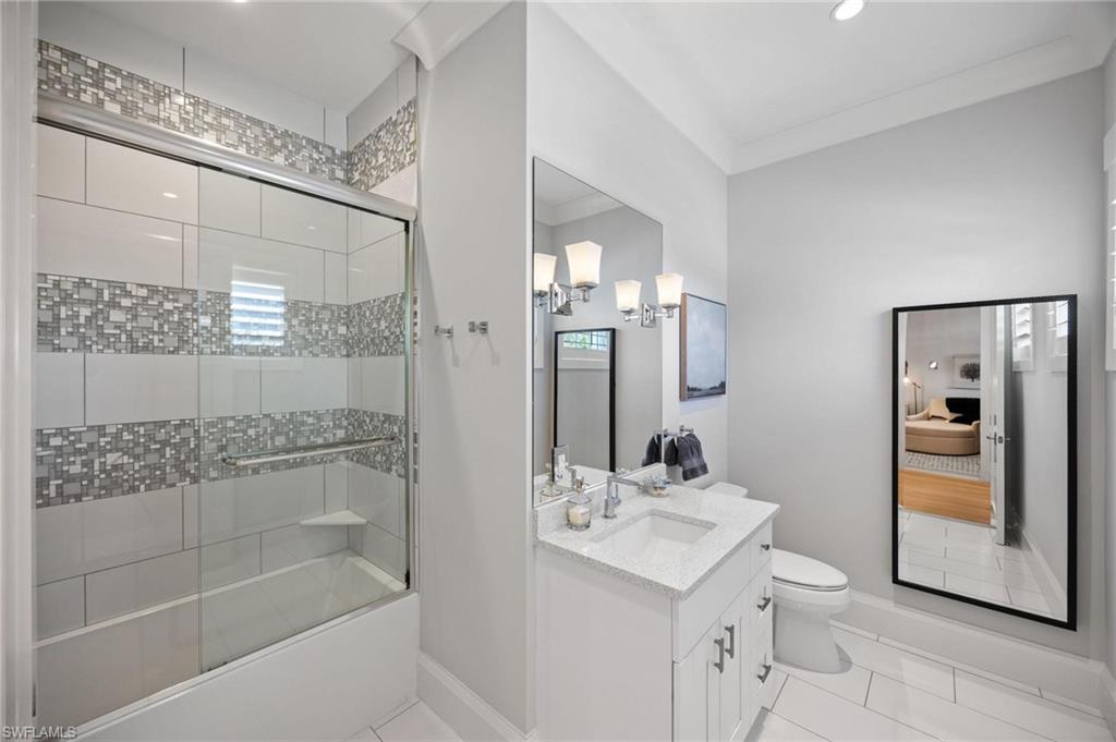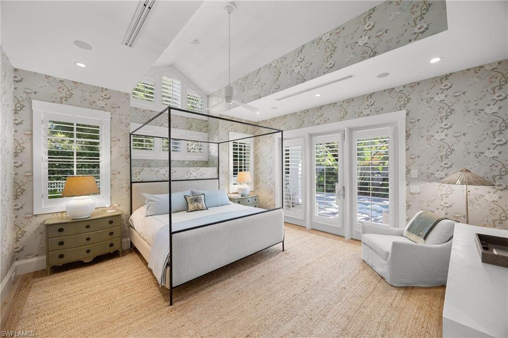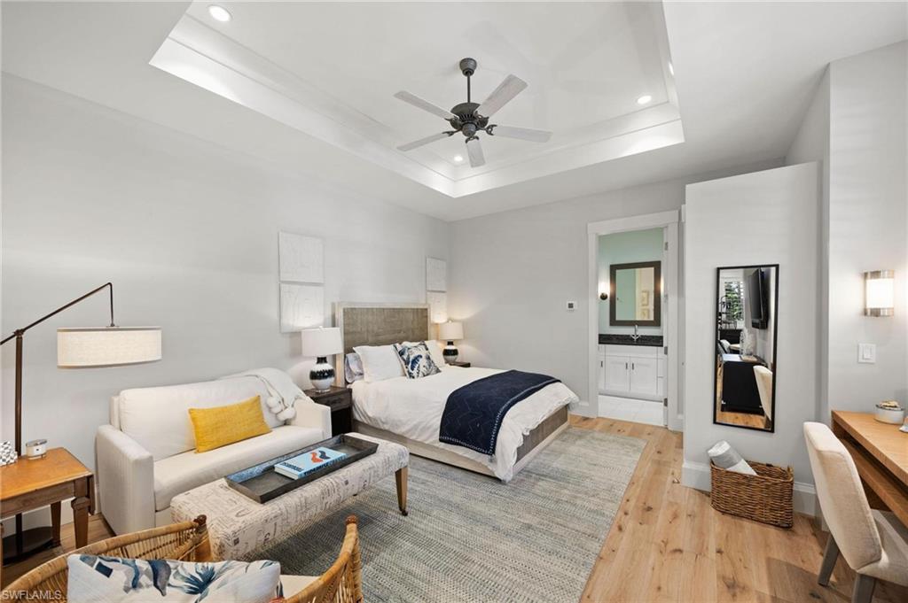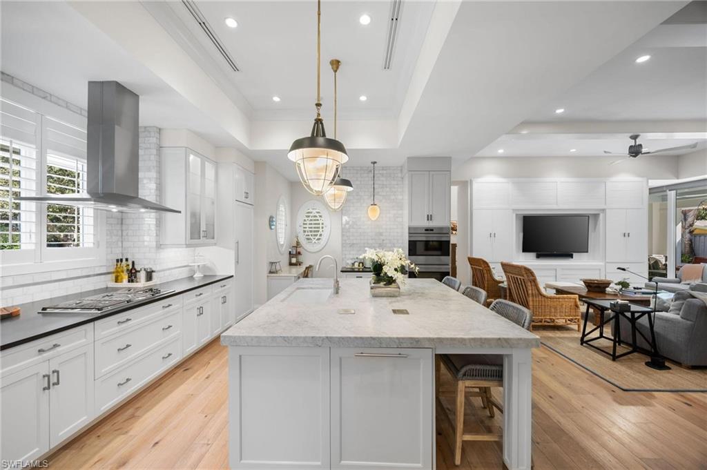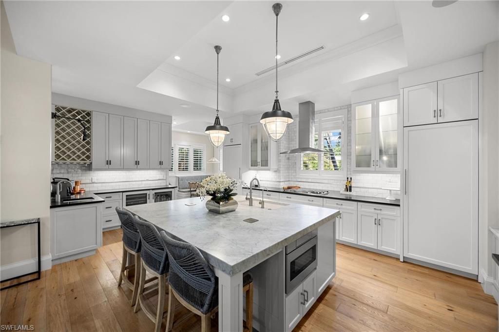 Just blocks from Naples’ famous sugar sand beaches and the charm of downtown, this elegant Olde Naples residence sits on an oversized southern exposure corner lot within the highly desirable X500 flood zone. This custom home combines timeless design, modern craftsmanship, and a premier location to deliver an exceptional living experience. The five bedroom, seven and a half bath residence features a climate controlled four car garage with alley access, a circle driveway, mature manicured landscaping, and an oversized front porch with two charming porch swings that create a warm and welcoming sense of arrival. Inside, the light filled foyer opens to a spacious great room with custom built-in cabinetry and expansive glass doors leading to the covered lanai. The outdoor living space is ideal for entertaining year round, with a gas fireplace, outdoor kitchen, and a heated pool with sun shelf surrounded by lush tropical landscaping, elegant landscape lighting, and a rarely available large fenced in artificial grass yard perfect for outdoor activities many can only dream of in Old Naples. At the heart of the home, the gourmet kitchen impresses with a large center island, paneled Sub-Zero refrigerator and freezer, Wolf gas cooktop, double wall ovens, wine chiller, beverage center, and walk-in pantry. A custom breakfast banquette and formal dining room framed by French doors create a seamless indoor outdoor flow, perfect for gatherings of any size. The first floor primary suite is a private retreat offering two walk-in closets, a morning bar, and a spa inspired bath with dual vanities, a soaking tub, and a glass enclosed shower with bench seating and multiple shower heads. Four additional ensuite bedrooms provide comfort and privacy, including a separate guest casita with private entrance, kitchenette, and custom seating area. Additional features include a study, a flex or exercise room with wet bar, a loft, and a laundry room with built-in cabinetry, sink, and dual stacked washer dryer sets. The elevated homesite provides a rare combination of a large yard and resort style pool, a unique feature in Olde Naples. Designer finishes throughout include wide plank wood flooring, custom millwork, detailed ceilings, plantation shutters, and abundant storage. This remarkable home offers the best of Naples living, style, sophistication, and location. A sanctuary of elegance, innovation, and effortless luxury designed for those who seek the extraordinary. A must see!