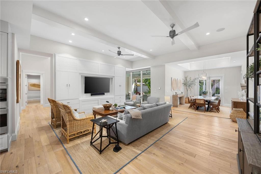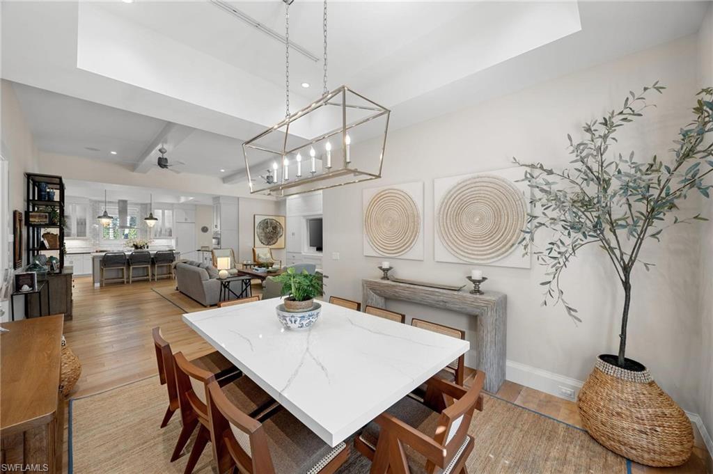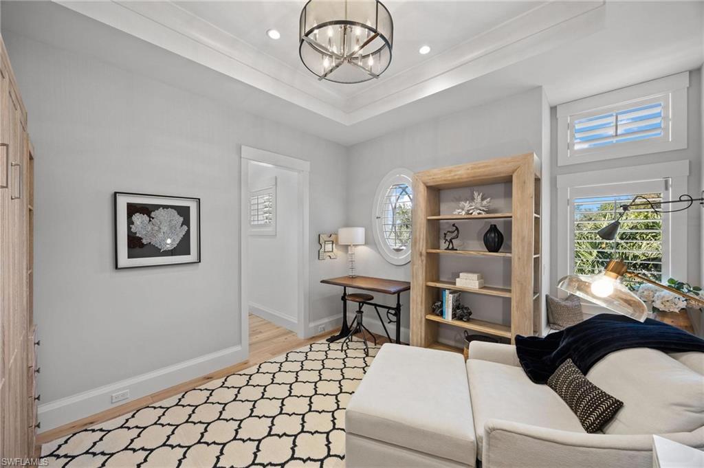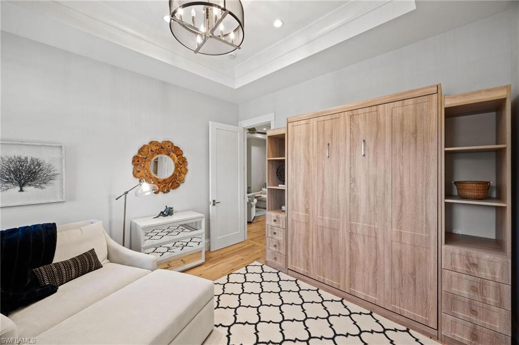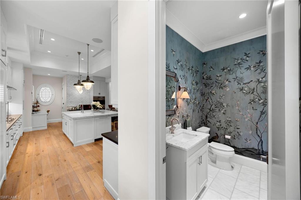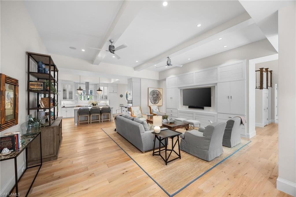Just blocks from Naples’ famous sugar sand beaches and the charm of downtown, this elegant Olde Naples residence sits on an oversized southern exposure corner lot within the highly desirable X500 flood zone. This custom home combines timeless design, modern craftsmanship, and a premier location to deliver an exceptional living experience. The five bedroom, seven and a half bath residence features a climate controlled four car garage with alley access, a circle driveway, mature manicured landscaping, and an oversized front porch with two charming porch swings that create a warm and welcoming sense of arrival. Inside, the light filled foyer opens to a spacious great room with custom built-in cabinetry and expansive glass doors leading to the covered lanai. The outdoor living space is ideal for entertaining year round, with a gas fireplace, outdoor kitchen, and a heated pool with sun shelf surrounded by lush tropical landscaping, elegant landscape lighting, and a rarely available large fenced in artificial grass yard perfect for outdoor activities many can only dream of in Old Naples. At the heart of the home, the gourmet kitchen impresses with a large center island, paneled Sub-Zero refrigerator and freezer, Wolf gas cooktop, double wall ovens, wine chiller, beverage center, and walk-in pantry. A custom breakfast banquette and formal dining room framed by French doors create a seamless indoor outdoor flow, perfect for gatherings of any size. The first floor primary suite is a private retreat offering two walk-in closets, a morning bar, and a spa inspired bath with dual vanities, a soaking tub, and a glass enclosed shower with bench seating and multiple shower heads. Four additional ensuite bedrooms provide comfort and privacy, including a separate guest casita with private entrance, kitchenette, and custom seating area. Additional features include a study, a flex or exercise room with wet bar, a loft, and a laundry room with built-in cabinetry, sink, and dual stacked washer dryer sets. The elevated homesite provides a rare combination of a large yard and resort style pool, a unique feature in Olde Naples. Designer finishes throughout include wide plank wood flooring, custom millwork, detailed ceilings, plantation shutters, and abundant storage. This remarkable home offers the best of Naples living, style, sophistication, and location. A sanctuary of elegance, innovation, and effortless luxury designed for those who seek the extraordinary. A must see!