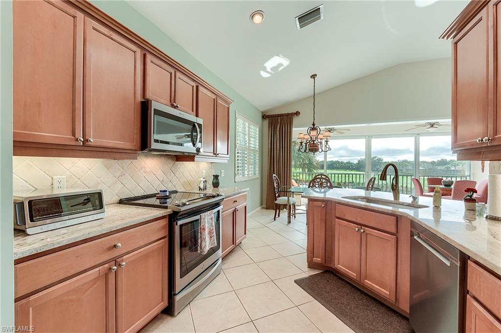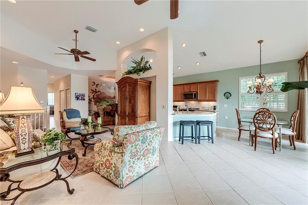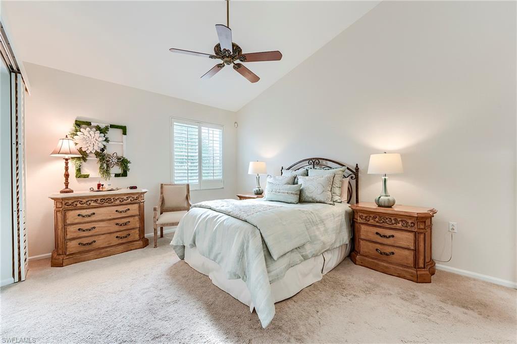 Inside this light, bright, and airy 3 Bedroom, 2-Bath home showcases vaulted ceilings, wood raised-panel cabinetry, and tile flooring throughout all living areas (extended into the lanai) with plush carpet in the bedrooms. Plantation shutters, architectural details, newer appliances, and neutral finishes enhance the open, comfortable layout.