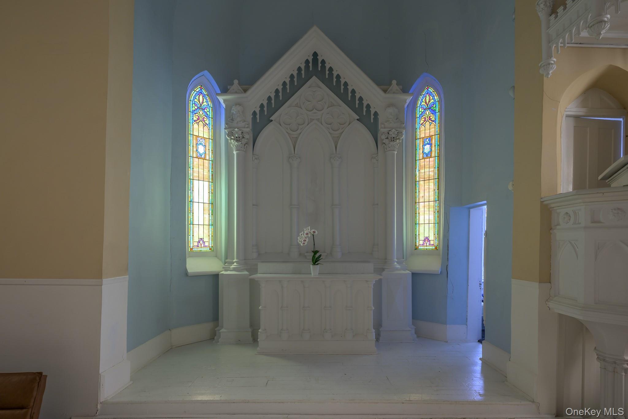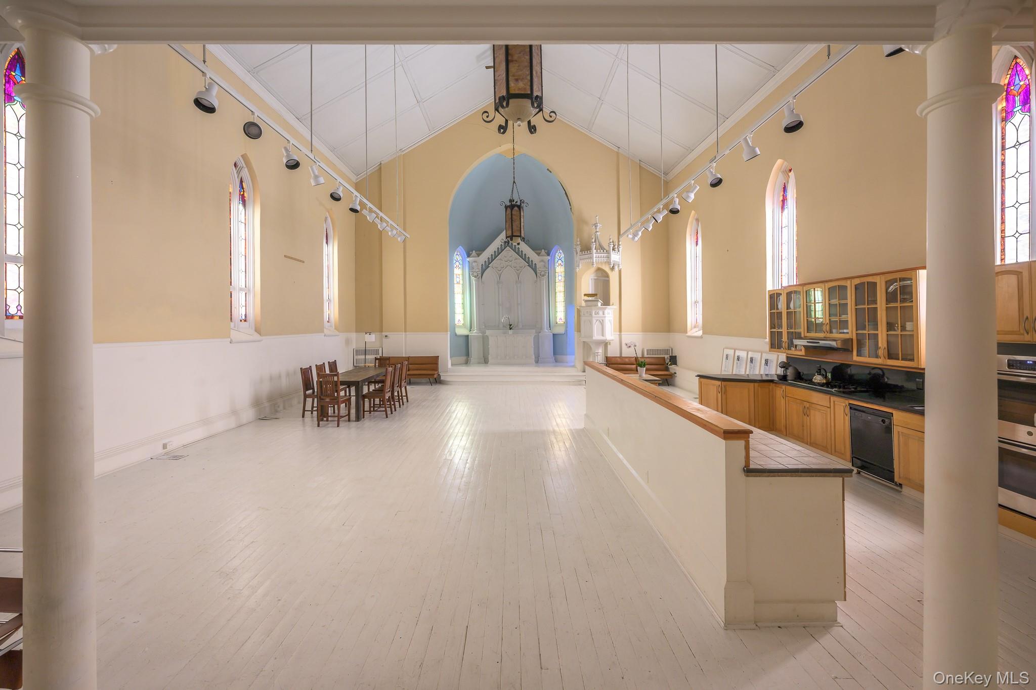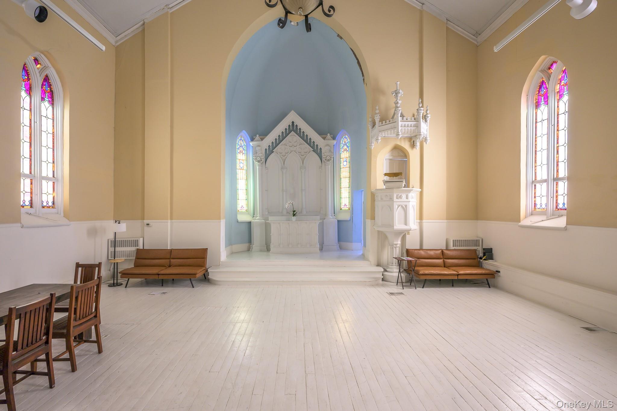 A Unique Space Reimagined in the Heart of Hudson Rising with quiet grandeur in Hudson’s historic Armory District, this 1870 brick church has been reborn as an extraordinary private residence — a seamless blend of heritage and modern artistry. Inside, 30-foot ceilings lift the eye toward hand-hewn beams and light-dappled brick walls, while an open 2, 500-square-foot plan creates an atmosphere both expansive and intimate. Every detail feels intentional: a gourmet kitchen designed for conversation as much as cooking; serene new baths that balance utility with elegance; and central air ensuring comfort through every season. The pièce de résistance is the lofted primary suite — a tranquil aerie overlooking the vast main hall, crowned by the church’s original circular stained-glass window. Each morning, colored light spills through the glass in shifting patterns, transforming the room into a living work of art. Fully equipped and partially furnished, this rare sanctuary invites imagination — equally suited to a designer’s atelier, an artist’s retreat, or a life lived expansively. Steps from Hudson’s galleries, cafés, and cultural pulse, it offers both inspiration and refuge.