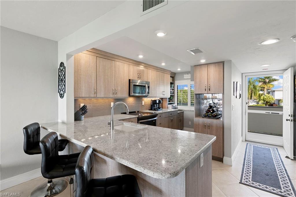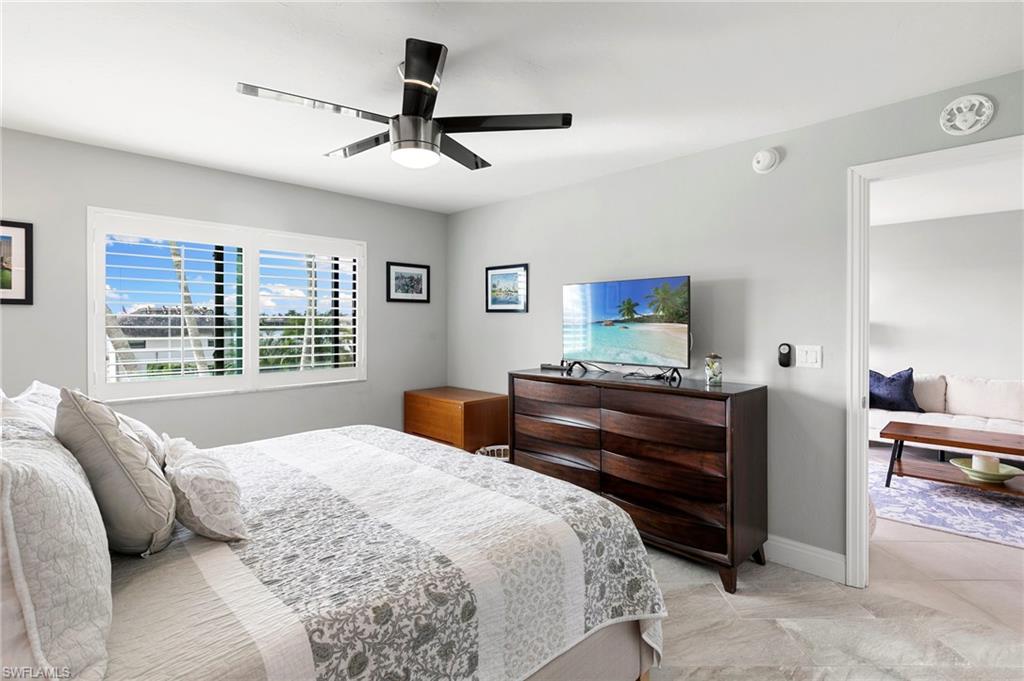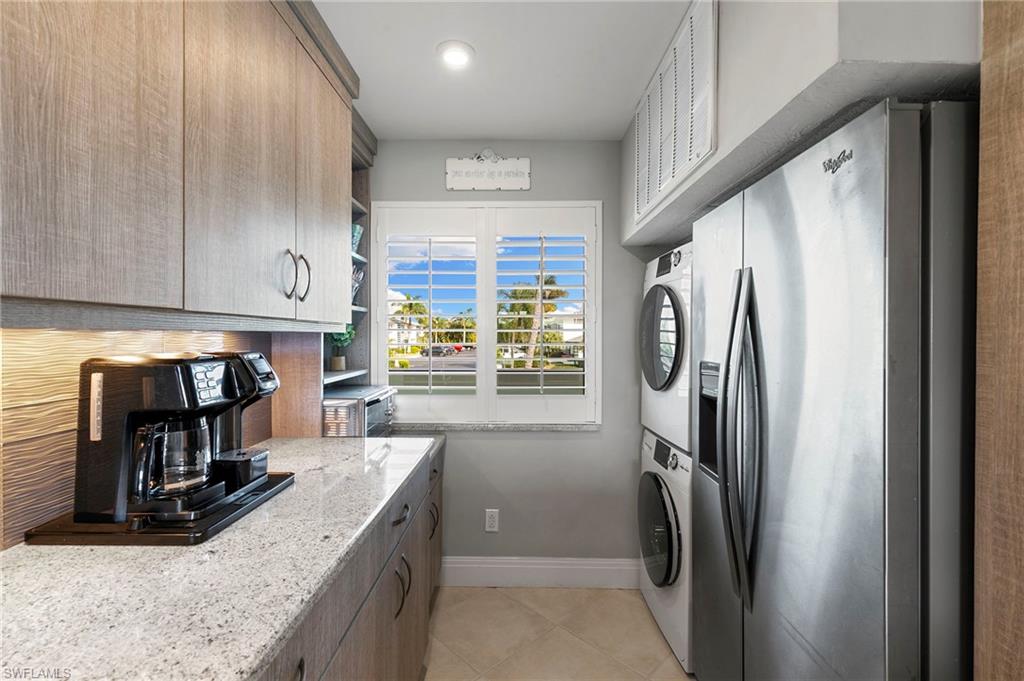Enjoy the best of Marco Island living in this beautifully renovated and stylishly furnished condo overlooking the wide waters of Smokehouse Bay. The kitchen and both bathrooms have been completely updated with modern finishes, while tile flooring throughout adds a clean, cohesive look. Thoughtful upgrades include plantation shutters, recessed lighting, granite countertops, stainless steel appliances, and a newer washer and dryer. Step out onto the screened lanai and take in the peaceful bay views — the perfect spot to relax, dine, or watch the boats pass by.