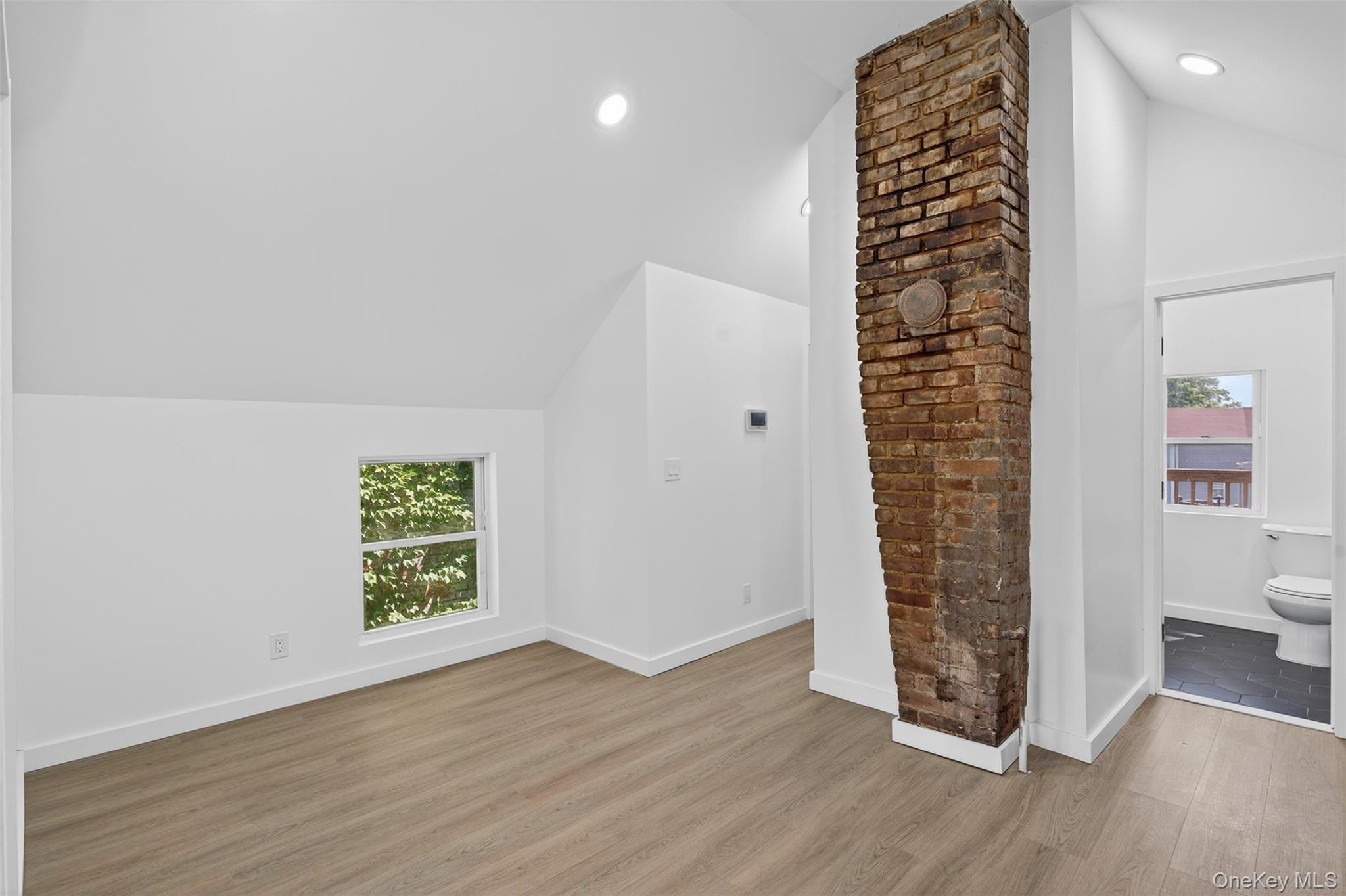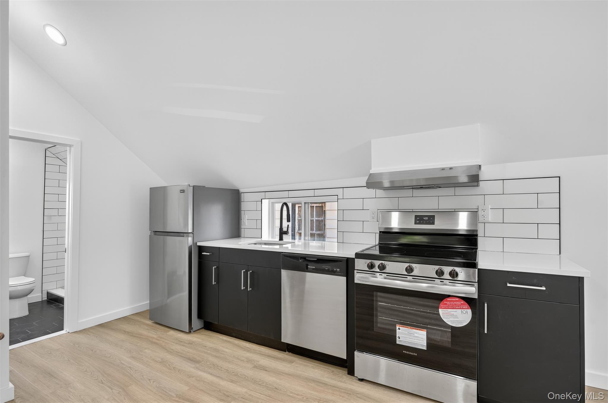 Discover modern comfort and convenience in this beautifully renovated one-bedroom apartment located in a charming three-unit building in the heart of Goshen, NY. Designed with both style and efficiency in mind, this apartment features a contemporary kitchen equipped with stainless steel Frigidaire appliances, including a refrigerator, dishwasher, and sleek stainless steel hood. The space is accented by exposed shelving, white subway tile with striking black grout, black faucets, and stainless steel hardware, all brought together by recessed lighting that adds warmth and sophistication. Inside, you'll find oak-colored laminate flooring throughout, complemented by black door hardware accents and energy-efficient split units for both heating and cooling. The in-unit GE washer and dryer combo offers added convenience, while the Airthereal electric tankless on-demand water heater ensures you're never without hot water. The bathroom boasts stylish hexagon tile flooring, LED smart mirror and black fixtures that tie seamlessly into the modern design. This well-insulated home also includes Energy Star-rated windows and doors, an automatic fire safety alarm system, individual electric panel, and in-unit security system for peace of mind. Step outside to enjoy a newly stamped patio and access to a shared, fenced-in yard—ideal for relaxing or entertaining. The building features brand-new siding and sits directly across from the Goshen public parking lot, making parking effortless. Best of all, you’re just a short walk to downtown Goshen’s vibrant shops, restaurants, parks, trails, library, and cafes, offering the perfect blend of village charm and everyday convenience. Modern, stylish, and walkable—this third story one-bedroom apartment checks all the boxes. Don’t miss your chance to live in the heart of Goshen. Schedule a tour today!