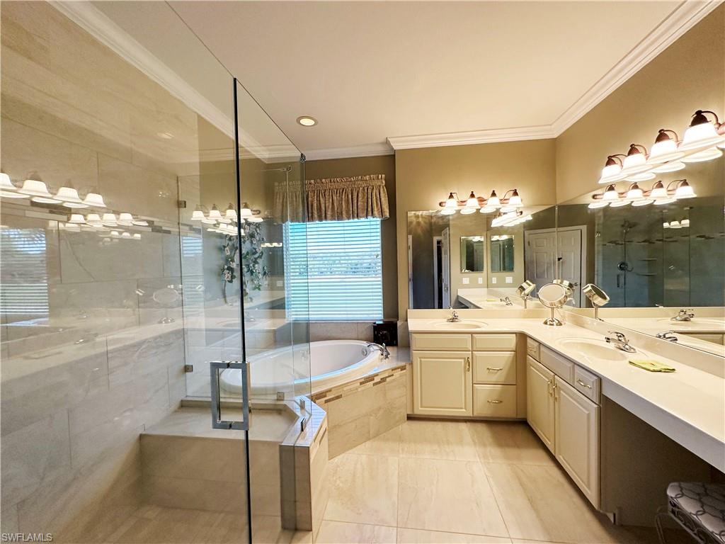 Retreat to the master suite with a king-size adjustable bed, remote control system, and an updated bathroom featuring frameless shower walls and elegant tilework. A two-car garage provides custom flooring, storage cabinets, and room for your personal golf cart.
