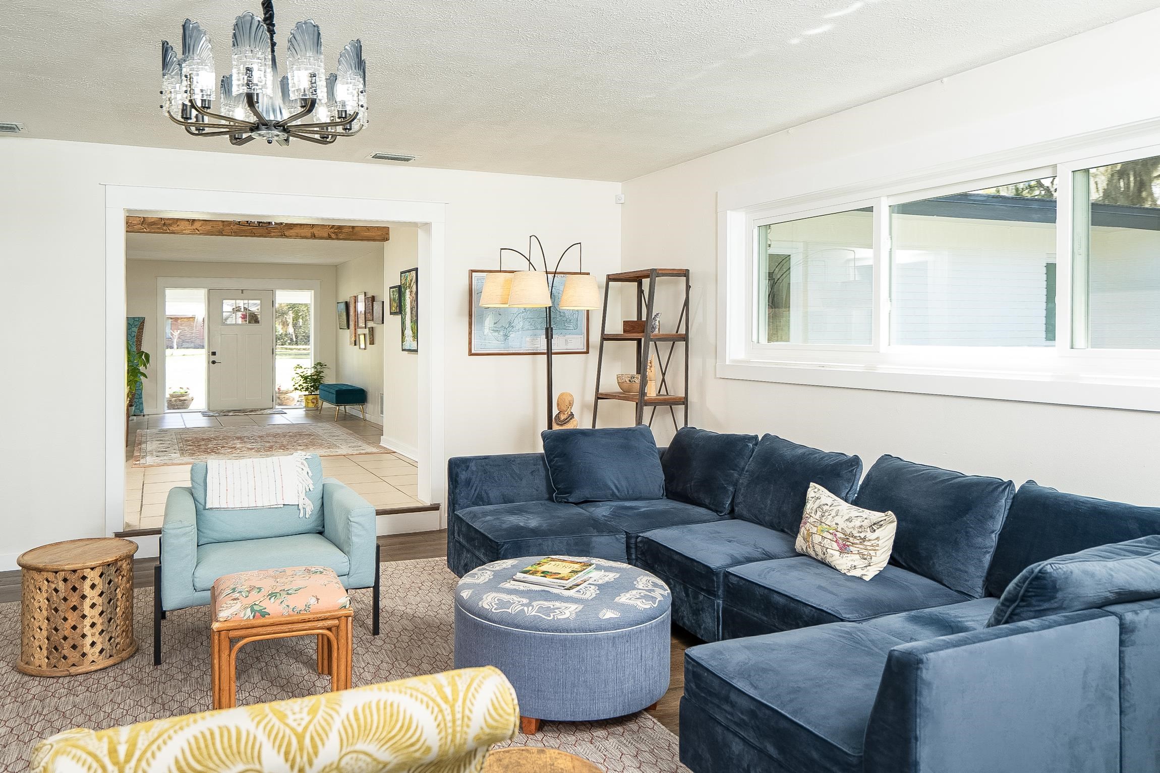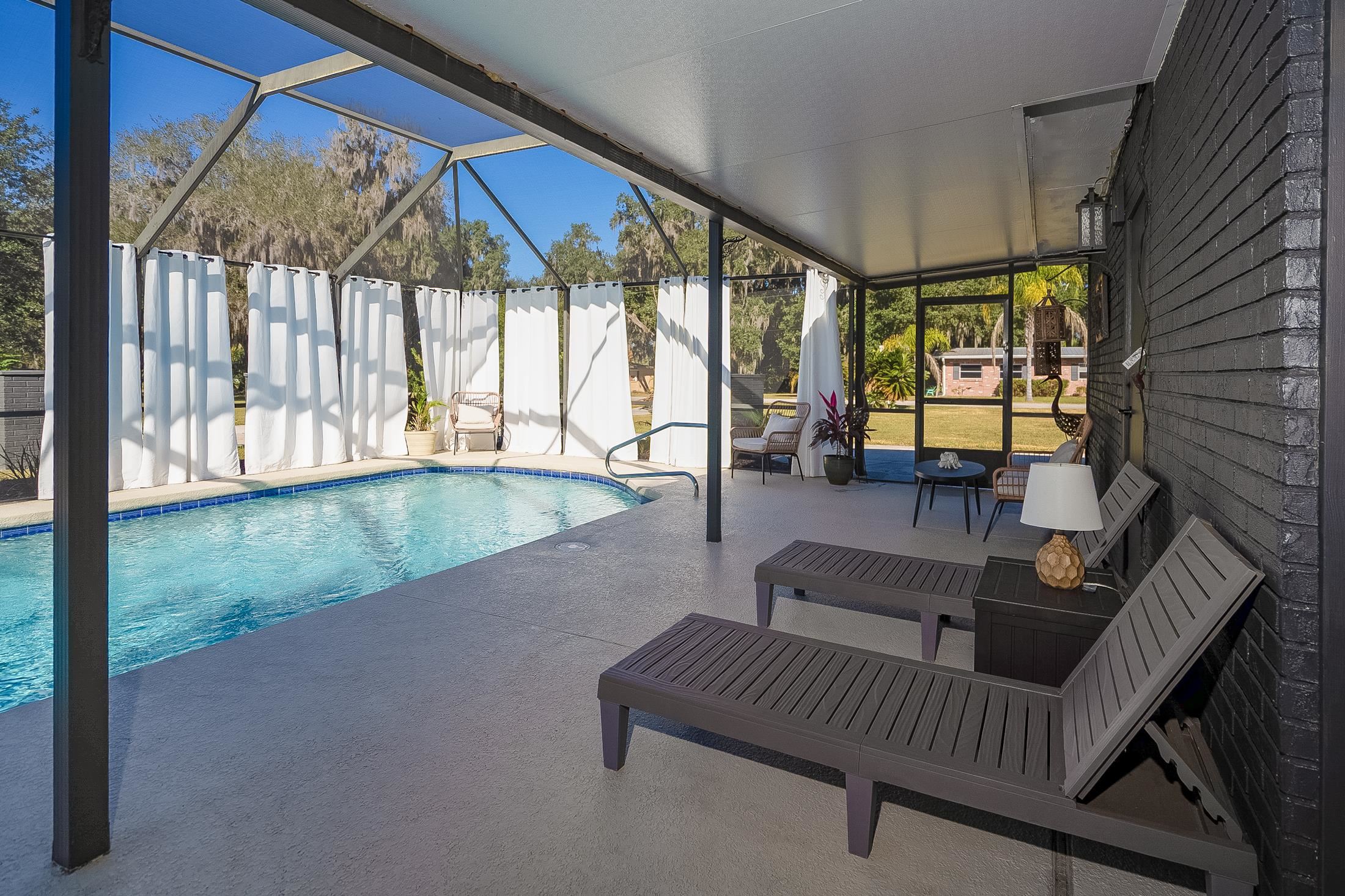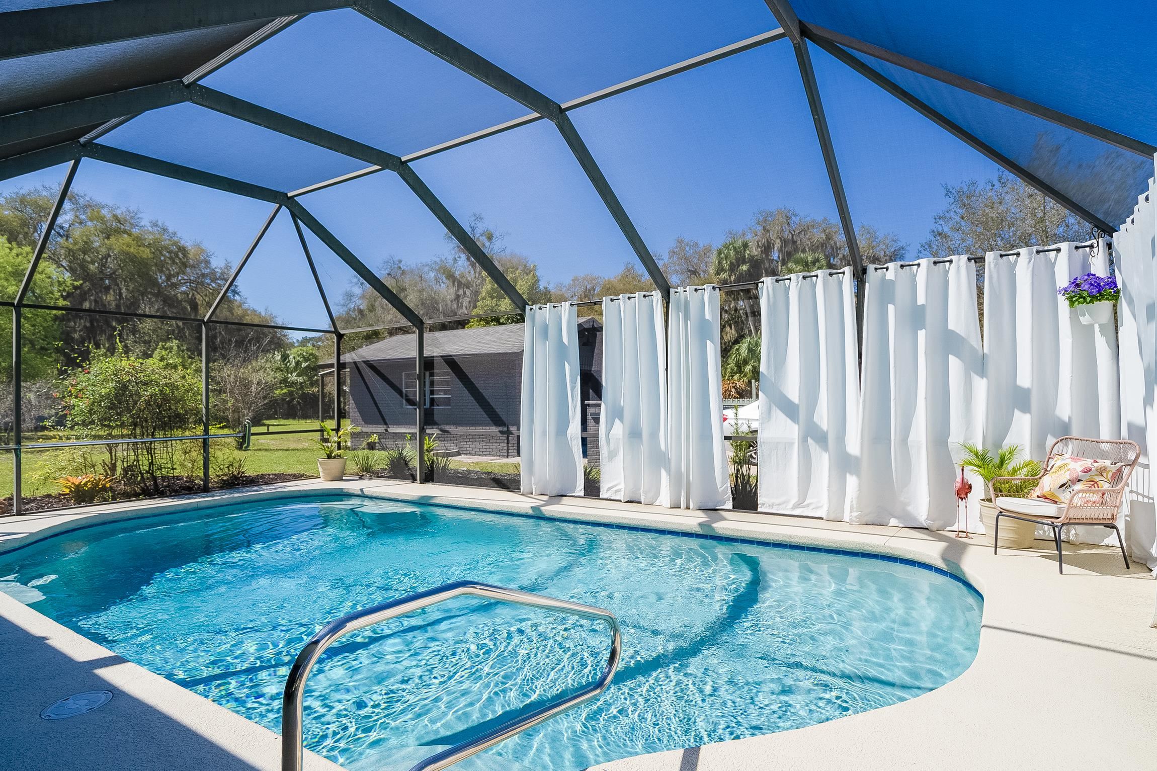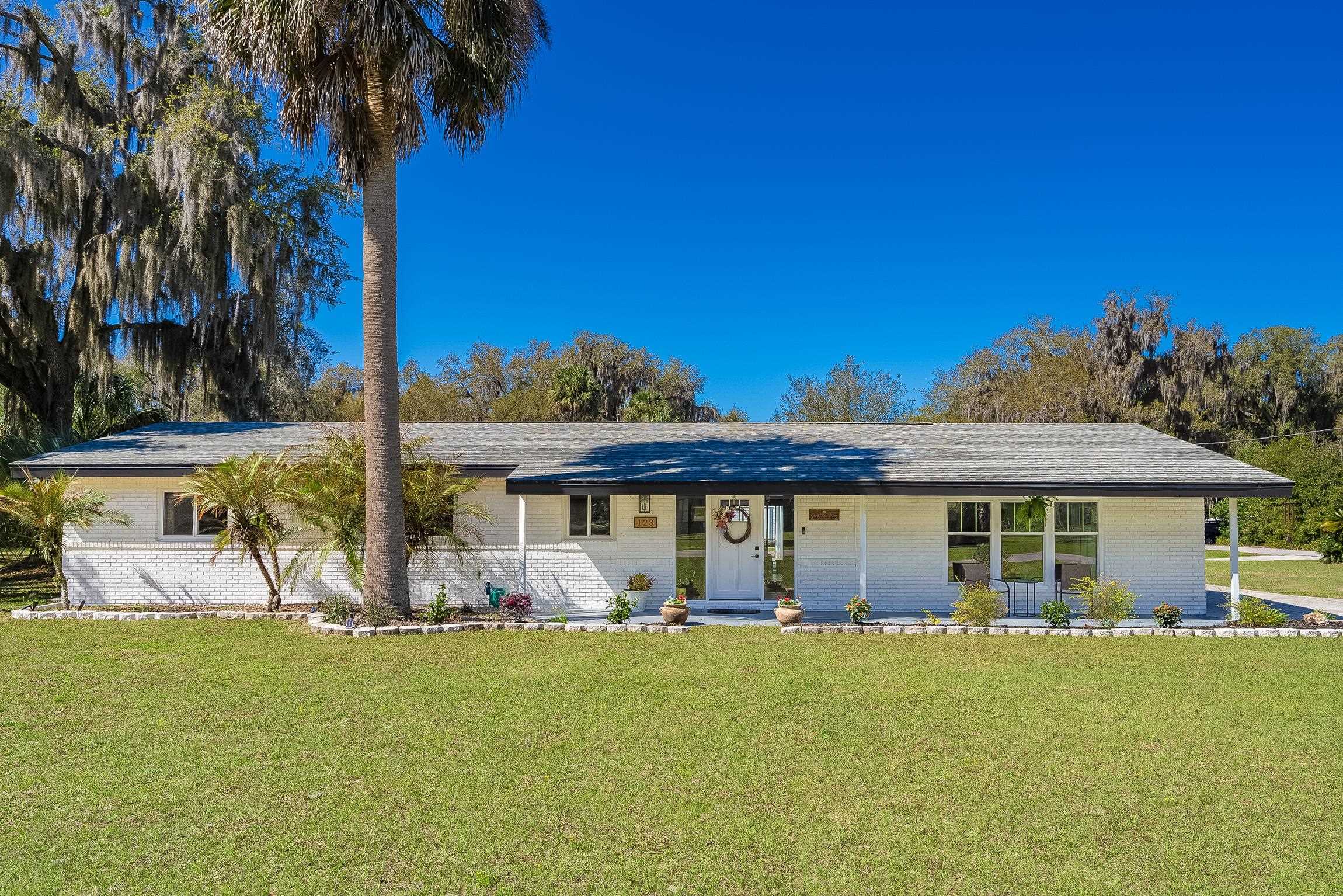 From the outside, this sweet mid century modern ranch looks like an inviting cottage but step inside this spacious, lovingly renovated 3-bedroom, 2-bath home and be prepared to be wowed! With approximately 2500 square feet of inviting living space, 123 Esperanza Grove Road offers a serene and beautiful setting for your dream retirement or busy family. Originally built in 1963, this property seamlessly blends timeless charm with modern upgrades. The updated kitchen and dining area features all new LG appliances, custom tile backsplash, custom dish cabinet, cast iron ceramic deep farmer’s sink, new lighting, new LVL flooring and white shaker cabinets perfect for large family gatherings or a quiet dinner for two at the custom island. The functional U-Shaped design is a cook’s dream with plenty of well organized storage and charm. The large primary suite offers plenty of room with a separate space that is currently used as an office but could also be a private sitting area exercise space. Complimenting this space is a beautifully-updated en-suite bath with custom tiled large walk in shower, and large walk-in closet. A second bedroom features a bright and beautiful sleeping area with it’s own sitting/dressing area cleverly separated by floor to ceiling curtains for extra guests, grandchildren or just a little privacy. Directly across from this room is the renovated second bath boasting beautiful shiplap, and a brand new tub/bath enclosure. The third bedroom on the opposite side of the living areas, offers another large, quiet space with three large windows that provide lots of natural light and direct access to the pool area. The current owner uses it as an art studio. The large living room provides plenty of space for relaxing and watching a movie or sports, playing a game or just relaxing and looking through the sliders to the beautiful pool area. The sunsets from this vantage point are breathtaking and on clear nights step outside to catch some shooting stars! The large laundry room offers a two year old LG washer and dryer set (included in the price), and plenty of space for a desk for paying bills, ironing center or sewing area. The custom frosted glass door allows plenty of light to enter the hallway areas, filled with interesting art. The workshop/garage is the perfect space for the DIY’er or hobbyist with a large, built in workbench, dedicated electric service, and a separate storage shed for all the extras! The property, previously part of an original citrus grove, offers 3/4 acre of land with fruit trees, a fenced in vegetable garden area, a large oak tree, and many perennials. Enjoy the peace and quiet of this home and neighborhood, just one block from the St. John’s River with a public boat ramp just 5 minutes down the road.