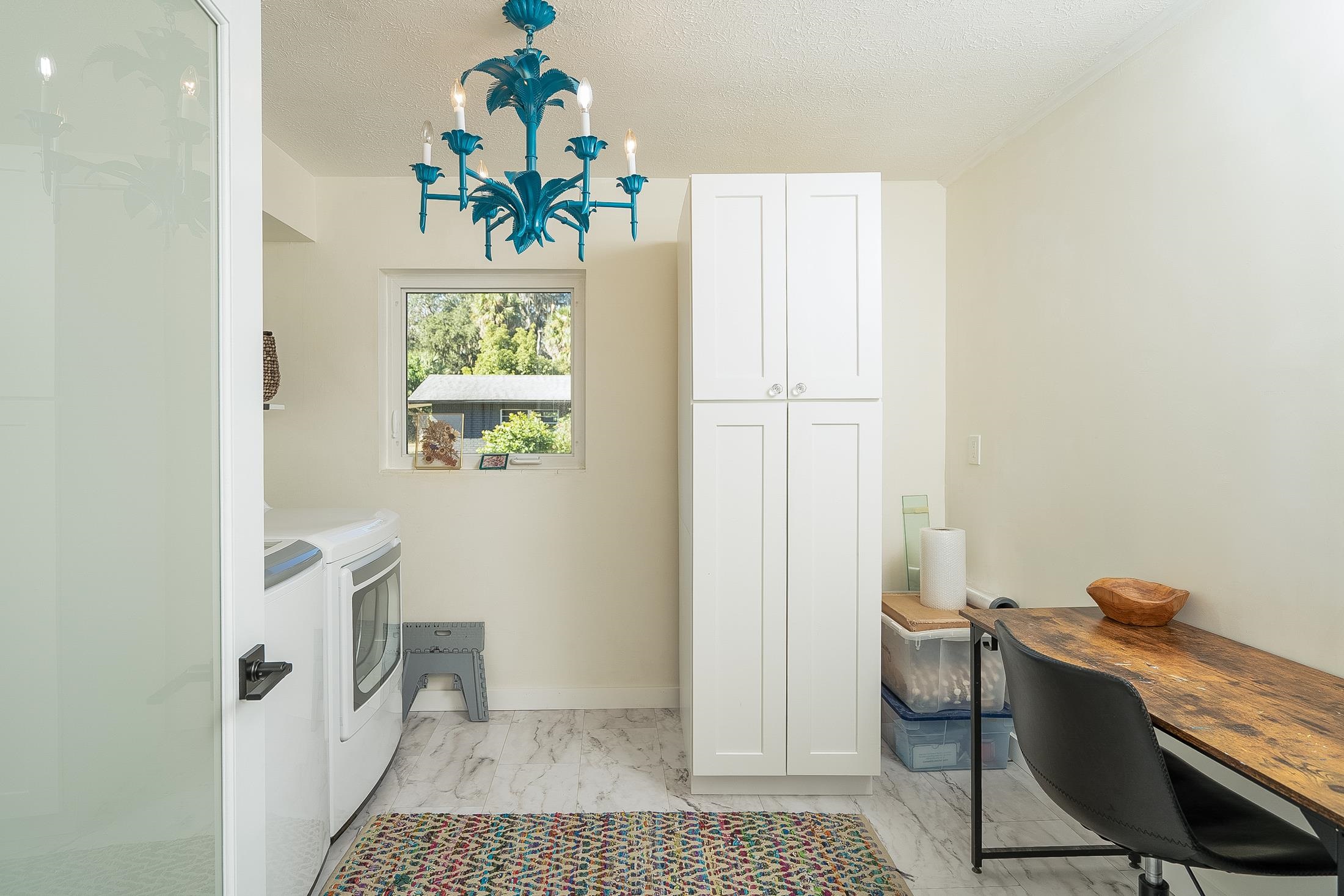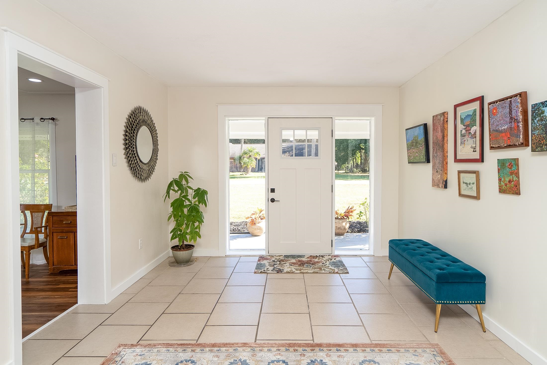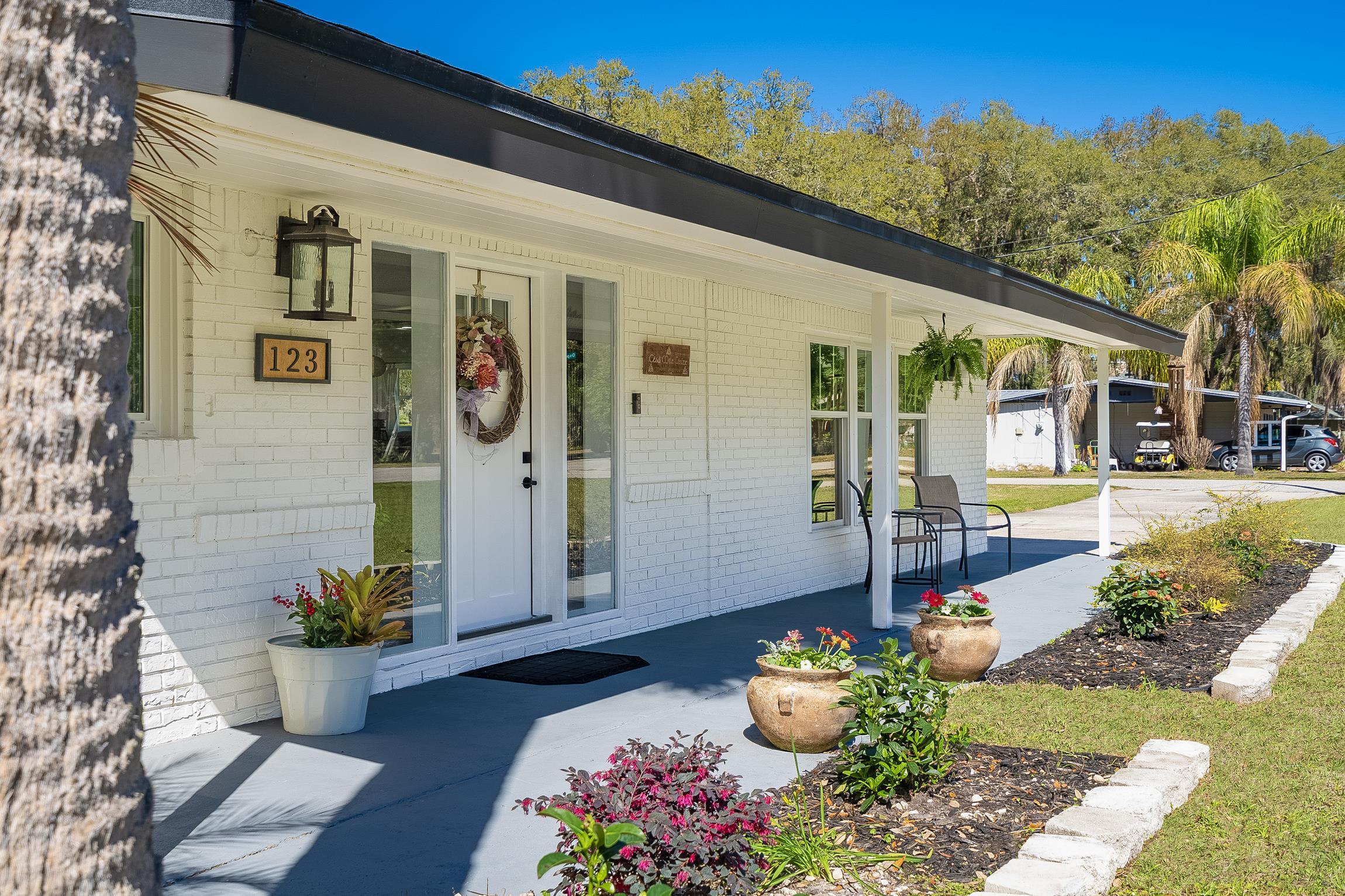 From the outside, this sweet mid century modern ranch looks like an inviting cottage but step inside this spacious, lovingly renovated 3-bedroom, 2-bath home and be prepared to be wowed! With approximately 2500 square feet of inviting living space, 123 Esperanza Grove Road offers a serene and beautiful setting for your dream retirement or busy family. Originally built in 1963, this property seamlessly blends timeless charm with modern upgrades. The updated kitchen and dining area features all new LG appliances, custom tile backsplash, custom dish cabinet, cast iron ceramic deep farmer’s sink, new lighting, new LVL flooring and white shaker cabinets perfect for large family gatherings or a quiet dinner for two at the custom island. The functional U-Shaped design is a cook’s dream with plenty of well organized storage and charm. The large primary suite offers plenty of room with a separate space that is currently used as an office but could also be a private sitting area exercise space. Complimenting this space is a beautifully-updated en-suite bath with custom tiled large walk in shower, and large walk-in closet. A second bedroom features a bright and beautiful sleeping area with it’s own sitting/dressing area cleverly separated by floor to ceiling curtains for extra guests, grandchildren or just a little privacy. Directly across from this room is the renovated second bath boasting beautiful shiplap, and a brand new tub/bath enclosure. The third bedroom on the opposite side of the living areas, offers another large, quiet space with three large windows that provide lots of natural light and direct access to the pool area. The current owner uses it as an art studio. The large living room provides plenty of space for relaxing and watching a movie or sports, playing a game or just relaxing and looking through the sliders to the beautiful pool area. The sunsets from this vantage point are breathtaking and on clear nights step outside to catch some shooting stars! The large laundry room offers a two year old LG washer and dryer set (included in the price), and plenty of space for a desk for paying bills, ironing center or sewing area. The custom frosted glass door allows plenty of light to enter the hallway areas, filled with interesting art. The workshop/garage is the perfect space for the DIY’er or hobbyist with a large, built in workbench, dedicated electric service, and a separate storage shed for all the extras! The property, previously part of an original citrus grove, offers 3/4 acre of land with fruit trees, a fenced in vegetable garden area, a large oak tree, and many perennials. Enjoy the peace and quiet of this home and neighborhood, just one block from the St. John’s River with a public boat ramp just 5 minutes down the road.