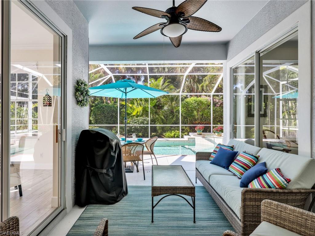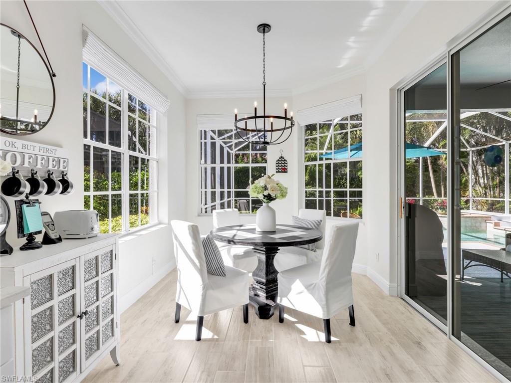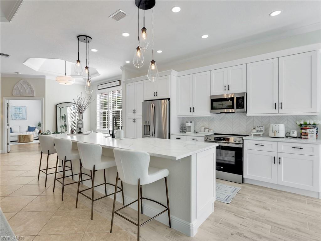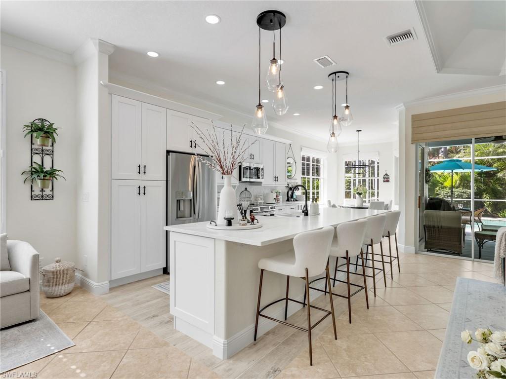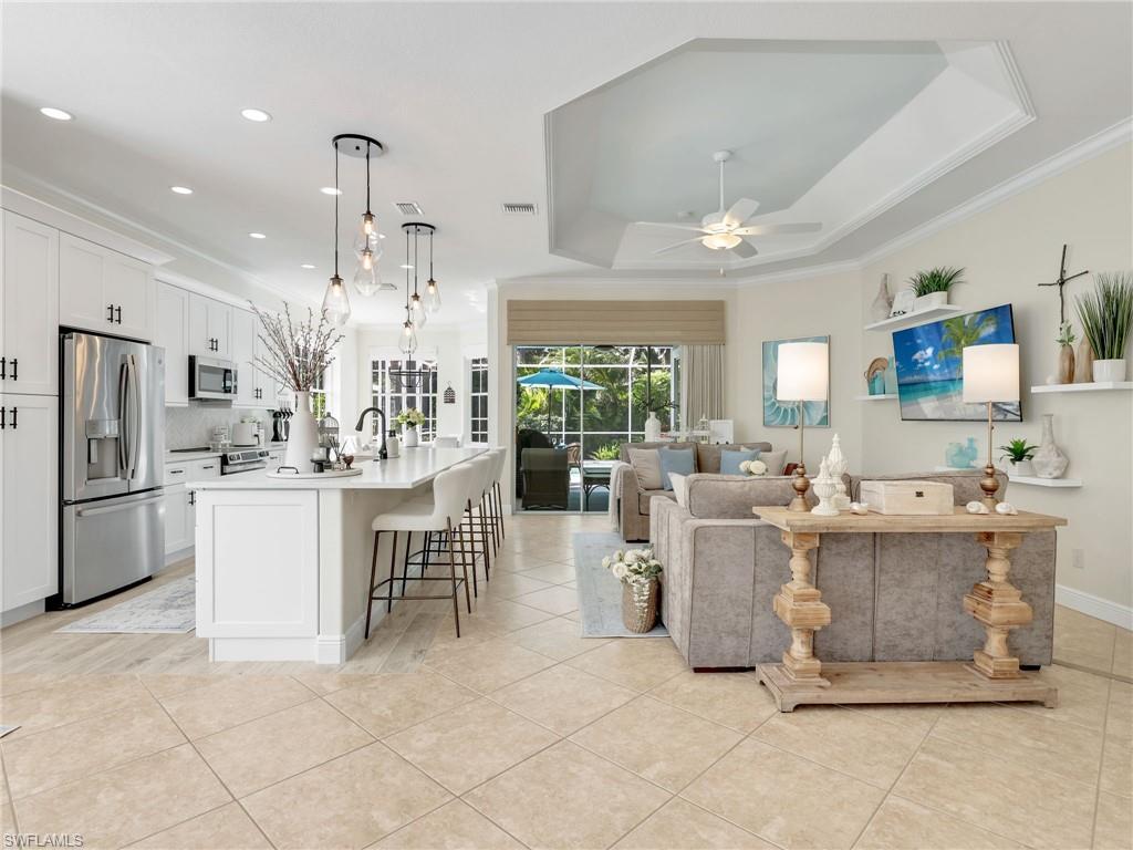 Your coastal-inspired retreat awaits tucked within Canterbury Greens at Kensington Golf & Country Club, where lush landscaping, soothing colors, and a laid-back beach-cottage vibe come together in perfect harmony. The open-air floor plan is designed around a large screened lanai with a resort-style pool, spillover spa, and a covered lounging area, all framed by fenced, tropical foliage that provides exceptional privacy and a true backyard oasis. The beautifully updated kitchen sets the tone with stylish lighting fixtures and driftwood-style flooring reminiscent of sandy shorelines, while tile flooring extends throughout the main living areas for a clean, cohesive, and easy-care finish. Offering 3 generous-sized bedrooms plus Den that can be used as a 4th sleeping area and 2 full baths, this residence provides versatile spaces suitable for work, hobbies, or quiet retreat. A two-car attached garage includes BONUS electric-vehicle charging capability. All of this in a highly desirable, central Naples location, just a stone’s throw from Waterside Shops, the area’s best dining and entertainment at Mercato, and Gulf beaches. Embrace the laid-back ease of Southwest Florida living, where resort-style comfort meets everyday relaxation.