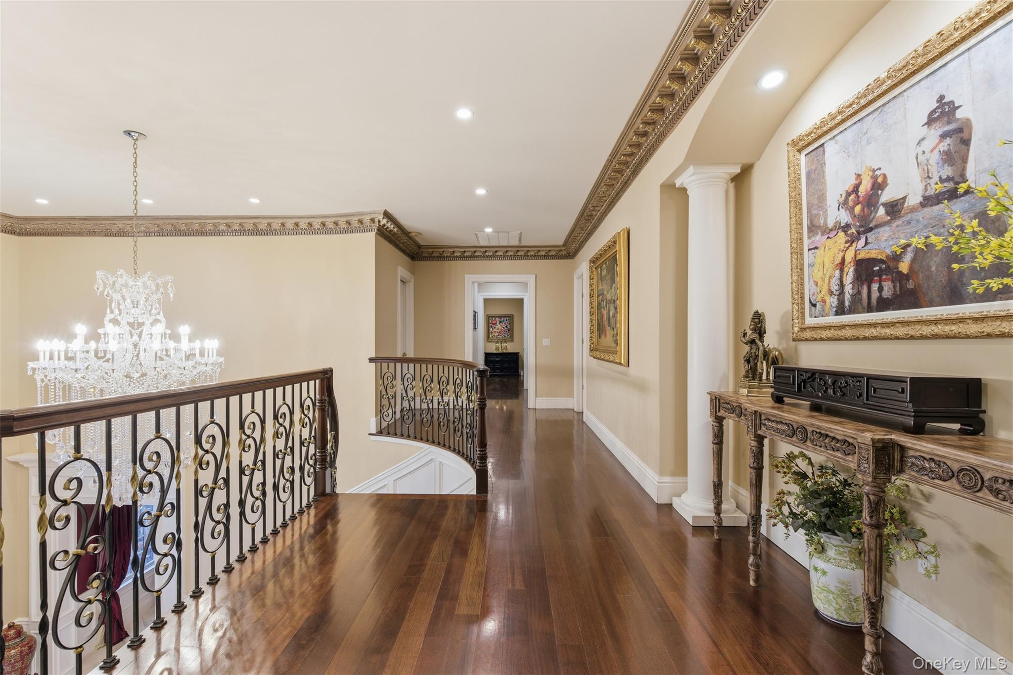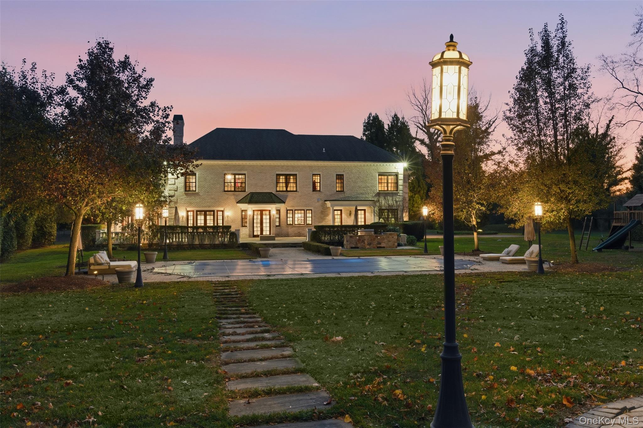 Welcome to 35 Chicken Valley Road, an extraordinary, gated estate set far off the road and approached by an approximately 825-foot private driveway entrance, culminating in a prestigious circular drive that announces arrival with quiet grandeur. Nestled within the coveted enclave of Old Brookville, this Brick Center Hall Colonial—masterfully built by the renowned Worrell Group—rests on 4. 5 acres of impeccably manicured, estate-quality grounds and offers nearly 10, 000 square feet of finished living space across all levels. The circular drive leads to a stately entryway accented by a stunning fountain, anchoring the home’s grand approach. Step inside to a breathtaking 22-foot entry foyer with soaring ceilings, intricate moldings, and refined wainscot paneling framing the sweeping staircase. The double-height foyer introduces elegant formal spaces, including a living room with a wood-burning fireplace featuring an ornamental mantel, marble inlay, and classic dental molding. Double columns guide you into the sophisticated sitting room, where French doors open to the terrace, creating effortless indoor–outdoor flow. The formal dining room is designed for grand entertaining, showcasing wainscot paneling, a decorative ceiling medallion, egg-and-dart crown molding, and exquisite millwork throughout. The renovated gourmet eat-in kitchen features top-of-the-line appliances, custom cabinetry, a large center island, and direct access to multiple outdoor dining terraces. Adjacent formal rooms—also with French doors—further connect the interior to the resort-like grounds beyond. The luxurious primary suite is a true sanctuary, offering 22-foot tray ceilings, hardwood floors, serene estate views, a private sitting room with fireplace, a custom dressing room, and a spa-inspired bath with soaking tub and double vanities. Four additional en-suite bedrooms provide exceptional comfort and privacy, ideal for multigenerational living or long-term guests. The expansive lower level elevates entertainment and wellness with a billiards lounge, wet bar, sound-proof private screening room, 3, 100-bottle wine cellar, gym, sauna, and full bath. Outdoors, the breathtaking grounds include a heated gunite saltwater pool, regulation tennis court, outdoor kitchen, sweeping lawns, and multiple blue stone terraces—offering both privacy and scale rarely found. Additional features include a three-car garage and a Generac whole-house backup generator. Ideally located in Old Brookville, close to universities, country clubs, golf, marinas, museums, farms, and premier North Shore amenities, and situated within the award-winning North Shore School District.
