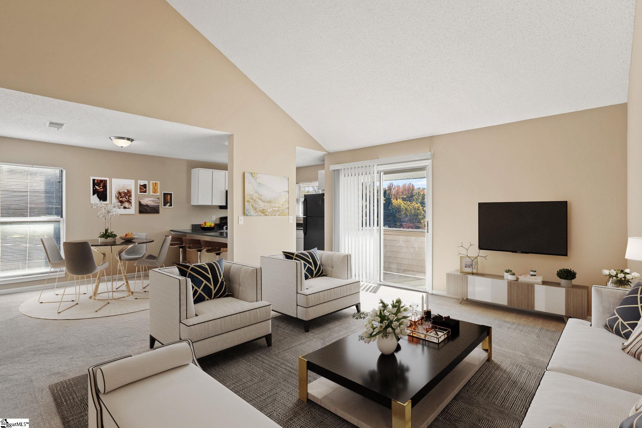 There is so much to love about this spacious, 2 bedroom, 2 bath updated, end unit condo! As you enter the condo you will be impressed by the large, open-concept living room featuring vaulted ceilings and filled with natural light. Just off the living room, large glass doors lead to a private balcony and outdoor storage closet. The kitchen/dining room offers space for entertaining with an oversized counter/bar and additional pantry storage. Thoughtfully designed split floor plan features oversized bedrooms, walk-in closets, full baths, ceiling fans and in-unit washer & dryer. A private entrance provides added convenience and privacy. . . perfect for a roommate or home office. Court Ridge boasts an in-ground pool, covered picnic/grill, well maintained landscaped common area and plenty of parking. The community HOA covers the cost of water, sewer trash, pest treatment, lawn care, exterior upkeep and pool maintenance, offering maintenance free living. You will enjoy living in this beautiful, convenient location, adjacent to Furman University and close to shopping, dining and recreation. Just minutes from the town of Travelers Rest (honored as one of "The South's Best Small Towns"), Downtown Greenville and The Swamp Rabbit Trail (a 28-mile walking/biking greenway that traverses the Reedy River and connects Travelers Rest with the City of Greenville. ) First-time buyer? Investor? Downsizing? Starting over? This move-in ready condo checks all the boxes! Schedule a showing today! Some photos virtually staged.