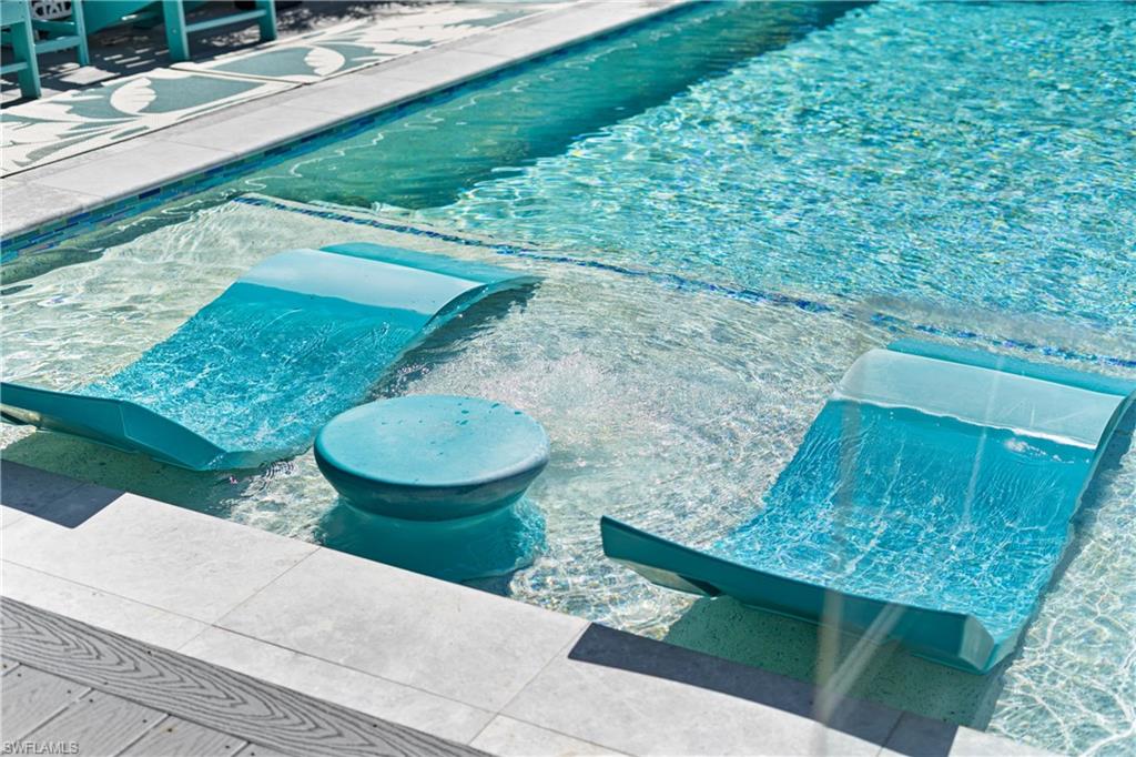 The pool area is a true highlight—this custom-designed above-ground “walk-in” pool eliminates the need for stairs and offers immediate access to a sun shelf for effortless enjoyment. An impact-glass banister adds a touch of modern elegance, while Azek decking and lush, low-maintenance landscaping create a private, resort-style retreat. The saltwater pool features both heating and cooling systems for year-round comfort.