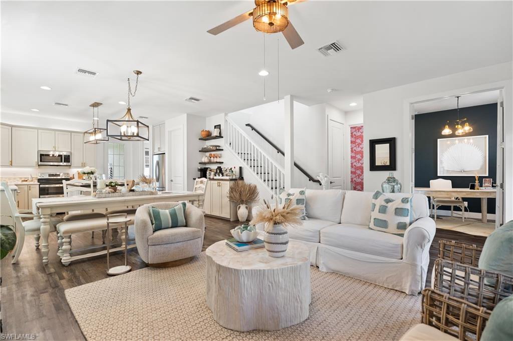 Inside, an open-concept layout creates effortless flow between the living room, dining area, and chef-inspired kitchen—perfect for entertaining or relaxing with family and friends. The main level features a serene primary suite, a versatile office or fourth bedroom, a stylish powder room, and a spacious walk-in laundry room with valuable storage beneath the staircase.