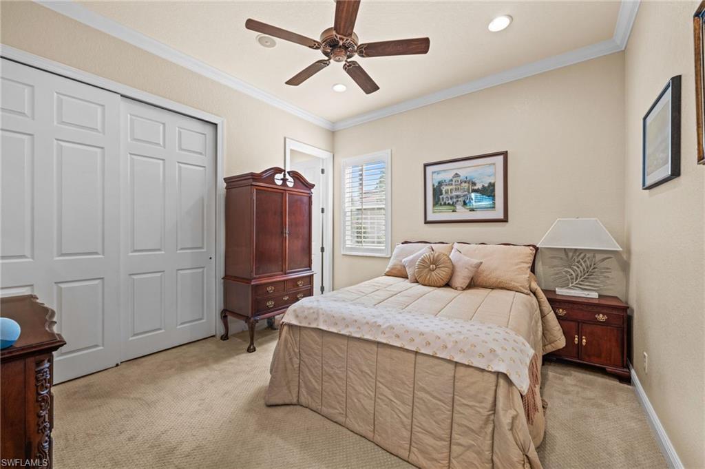 The open-concept layout is enhanced by plantation shutters, intricate accent moldings, and impact-resistant windows that flood the home with natural light. The home also features upgraded upscale iron doors at the entry, pool bath, and master bedroom exit to the lanai—adding a bold architectural accent and enhanced security.