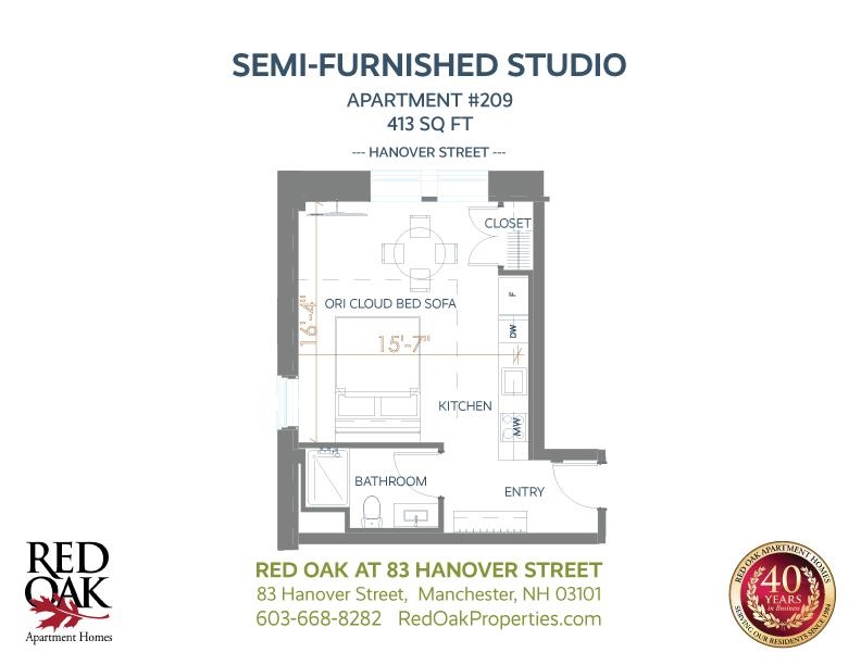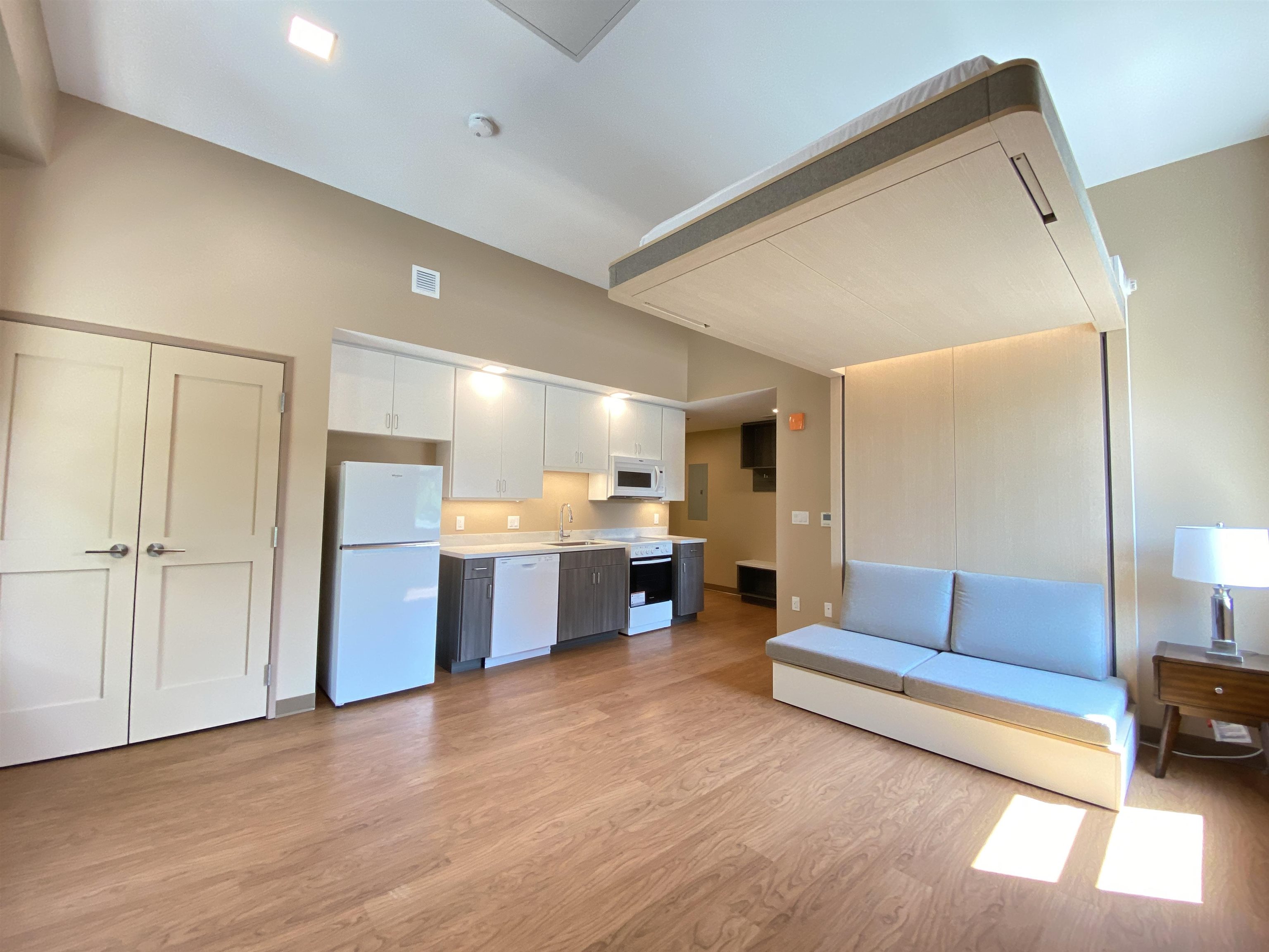 Apartments at 83 Hanover Street 83 Hanover Street, Manchester NH ALL UTILITIES INCLUDED IN THE RENT! No Security Deposit Required Enjoy a partially furnished Robotic Bed in your studio. Press a button and the Queen sized bed comes down from the ceiling. During the day it raises to the ceiling to provide you with a large living room space. You get a partially furnished apartment that saves space and saves you money! FEATURES: Apartment Amenities • Keyless Entry • Central Air & Heat • Microwave • Dishwasher • Solid Surface Countertops • Wood Style Flooring Throughout • High Ceilings • Built-in Coat Rack and Bench • Bathroom has oversized stand-up shower and beautiful vanity • USB Outlets • In-home WiFi • Cat Friendly Community Amenities • 24-Hour Emergency Maintenance • Public transportation is just steps from the door • Video Surveillance in Common Areas Work Orders Conveniently placed Online • Trash Removal • Optional Fitness Center • Elevator • 25% Discount on the monthly rental of an office space across the street at Red Oak Coworking • Non-smoking • Laundry Room on each floor • Laundry Payment System • Parking Garage Option • Arts & Theatre District Location – Across from Palace Theatre Green Amenities • LED Lighting • Energy Star Appliances • Energy Efficient Windows All These Utilities are Included in the rent: • Electricity • Heat • A/C • Hot Water • Basic In-home WiFi • Water & Sewer Broker/Owner
