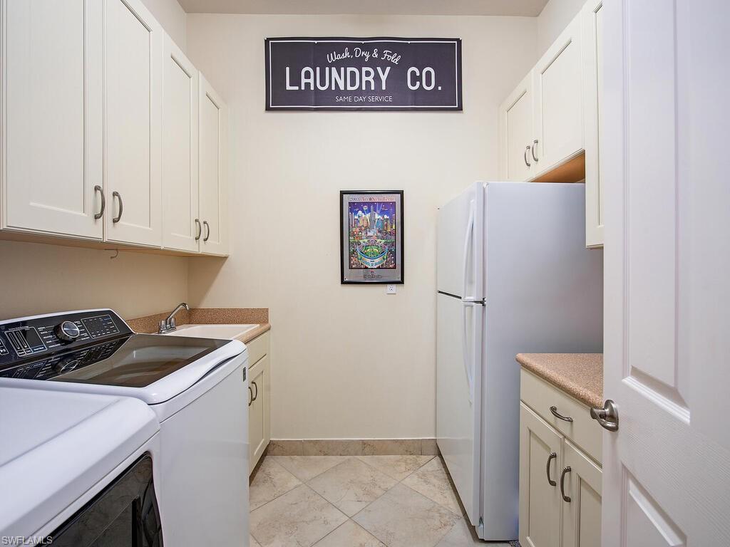 Behind the gated courtyard of this thoughtfully curated Carlyle lies a home designed for effortless living & unforgettable entertaining, where every day feels like a vacation. The interior has just been freshly painted, creating a crisp, inviting backdrop that complements the home’s refined finishes & sunlit spaces. Step through decorative glass entry doors into an expansive, entertainer’s dream layout, where the wet bar, great room, flexible dining area, and gourmet kitchen flow seamlessly to the outdoors. A sparkling lake view beckons you to the screened lanai, which offers ample room to relax or dine alfresco. Spend your days lounging by the saltwater pool, then prepare dinner in the outdoor kitchen—equipped with marine-grade cabinetry, a sink, granite surfaces, dual burners & a 60, 000 BTU wok-capable burner, all powered by a buried 120-gallon propane tank. Inside, no detail has been overlooked. The chef’s kitchen features upgraded white cabinetry, granite counters, a newer GE Café four-door refrigerator, double wall ovens, newer microwave, range with vented hood, custom pull-out shelves & a professionally painted island. Glass atrium doors with side panels enclose the dining space, adding elegance & allowing for flexible usage. The luxurious primary suite overlooking the lake includes dual custom closets, a serene sitting area & a renovated spa-like bath. The primary bath has been updated with a newly tiled walk-in shower with linear drain and new fixtures. Vanities feature new quartz counters, professionally painted cabinetry, framed mirrors & Rohl sinks. Both guest suites offer private baths & walk-in closets. One ensuite bath includes a remodeled shower with frameless glass doors & new tile. The versatile club room adapts to your needs—ideal as an office, den, or media space. Additional highlights include 18" porcelain tile throughout, plantation shutters, crown molding, Hunter Douglas Luminette sheers & built-in closets. A well-appointed laundry room offers a newer GE Profile washer and dryer, abundant cabinetry, a laundry tub, and a secondary refrigerator. The garage is equally refined with epoxy floors, insulated doors & built-in storage. Peace of mind comes standard with impact glass throughout, a Ring doorbell, fenced yard for pets, and a generator transfer switch. Additional upgrades include a new whole-house water softener system, UV lights on the A/C, & landscape lighting. Riverstone offers a vibrant, vacation-inspired lifestyle for all ages. Located in North Naples, just minutes from I-75 and zoned for "A"-rated schools, the community features a fitness center, social hall, resort-style pool, lap pool, spa, five lighted tennis courts, outdoor basketball and pickleball, a full indoor basketball court, tot lot, children’s water play area, game room, and an activities coordinator; making it easy to meet new friends. Whether hosting, relaxing, or simply enjoying the view, this home delivers the ideal setting for your Naples lifestyle.