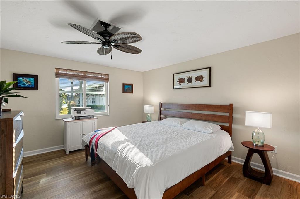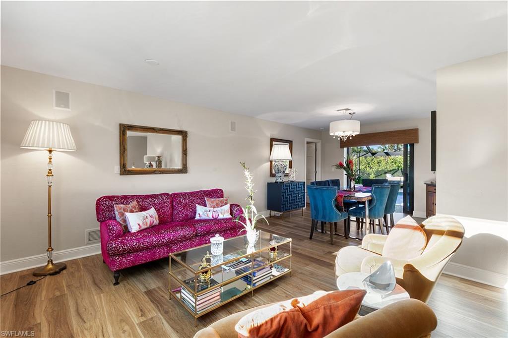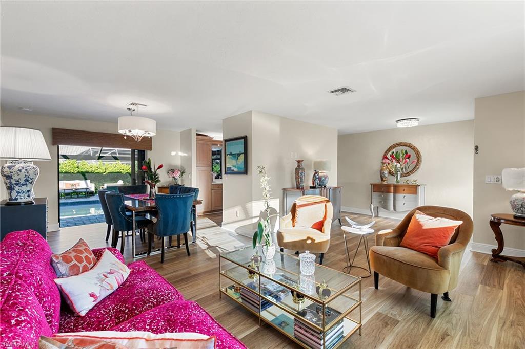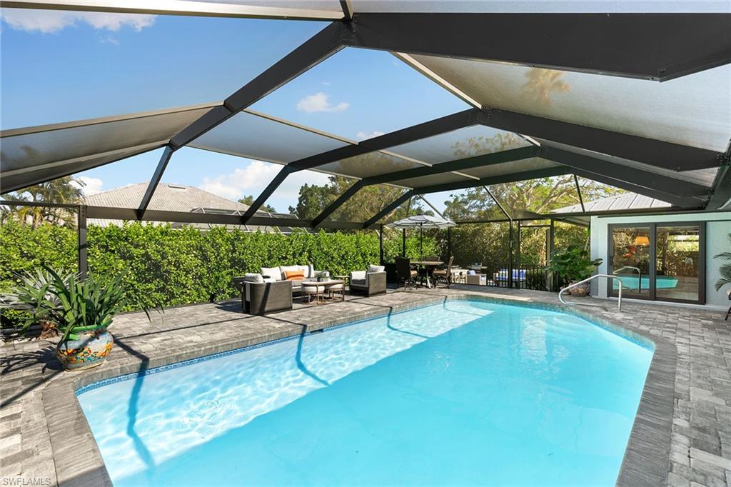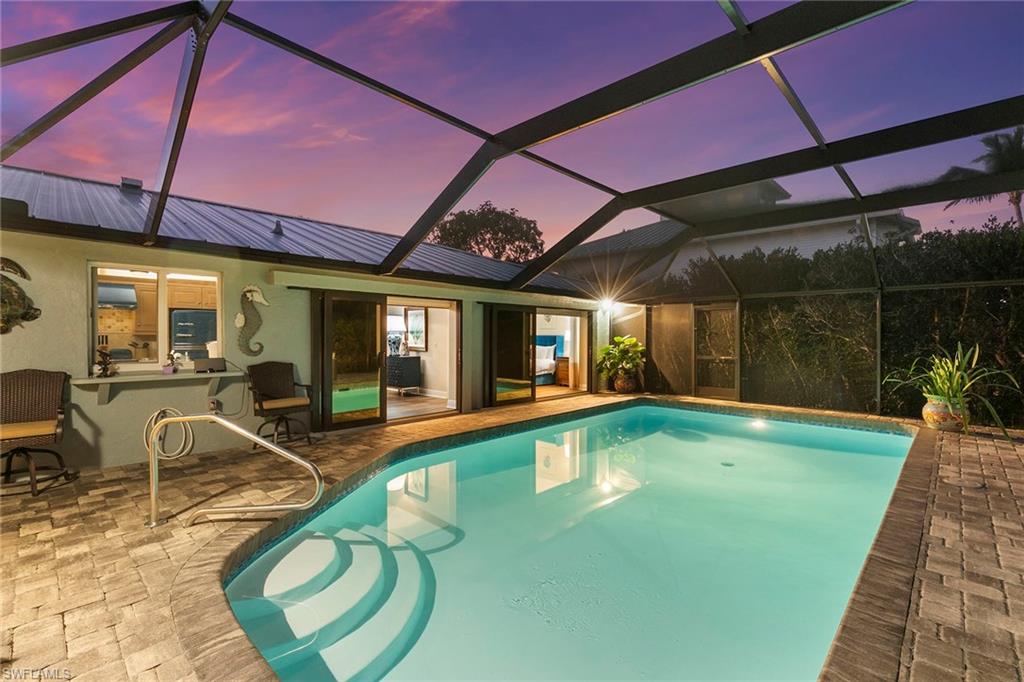 This beautifully updated island residence offers fabulous outdoor living space and is conveniently near renowned beaches, shopping and dining in the desirable Tigertail neighborhood of Marco Island. The thoughtful floor plan features a primary bedroom for privacy at one end of the home, with two additional bedrooms in a separate wing for guest comfort. There are two full baths, as well as distinct living and family rooms. Custom blinds have been installed throughout the property. The kitchen has been modernized with Big Chill appliances. The home boasts numerous upgrades including a new air conditioner (2019), metal roof (2020), hurricane-impact glass windows and doors (2021), and a hurricane-rated garage door (2022). Elegant honey oak luxury vinyl plank flooring provides a coastal aesthetic with a contemporary finish. The expansive outdoor area is designed for entertaining, featuring a newly added, large rear paved patio and a state-of-the-art Buzz Off system. The updated pool area includes a resurfaced oversized pool and full panoramic screens. Lush tropical landscaping surrounds the property, and the yard is enclosed with a wrought iron fence, ideal for children and pets. There is also the potential for an additional quarter-acre expansion. Experience a seamless transition to the Island lifestyle in this exceptional property, a rare opportunity and a must-see.
