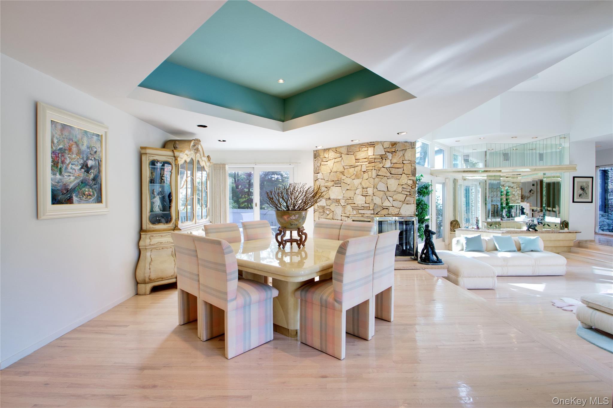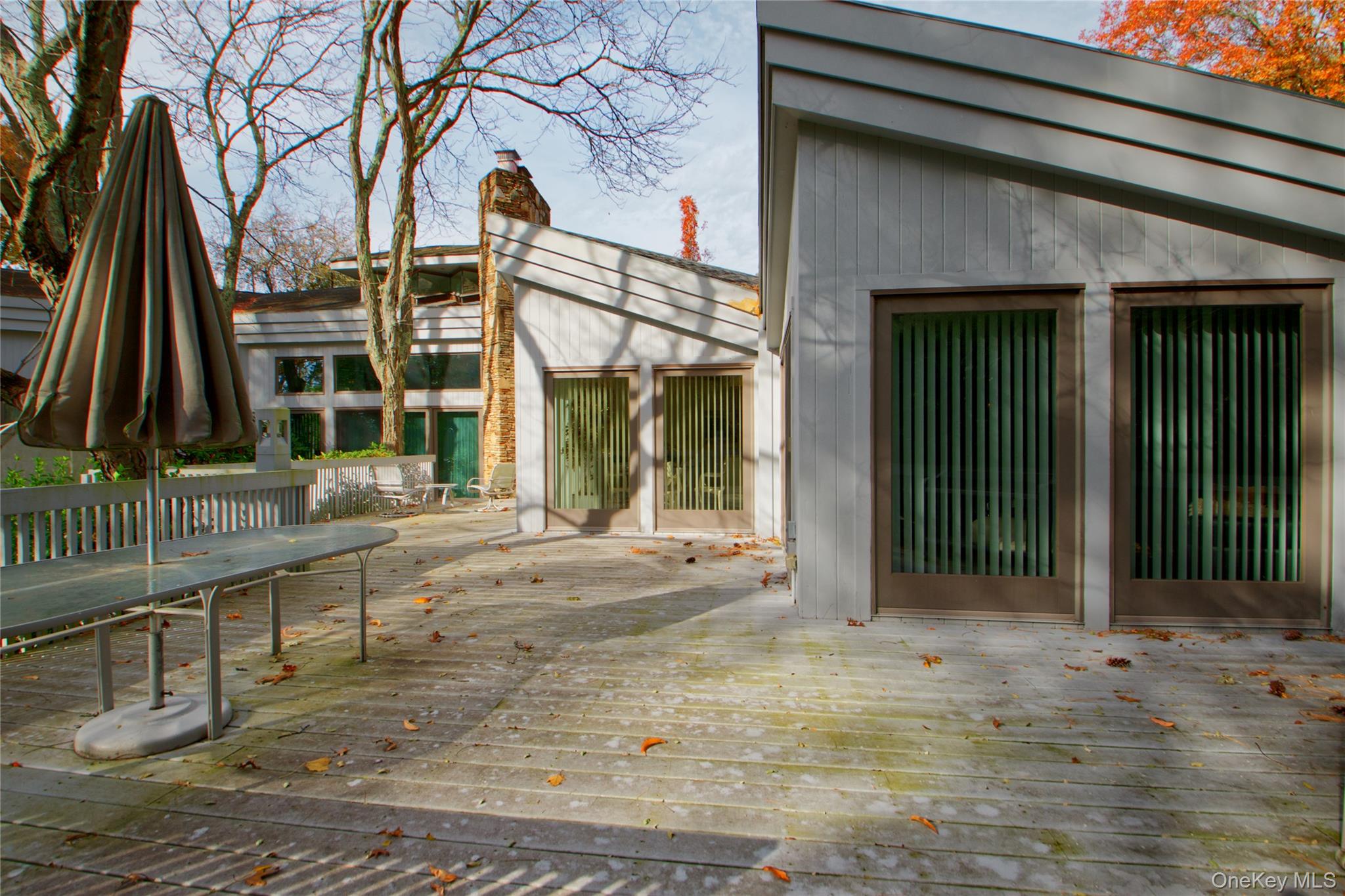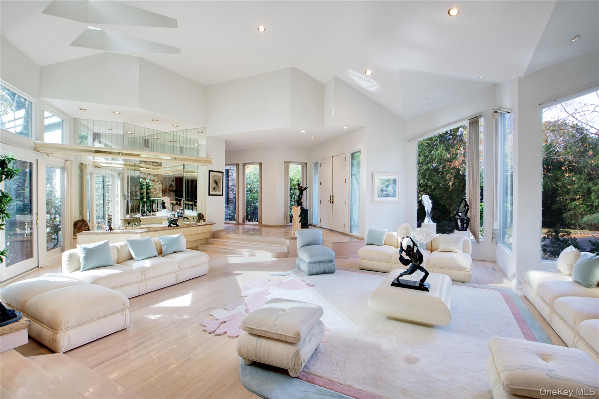Tucked at the end of a quiet cul-de-sac, this timeless contemporary sits on two perfectly level acres offering exceptional privacy and a deep, usable yard. The property features an in-ground heated pool with a waterfall and beautiful outdoor space ideal for gatherings or relaxation. Inside, the home provides plenty of opportunity with its dramatic ceilings and walls of glass that create a bright, open feel throughout. The sunken living room flows into a dining area with a wet bar. The first floor includes a spacious primary suite, a dedicated home office, and both formal and casual living areas—all thoughtfully laid out and generously proportioned. With its solid foundation and impressive architectural details, this home offers an incredible opportunity to update and customize to your personal style.