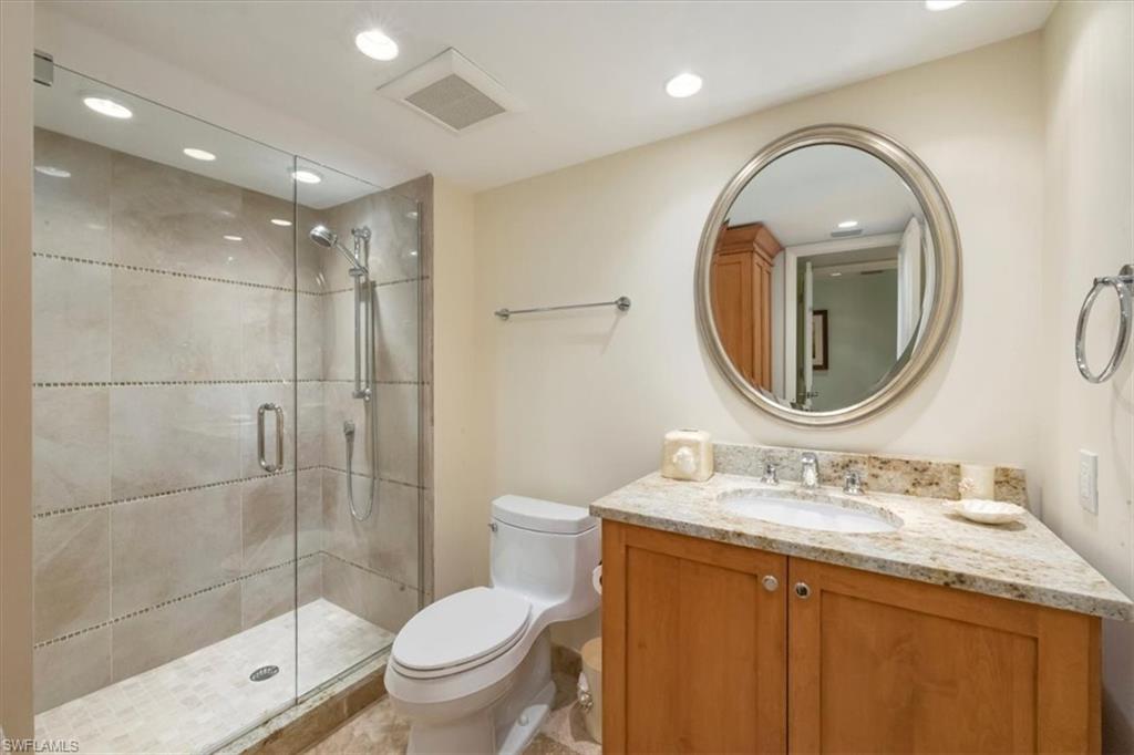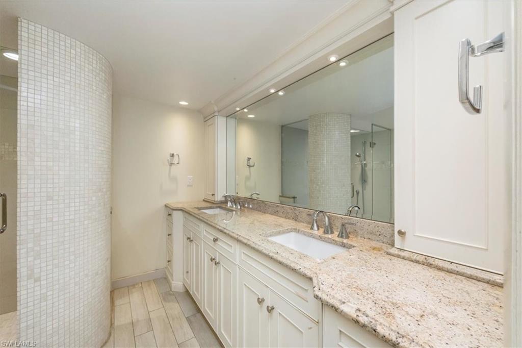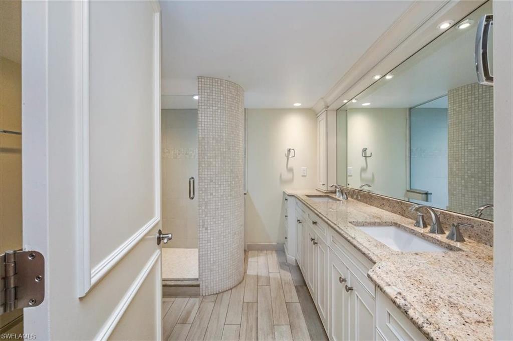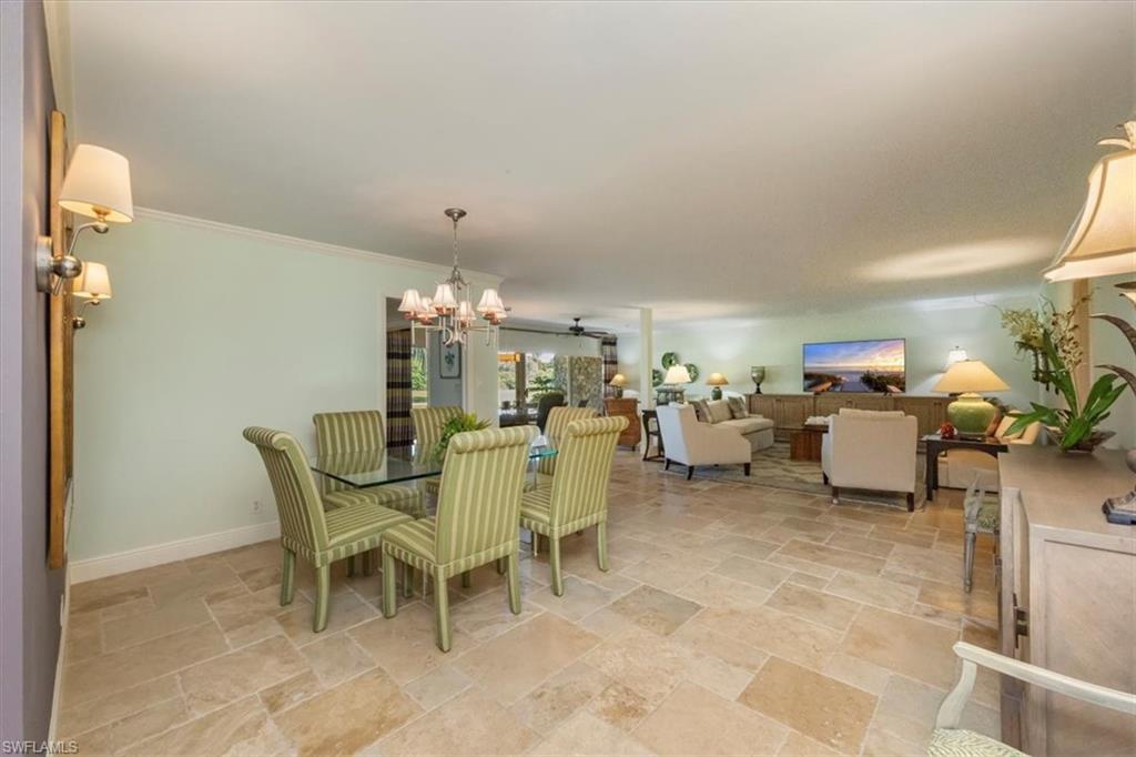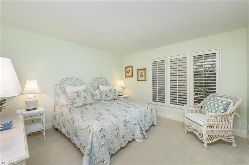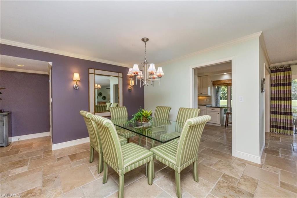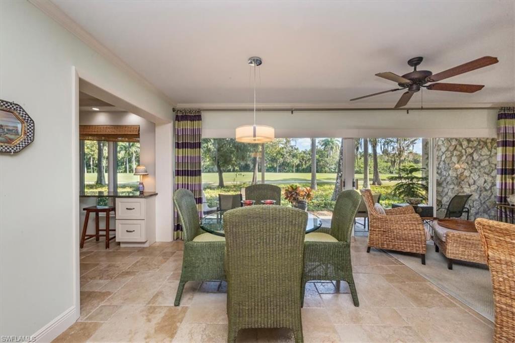 Welcome to the prestigious Wilderness Country Club—a premier golf community in the heart of Naples, known for its exceptional service, lush natural surroundings, and abundant wildlife. This meticulously remodeled first-floor residence features two bedrooms and two full baths, offering the perfect blend of modern luxury and Florida charm. Enjoy picturesque golf course views right from your private patio—an ideal spot to relax, entertain, and appreciate the peaceful beauty of nature. Inside, the light-filled open-concept floor plan highlights a stunning gourmet kitchen with upgraded granite countertops and backsplash, custom built-ins, ivory raised-panel cabinetry, and stylish light luxury tile flooring. Additional enhancements include impact-rated sliders and tastefully neutral finishes for a bright, timeless aesthetic. The spacious primary suite is a true retreat—boasting an expansive spa-like bathroom with custom built-in cabinetry, a beautifully tiled walk-in shower with seamless glass, impressive lighting, and a full-size laundry room for added convenience. This condominium includes your own golf cart and a private golf cart garage located adjacent to your reserved covered parking space. This gated paradise is an Audubon Cooperative Sanctuary set within a 200-acre forest with stunning landscaping and mature trees overhanging roadways. Wilderness Country Club offers a spectacular state-of-the-art clubhouse, driving range and practice green, 5 saltwater pools, 4 Har Tru tennis courts, bocce courts, croquet, and a dog park. It is located minutes away from charming shopping and dining at 5th Avenue and Old Naples and a mile to white sand beaches. Purchase of a Wilderness Country Club membership is required and immediately available.