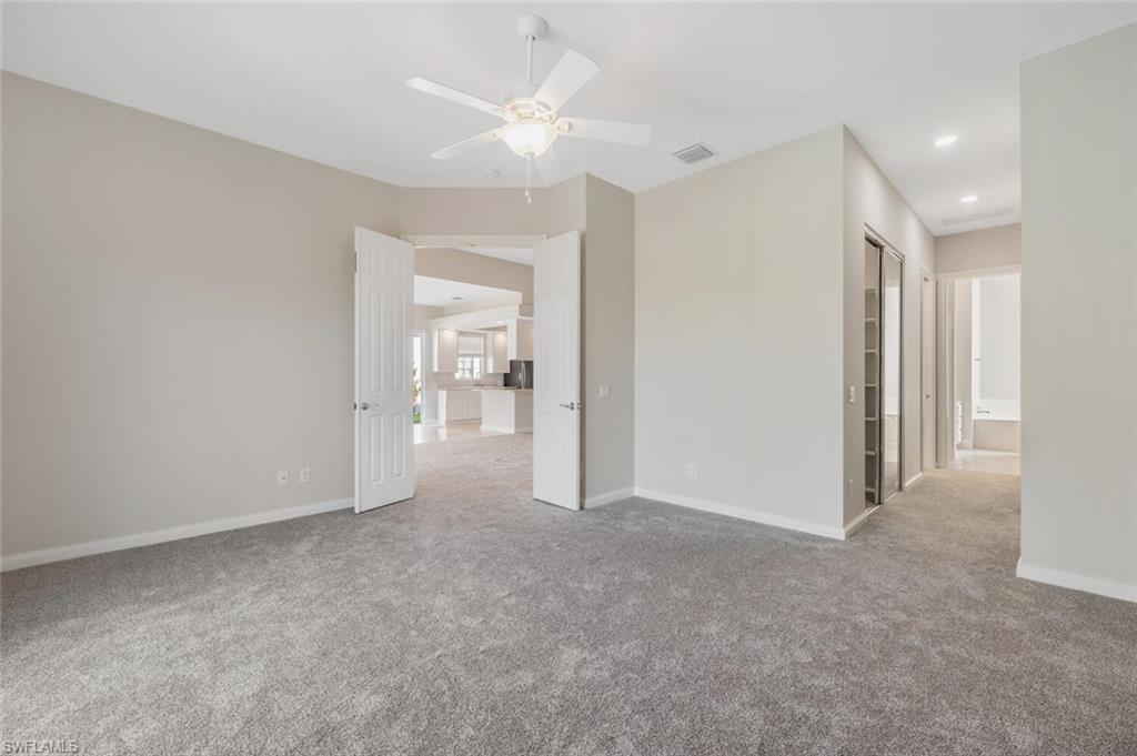 Beautifully updated Oakmont model with a lake view, heated pool, and desirable NE-facing lanai offering morning sun and shaded afternoons. This 3 bedroom + den, 2. 5 bath home has been significantly improved with a new roof (2020), A/C (2020), hot water heater (2022), full exterior paint (2022) and interior paint (2023). The kitchen features a 2023 LG stainless appliance suite including an air-fryer range and 3-rack dishwasher. New luxury plank flooring and upgraded carpet with memory foam padding (2023) give the home a fresh and comfortable feel. Additional upgrades include new fixtures, fans, lighting and an epoxy-restored master shower. The screened lanai offers a peaceful water view with a heated pool and year-round usability thanks to ideal exposure. Hurricane panels included. Short walk to the Verona Walk Town Center and amenities. Move-in ready with no deferred maintenance.