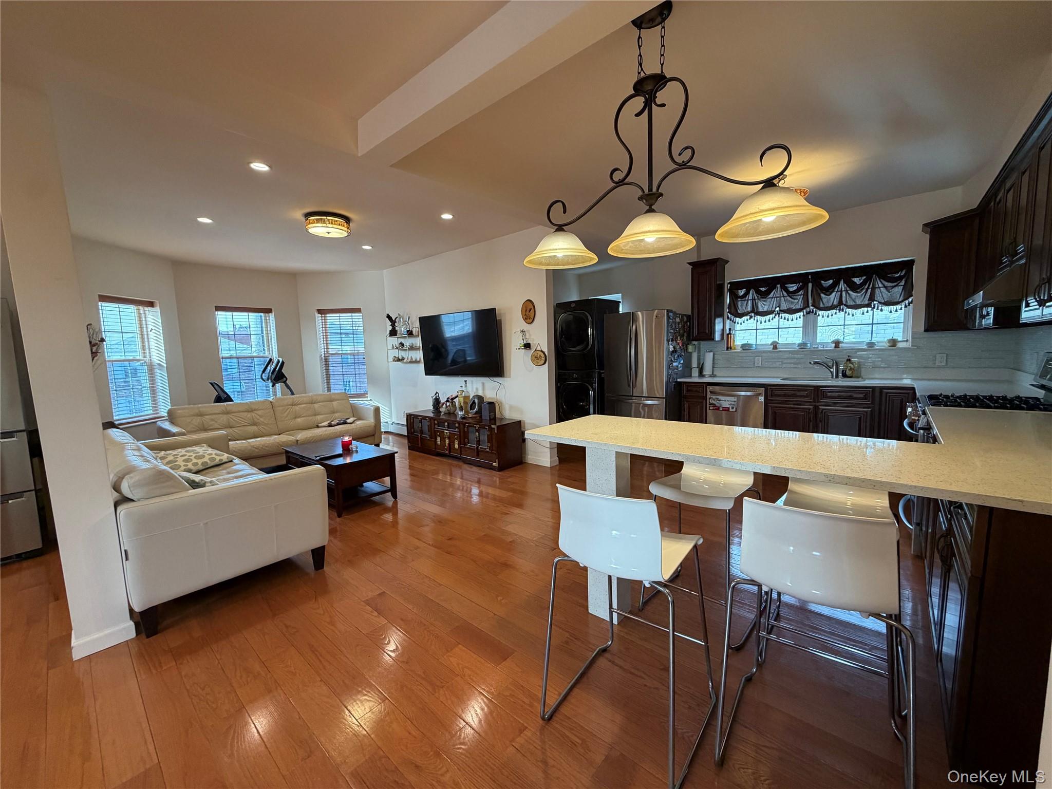 LOCATION LOCATION LOCATION !!!!! PROPERTY located at RIGHT BY NORTHERN BLVD !!! PRIME LOCATION !!! Welcome to rare, spectacular TWO family home (partial zone for , R5B , C2-2 ) EXTRA spacious layout for both 1st floor : 3brs 2bath and 2nd floor : duplex 3br 2bath apartments . master bedroom has private balcony , roof top balcony with view of prime flushing. RIGHT cross from H MART shopping center , lots of Korean restaurants, bank , near all . one of best convenient location in flushing . Transportation : walk to LIRR , Many bus line Q66 , Q102, Q104, Q101. Full Finished basement(heated floor ) , full size of house very spacious , Half Bath , family room, Access To Backyard 1st floor : 3Brs, 2Bath, Huge Living room, Kitchen spacious all three bedrooms 2nd Floor : Duplex 3br 2bath , 2 Brs, spacious living room , Kitchen, 2 baths Balcony 3rd FL with spacious bedroom two windows , access to roof top balcony . Both apartment has top quality of oak floor through , many window bring lots of sun lights. one car garage with long driveway (can park 4 cars) House totally RENOVATED in yr 2014. Roof , heating system , boiler . . .