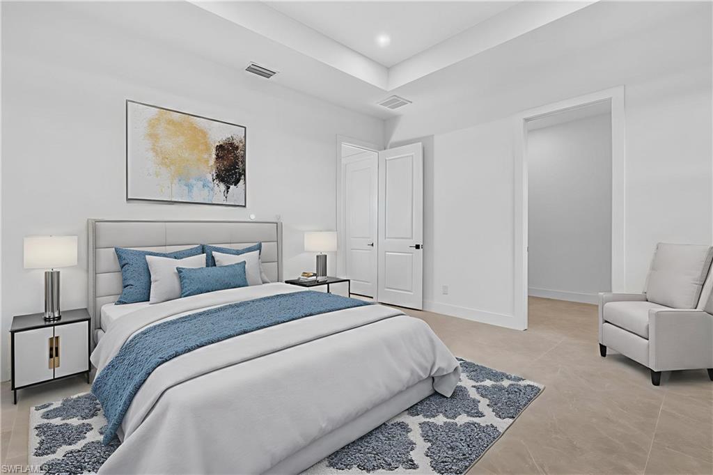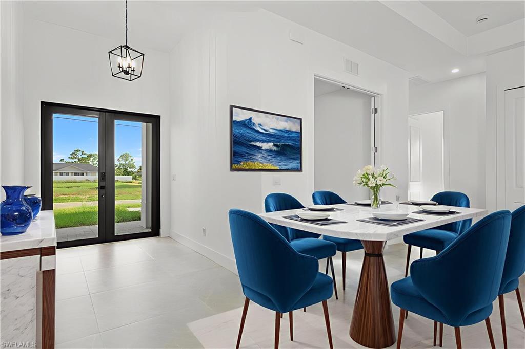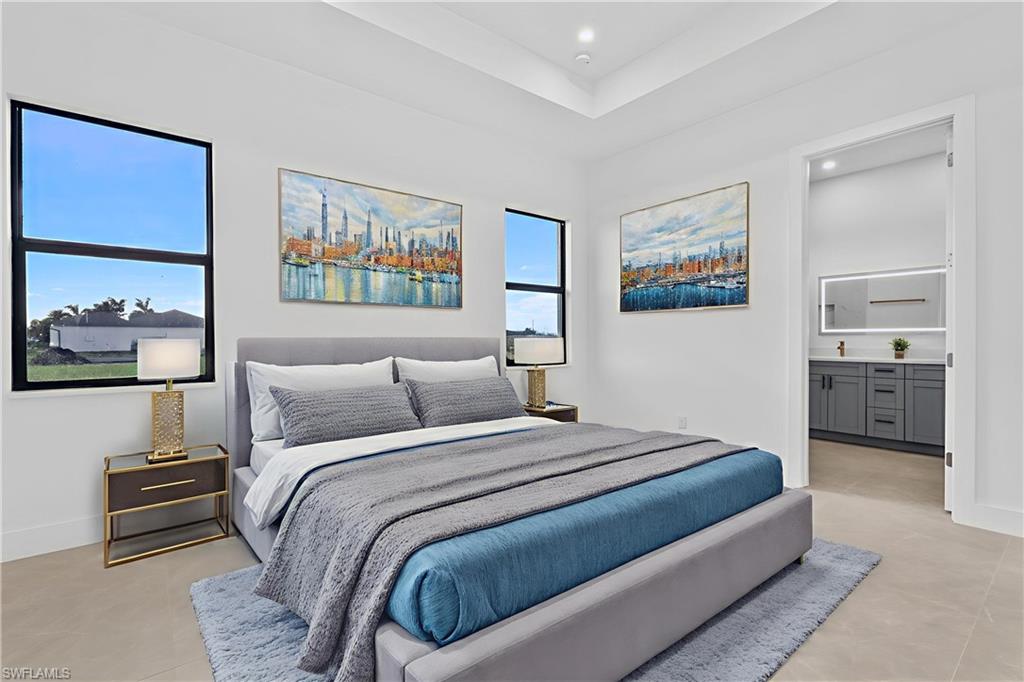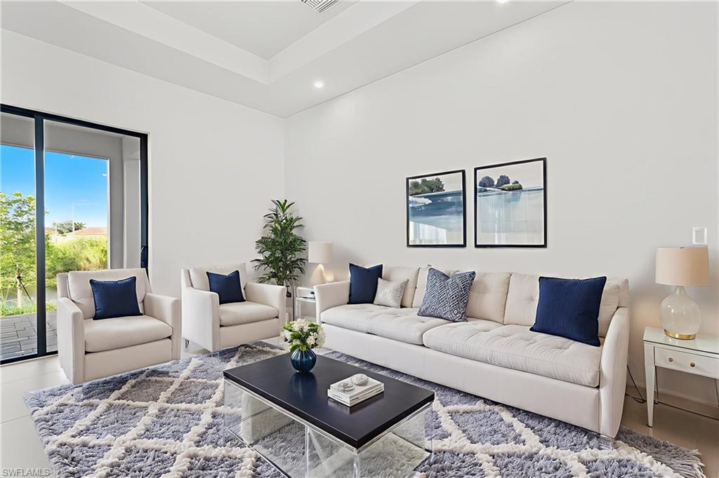 BRAND NEW WATERFRONT HOME - PRICED TO SELL - WITH DESIGNER UPGRADES! Step inside the this stunning new construction home and enjoy the best of waterfront living with the perfect blend of luxury! Featuring premium upgrades, HIGH CEILINGS, sleek PORCELAIN TILE FLOORS throughout, high-IMPACT WINDOWS AND DOORS and NO FLOOD INSURANCE needed, the open-concept design creates a bright and spacious living area. With 3 bedrooms, a versatile den, and 2 beautifully designed bathrooms, this home offers ample space to suit your needs. TRAY CEILINGS In the living room and primary bedroom. The high-end bathrooms boast top-of-the-line brass fixtures and finishes, quartz vanities, providing a spa-like retreat in the comfort of your own home. The kitchen has a large island with waterfall QUARTZ COUNTERS with wood slat accents, stainless steel appliances, and refined pendant lighting - perfect for entertaining and your culinary needs. Enjoy breathtaking canal views from your backyard, offering a serene waterfront setting. The built-out laundry room includes extra cabinets for added storage and convenience. PAVERED driveway, walkway, lanai! With a two car garage for your vehicles and extra storage, this home truly offers the best of both worlds—modern comfort and natural beauty right at your doorstep. Located just minutes from Pine Island Road, you'll have easy access to shopping, dining, and entertainment. Optional BUILDER UPGRADES ARE AVAILABLE: *Bedroom closets for $3, 000* * Full lot perimeter fence and gate for $5, 000* *lanai screen enclosure for $500*. Don’t miss your chance to own this exceptional home—schedule your showing today! **THIS PROPERTY QUALIFIES FOR A 1% LENDER INCENTIVE IF USING PREFERRED LENDER. INQUIRE FOR MORE DETAILS. ** Photos in this listing have been virtually rendered.