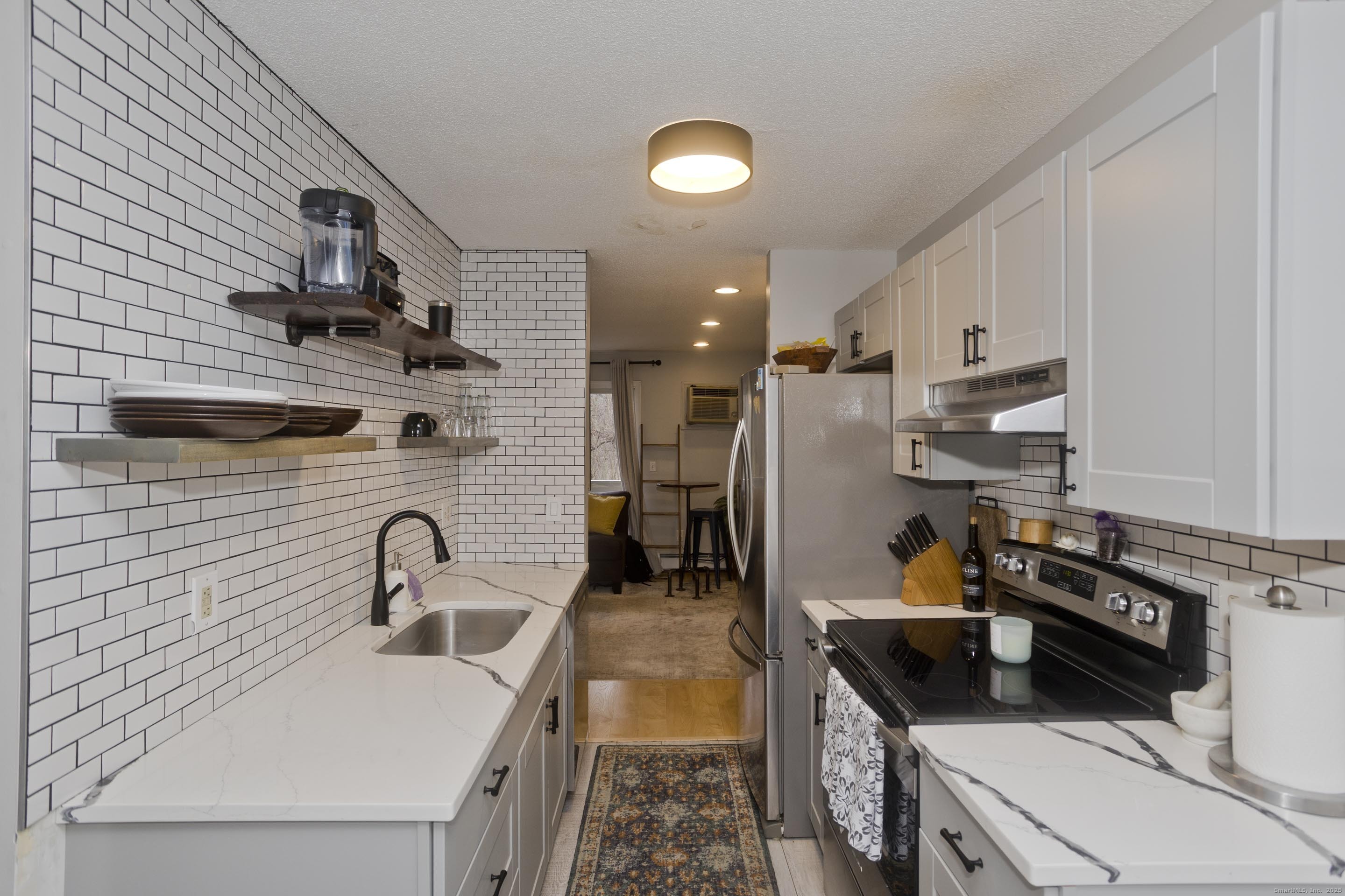 Welcome home to this stylish and conveniently located condo in Enfield. Step into the updated eat-in kitchen, featuring quartz countertops, newer appliances, modern cabinets, and plenty of counter space, including a built-in custom bench and dining area. The large living room is perfect for entertaining and offers access to an outdoor balcony. A half bathroom completes the first floor. Upstairs, you'll find two spacious bedrooms with ample closet space, along with a large full bathroom. One of the bedrooms also has access to a second balcony. Downstairs, enjoy the convenience of an attached garage, ideal for storage and those winter months, as well as a laundry area with a custom-built storage closet for coats and shoes. This stunning condo is ready for you to move right in!
