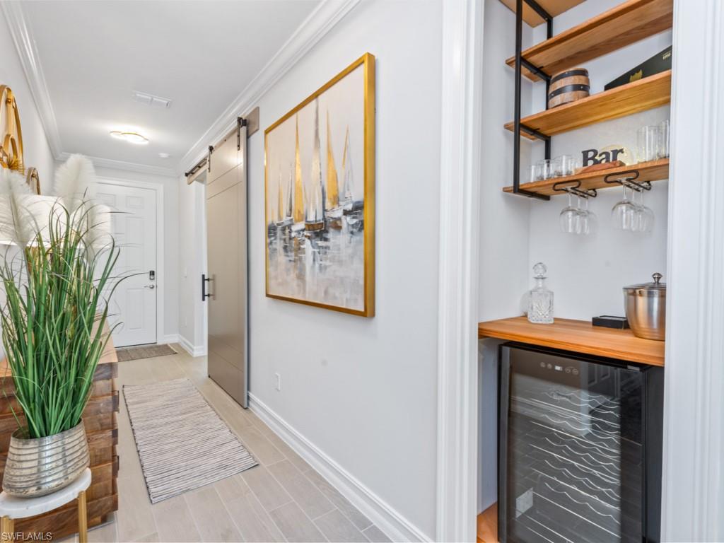 Thoughtfully designed with coveted southern rear exposure, the home is bathed in natural light throughout the day and enjoys warm breezes and glowing sunsets. Inside, the owners have added more than $17, 000 in custom enhancements that elevate both style and functionality. Features include a sophisticated built-in bar, designer-selected lighting fixtures, custom window treatments, a bespoke barn door, epoxy-coated garage flooring, and additional refined touches that set this home apart.