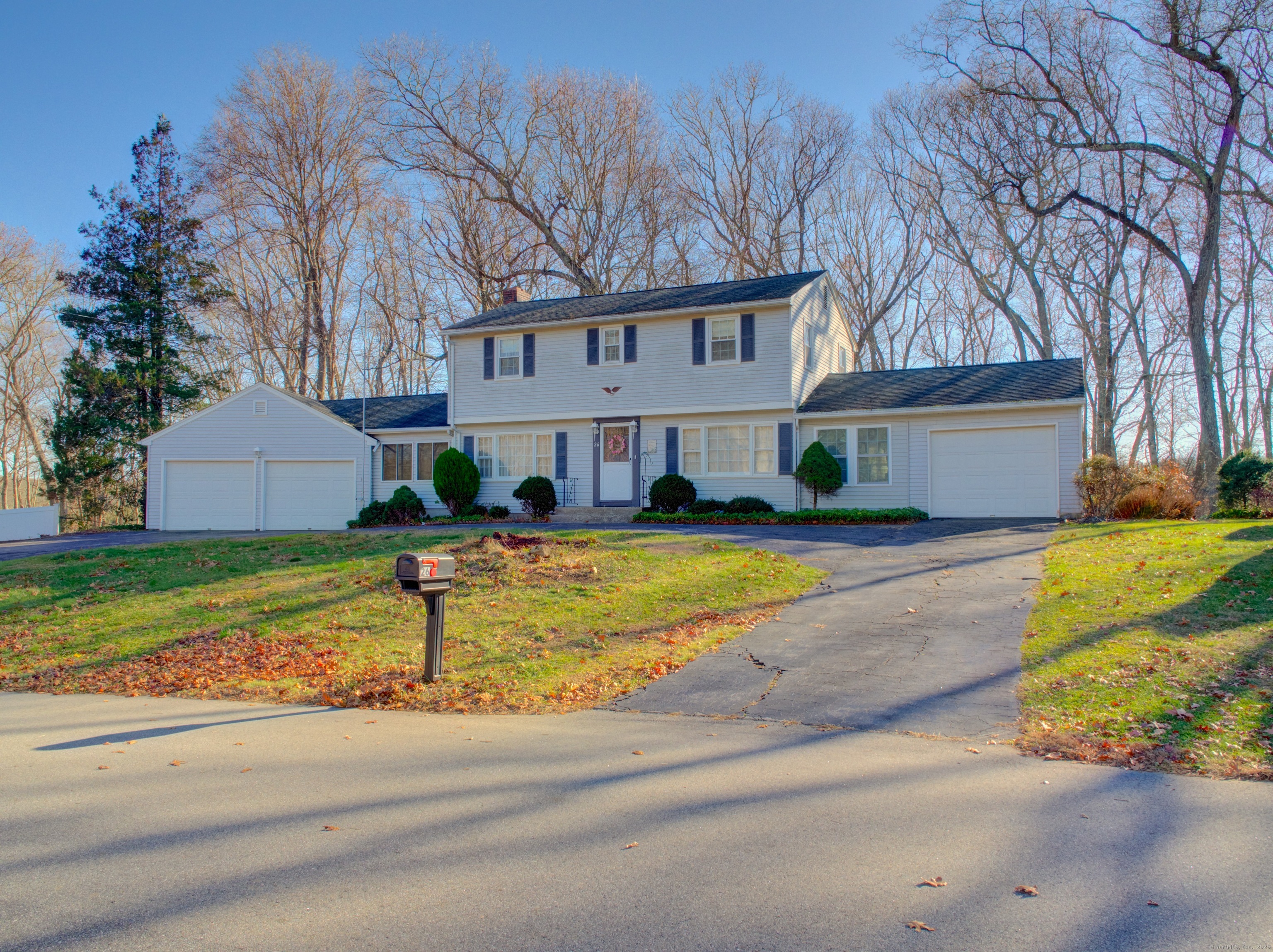 Beautifully maintained 4-bedroom, 2-bath Colonial located in the Kingswood Development on 0. 74 acres. This home welcomes you with a circular driveway and three attached garage bays. Inside, the spacious living room features a wood-burning fireplace and hardwood floors, offering a seamless flow into both the kitchen and formal dining room. A cozy family room sits just off the kitchen, and an additional flex room between the garage and living room is ready to be finished to create even more living space. The lower level is partially finished-perfect for a playroom, office, or craft area. Notable updates include electrical, central air, newer replacement windows, and public water. Step outside to enjoy a private backyard complete with a deck and patio overlooking the wooded surroundings. A wonderful property with space, comfort, and potential.