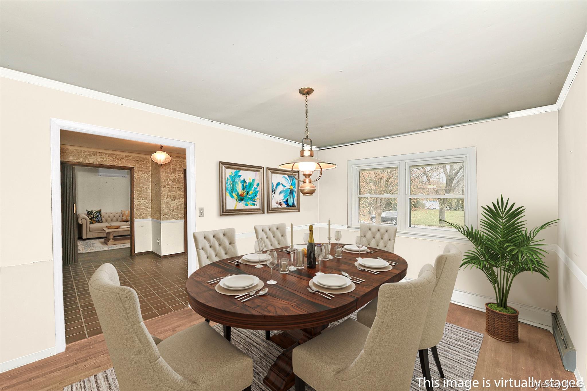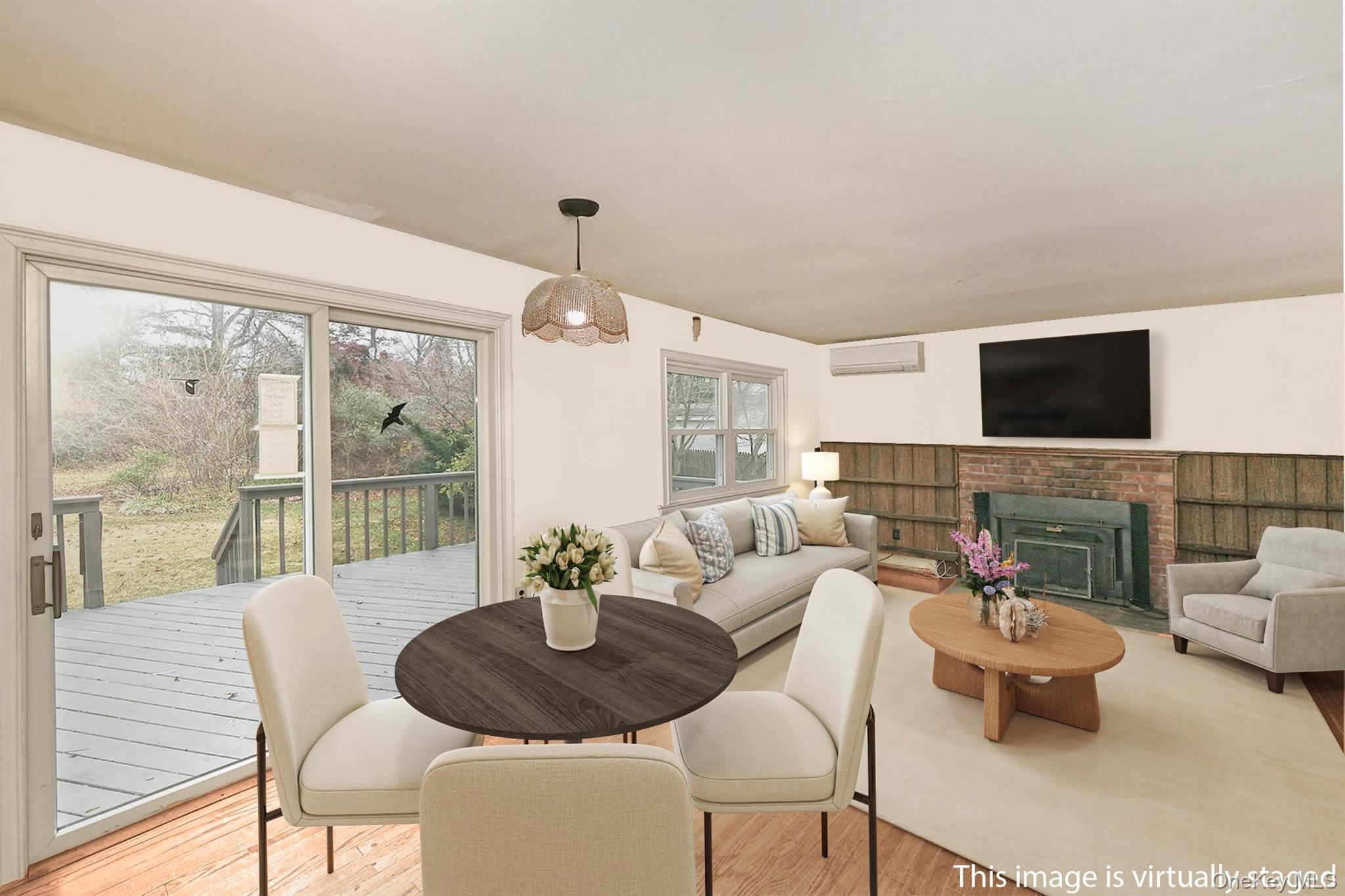 Wonderful opportunity in sought after Harborfields School District! Nestled on a wide, picturesque block, this 4-bedroom colonial offers the opportunity to create your forever home with plenty of room to grow! An oversized entry foyer greets you upon arrival, leading to the living room, dining room and kitchen with separate eating area and sliders to a beautiful and peaceful backyard. A den with a wood burning fireplace featuring a Buck Stove, a conveniently located first floor laundry area and a 1/2 bath complete the first floor. Upstairs, the expansive primary bedroom suite offers a walk-in closet and a private half bath which can easily be converted to a full bath. Three additional, spacious bedrooms and a full bath offer plenty of space for guests, or a home-office setup, while the basement provides ample storage space. Outside, enjoy the beautiful and private, flat . 50 acre yard which is perfect for entertaining or simply relaxing. Additional highlights include wood floors, mini splits, newer roof and an attached garage. Gas is on the street for an easy conversion. Located on a quiet, wide block yet close to town, parks, beaches and transportation, this home offers convenience, tremendous potential and is not to be missed!