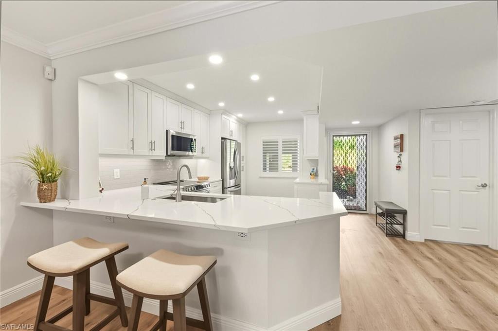 This is the one you’ve been waiting for! A rare end-unit oasis in coveted North Naples, fully updated and filled with natural light. Enjoy peaceful lake views, southern exposure, and a stylish modern interior that lives like a private retreat. The reimagined open kitchen is a showstopper—quartz counters, white wood cabinetry, pull-outs, pantry, coffee/bar station, stainless appliances, and a chef’s sink create the perfect blend of function and sophistication.