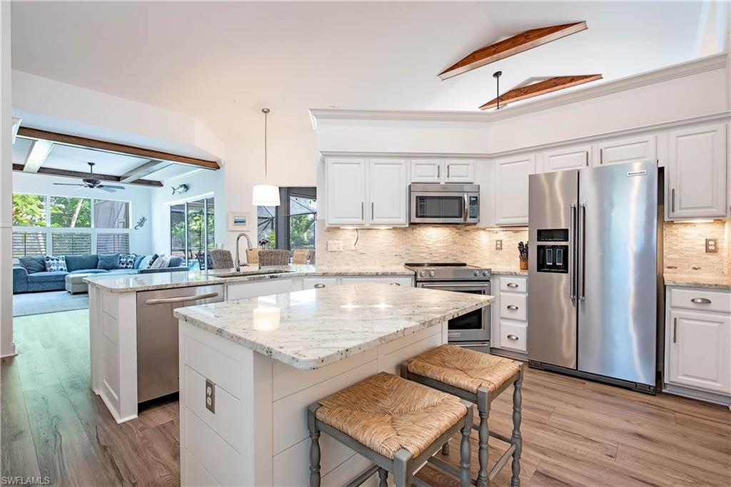 Enjoy gated community living with this completely reimagined residence in the desirable Autumn Woods community. Offering three bedrooms plus a den, two baths, and 2, 265 square feet of living space, this beautifully updated home seamlessly blends modern elegance with an unbeatable North Naples location. Recent improvements include a new roof (2021), a powerful 4-ton AC (2024), a new hot water heater (2025), updated flooring throughout, fresh interior and exterior paint, refined carpentry throughout, decorative fireplace, Bahama/Plantation shutters and custom storage cabinets in the 2 car garage (new motor 2025). You will enjoy the renovated kitchen and baths, vaulted ceilings, decorative stone entryway, impressive outdoor spaces, new paver driveway/front entry, tastefully remodeled swimming Pool and Spa, expansive sun exposed pool deck for entertaining, thoughtful landscaping and beautiful lake view. Set within a community renowned for its top-rated Collier County schools, Autumn Woods boasts two pools, tennis and pickleball courts, clubhouse fitness center, and 26 acres of pristine preserves with scenic walking trails. Conveniently located just two miles from the white sand beaches and moments from Naples’ finest shopping and dining, this exceptional home offers a rare opportunity to experience quality, location, and lifestyle at its finest.